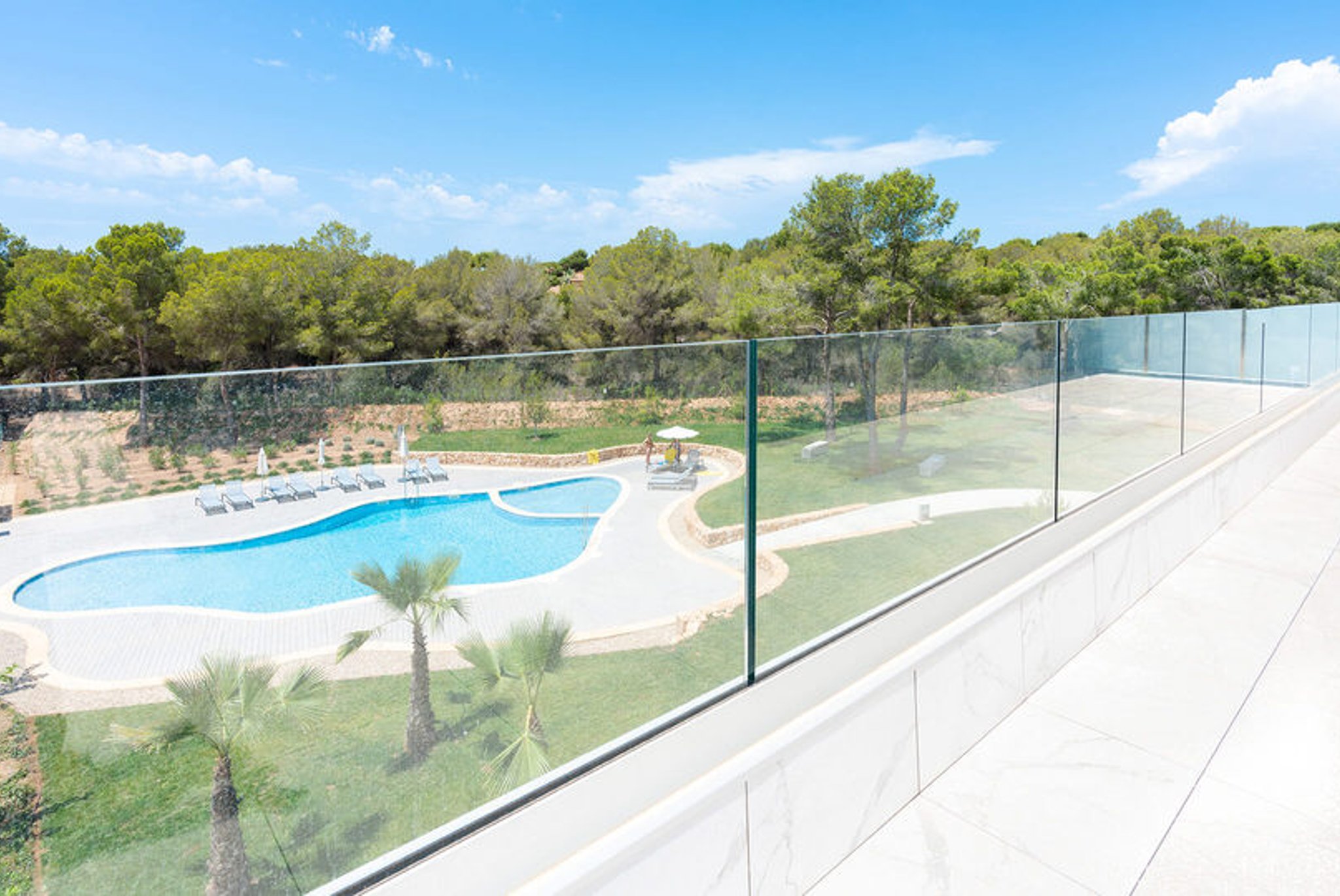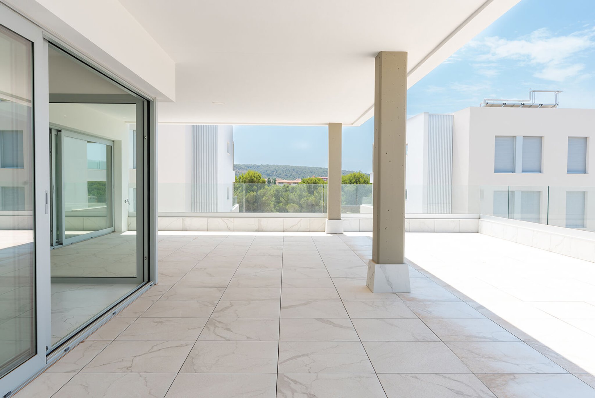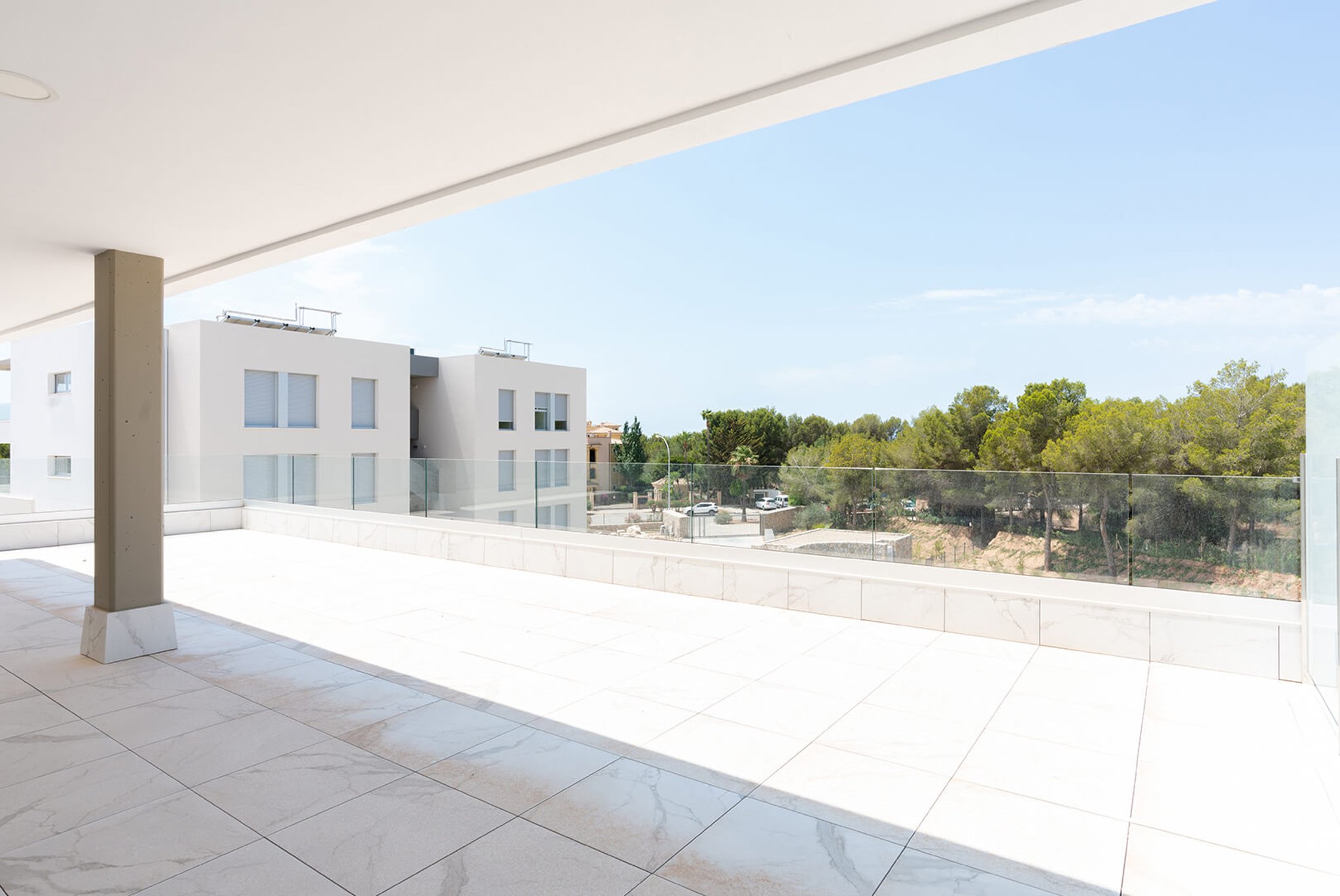 Bostaden är rymlig, ljus och har en boyta på 122 m2 som består av 3 sovrum, 2 badrum, varav ett en suite, ett fullt utrustat kök samt ett väldigt stort vardagsrum som har utgång till den härliga stora privata terrassen. Terrassen, som är på 87 m2, vätter mot sydväst och erbjuder sol i stort sett hela dagen. Det finns även en täckt del av terrassen där man har skugga hela dagen . På området finns två gemensamma pooler och en härlig stor gemensam trädgård. I priset ingår en garageplats och ett förrådsutrymme. Utmärkt val av bostad för den som vill ha tillgång till flertalet golfbanor, vackra stränder och exklusiva hamnar. Palma ligger bara 20 minuter bort med bil.
