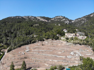 Det här är ett projekt från 2018, där resultatet kommer att ses i början av hösten – de gröna linjerna av vinrankor kommer att pryda terrasserna. Första steget var att röja bort skog och ta fram terrasserna där pinjeträden hade tagit över. Sedan förbereddes jorden och man planterade vinrankor. Slutligen installerades ett bra bevattningssystemUnder de senaste åren har vinindustrin på Mallorca utvecklats med stor framgång. Mallorkinskt vin blir allt populärare runtom i världen.