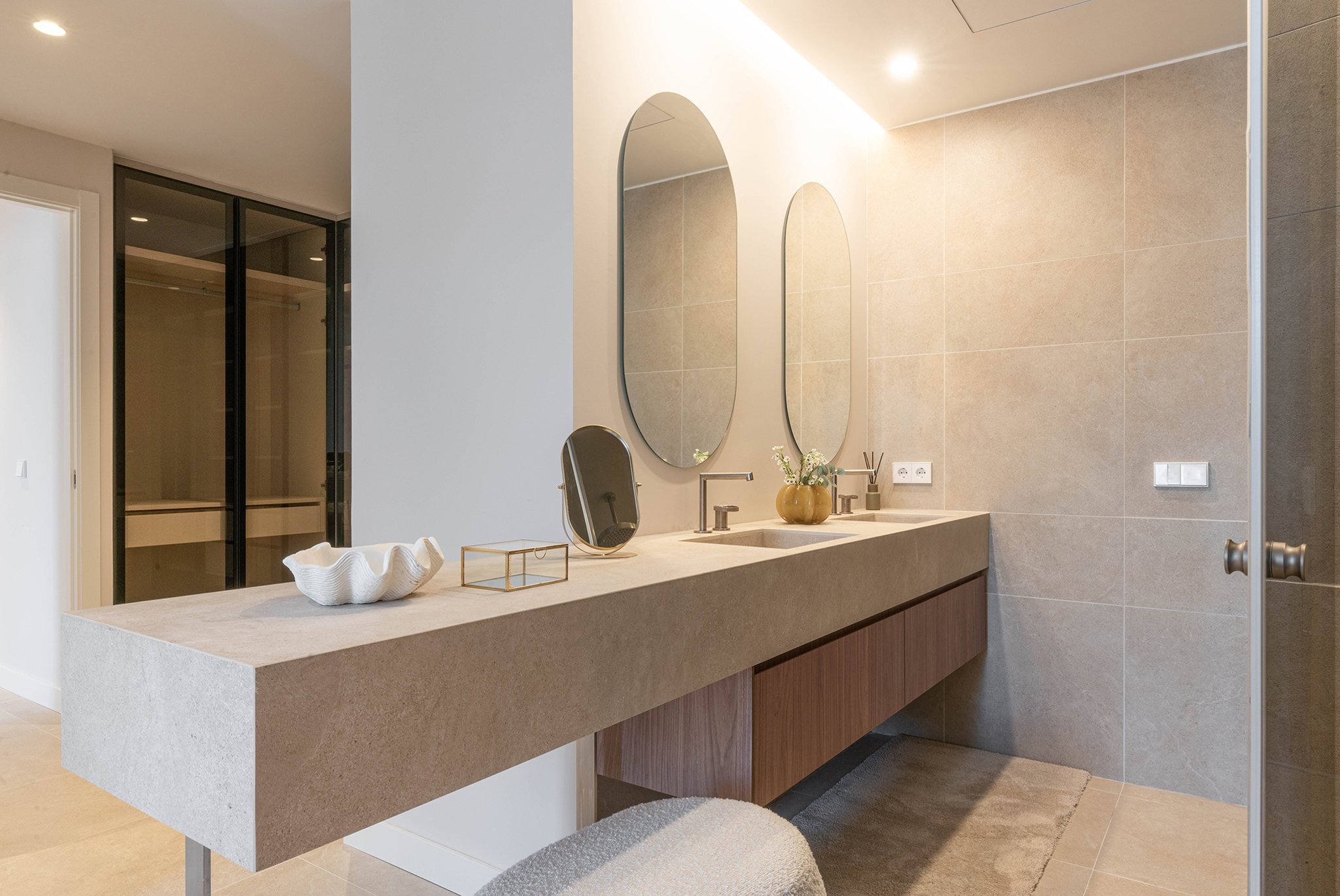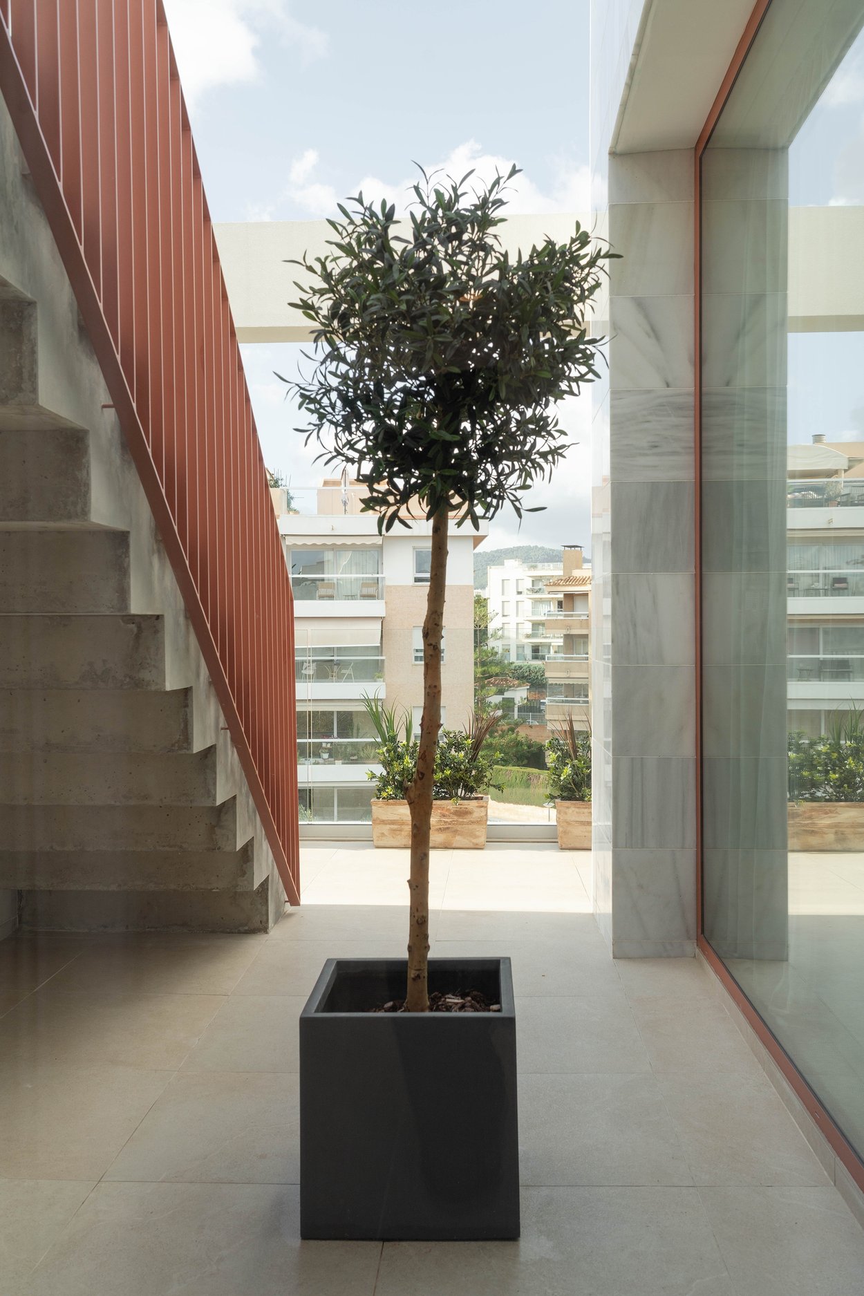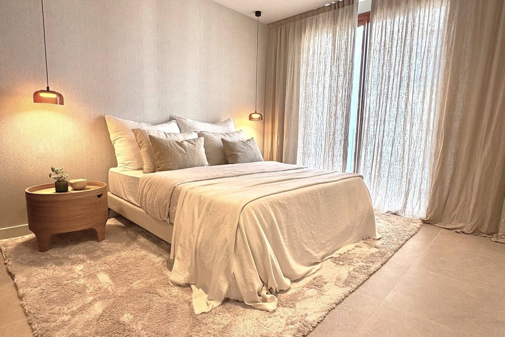 Der architektonisch ansprechend gestaltete Komplex mit teilweise begrünter Fassade, und der Gemeinschaftspool und die Sonnenterrasse sowie der Fitnessbereich im Freien bieten eine einladende Atmosphäre für die Bewohner. Diese Penthouse-Wohnung besteht aus 3 Schlafzimmern und 2 Badezimmern, eines davon ist ein Bad en-suite. Das Penthouse verfügt über eine 45 m2 große Terrasse auf der gleichen Ebene und eine private 100 m2 große Dachterrasse. Das Apartment wurde mit einer Kombination aus natürlichen Materialien wie Stein, Beton und Glas gestaltet, wodurch ein anspruchsvolles und modernes Interieur entsteht. Große, vom Boden bis zur Decke reichende Fenster sorgen für viel natürliches Licht, mit offenen Wohn- und Essbereichen, die sich nahtlos in die großzügigen Terrassen und integrierten Küchen einfügen. Das Apartment ist mit Klimaanlage und Fußbodenheizung ausgestattet, die das ganze Jahr über für ein angenehmes Wohnklima sorgen.