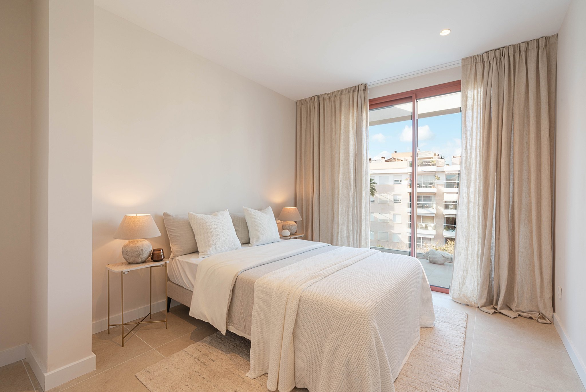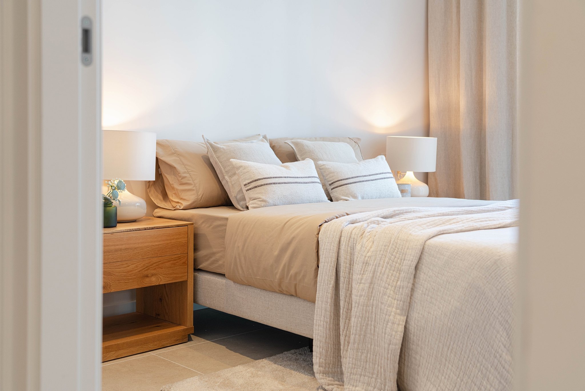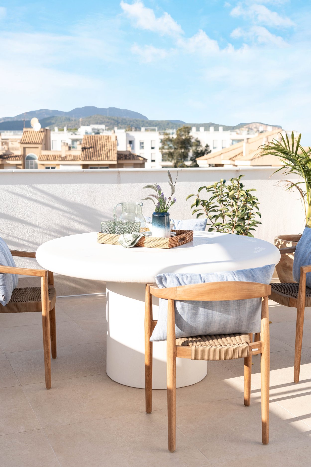 Der architektonisch ansprechend gestaltete Komplex mit teilweise begrünter Fassade, und der Gemeinschaftspool und die Sonnenterrasse sowie der Fitnessbereich im Freien bieten eine einladende Atmosphäre für die Bewohner. Diese Penthouse-Wohnung besteht aus 3 Schlafzimmern und 2 Badezimmern, eines davon ist ein Bad en-suite. Das Penthouse verfügt über eine 45 m2 große Terrasse auf der gleichen Ebene und eine private 100 m2 große Dachterrasse. Das Apartment wurde mit einer Kombination aus natürlichen Materialien wie Stein, Beton und Glas gestaltet, wodurch ein anspruchsvolles und modernes Interieur entsteht. Große, vom Boden bis zur Decke reichende Fenster sorgen für viel natürliches Licht, mit offenen Wohn- und Essbereichen, die sich nahtlos in die großzügigen Terrassen und integrierten Küchen einfügen. Das Apartment ist mit Klimaanlage und Fußbodenheizung ausgestattet, die das ganze Jahr über für ein angenehmes Wohnklima sorgen.
