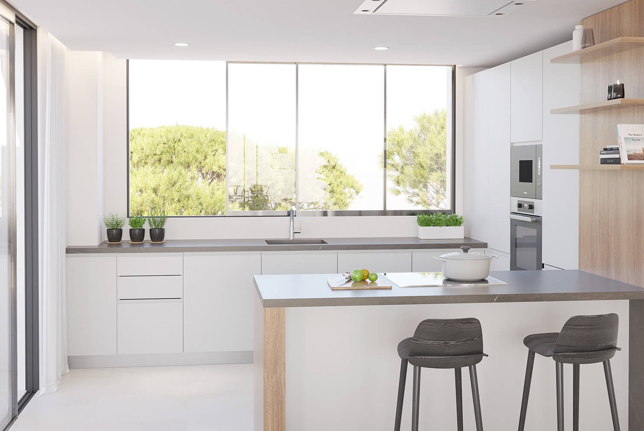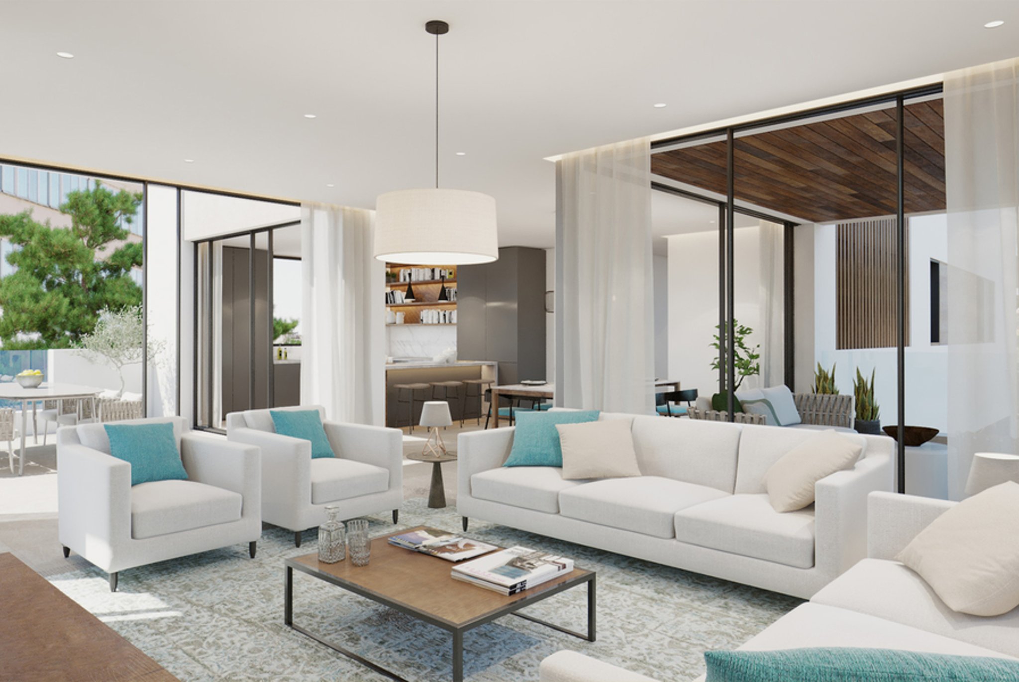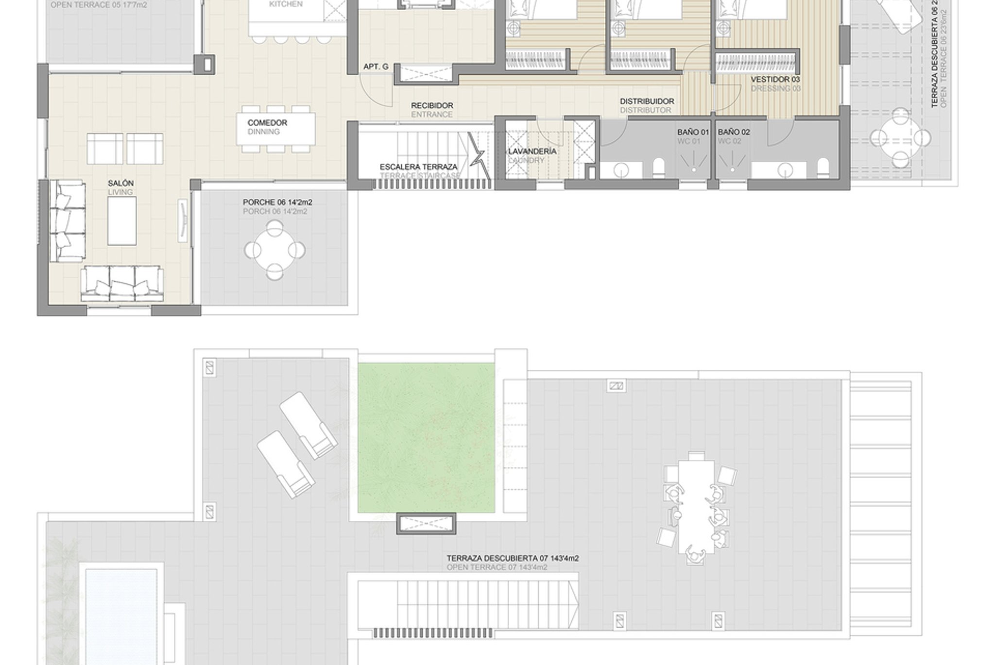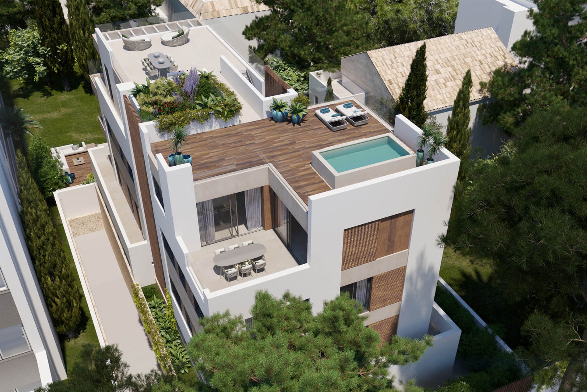 Dies ist ein fantastisches Penthouse mit privater Dachterrasse mit Pool, Grill und Loungebereich mit grünen Pflanzen. Die 144 m2 Wohnfläche verteilt sich auf 3 Schlafzimmer und 2 Badezimmer, von denen eines en-suite ist. Die voll ausgestattete Küche ist perfekt mit dem Wohnzimmer verbunden, von wo aus Sie zwei der drei Terrassen auf derselben Ebene erreichen. Auf dem Dach können Sie die 143 m2 große private Dachterrasse genießen, die auf Wunsch des Kunden mit einem Nebelverdampfer für heiße Sommertage ausgestattet werden kann. Es gibt Fußbodenheizung in der gesamten Wohnung sowie eine Klimaanlage. 2 Tiefgaragenstellplätze und ein Abstellplatz sind im Preis inbegriffen.