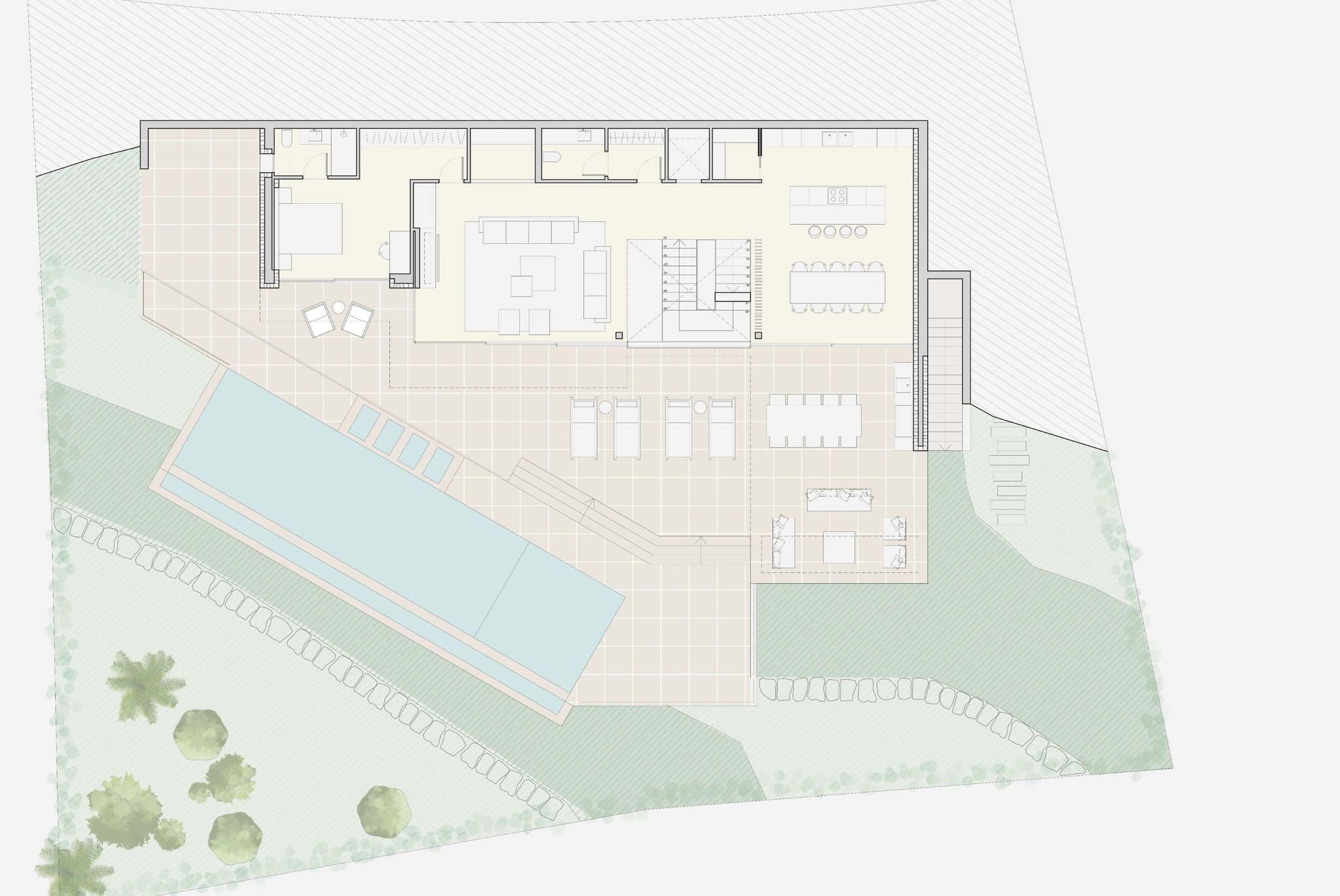 Nedenunder venter et eksklusivt soveværelse med eget badeværelse samt et generøst køkken og stue i åbent plan, fuldt udstyret med topmoderne apparater og skræddersyede møbler. Den elegante stue er badet i naturligt lys takket være de store panoramavinduer, som slører grænsen mellem inde og ude. Herfra er der adgang til den store terrasse med infinity-pool og magisk panoramaudsigt.