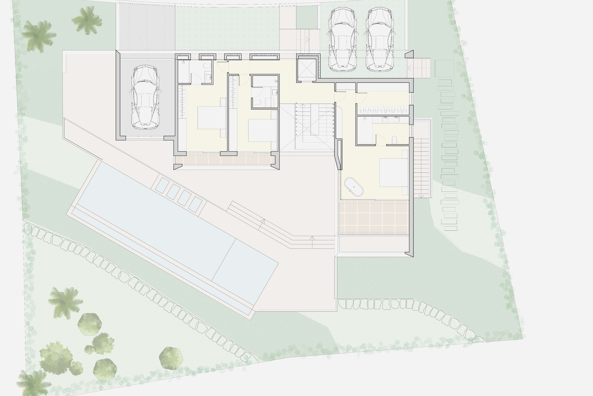 I stueetagen bydes du velkommen af en rummelig gang, der fører til tre sofistikerede soveværelser, alle med en-suite badeværelser og private terrasser med havudsigt. Her er du omgivet af førsteklasses materialevalg, fra eksklusive sten- og trægulve til skræddersyede indretningsdetaljer.