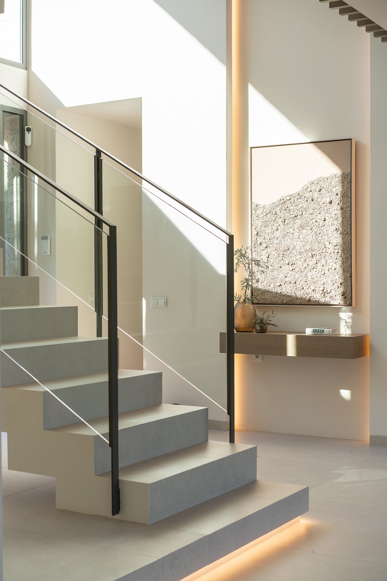 The spacious house has recently been completed and offers a living area of 332 m2 with 4 bedrooms and 3 bathrooms distributed over two floors. The materials and the equipment used are of high-end quality such as kitchen and cabinets from Poliform, underfloor heating and a saltwater pool. You enter the house into a welcoming, bright entrance with high ceilings. To your left, is the fully equipped open kitchen with a large kitchen island located and with amazing views to the garden and pool area overlooking the Bellver Castle. To your right is the living room located with floor to ceiling windows flooding the room with natural light. Three of the bedrooms are located on this level, one of them with bathroom en-suite and the other two share a bathroom with a large shower. All of the rooms have access to the beautiful garden and pool area with a saltwater pool, BBQ-area and plenty of space to enjoy al fresco but covered and uncovered. You will also find a laundry room, guesttoilet and plenty of storage space on this level.