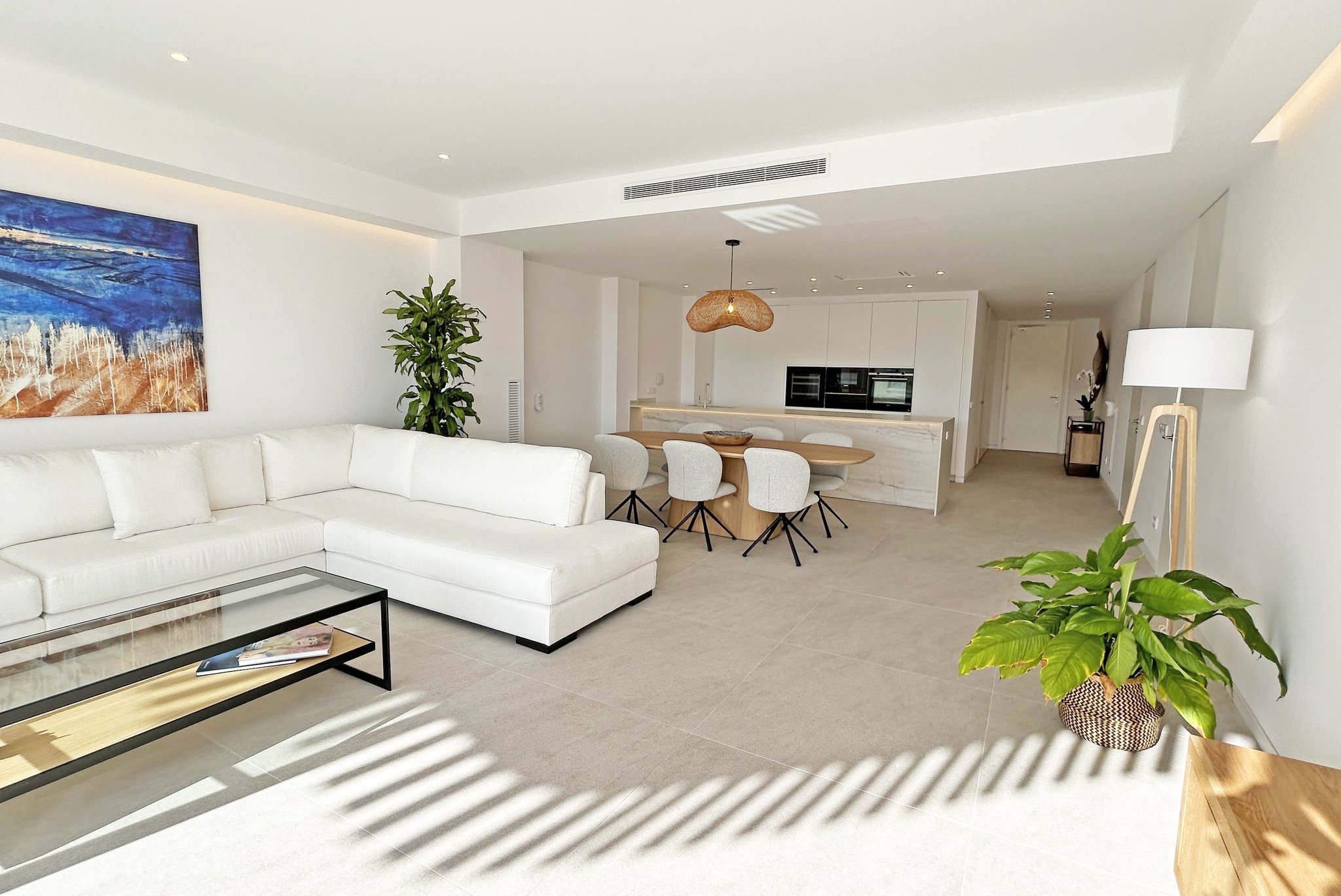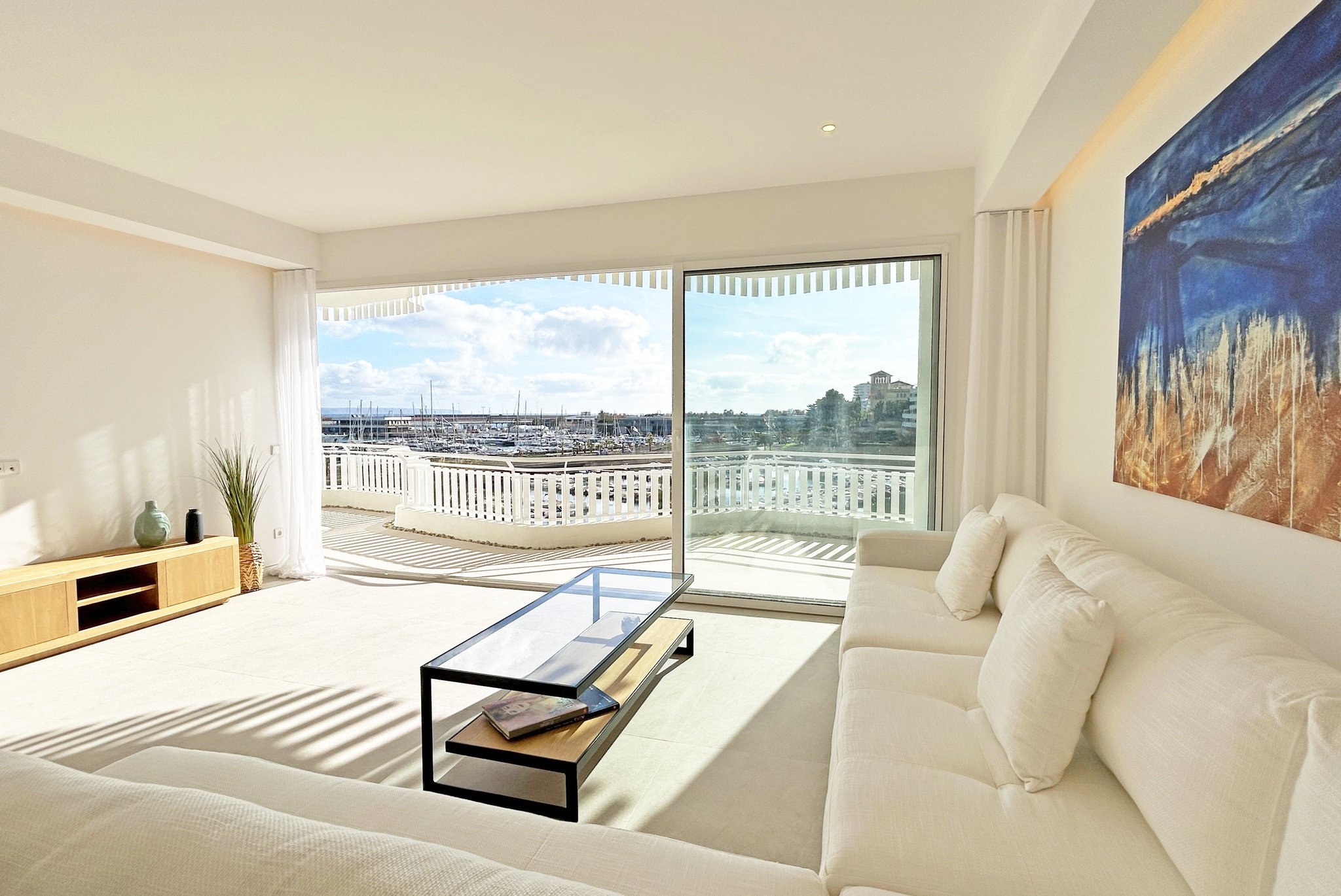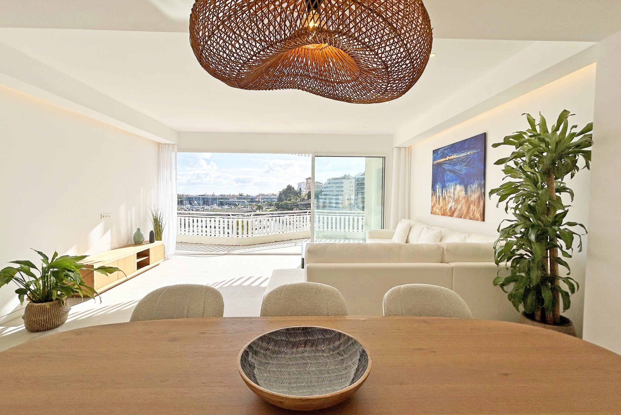 Boligen har åben panoramaudsigt over havet og marinaen. Hjemmets centrum er en imponerende stue og spisestue på 60 m² med integreret køkken, udformet som et lyst og sofistikeret opholdsrum. Boligen rummer tre soveværelser og tre moderne badeværelser, hvoraf ét en suite, alle udført i materialer af høj kvalitet.
