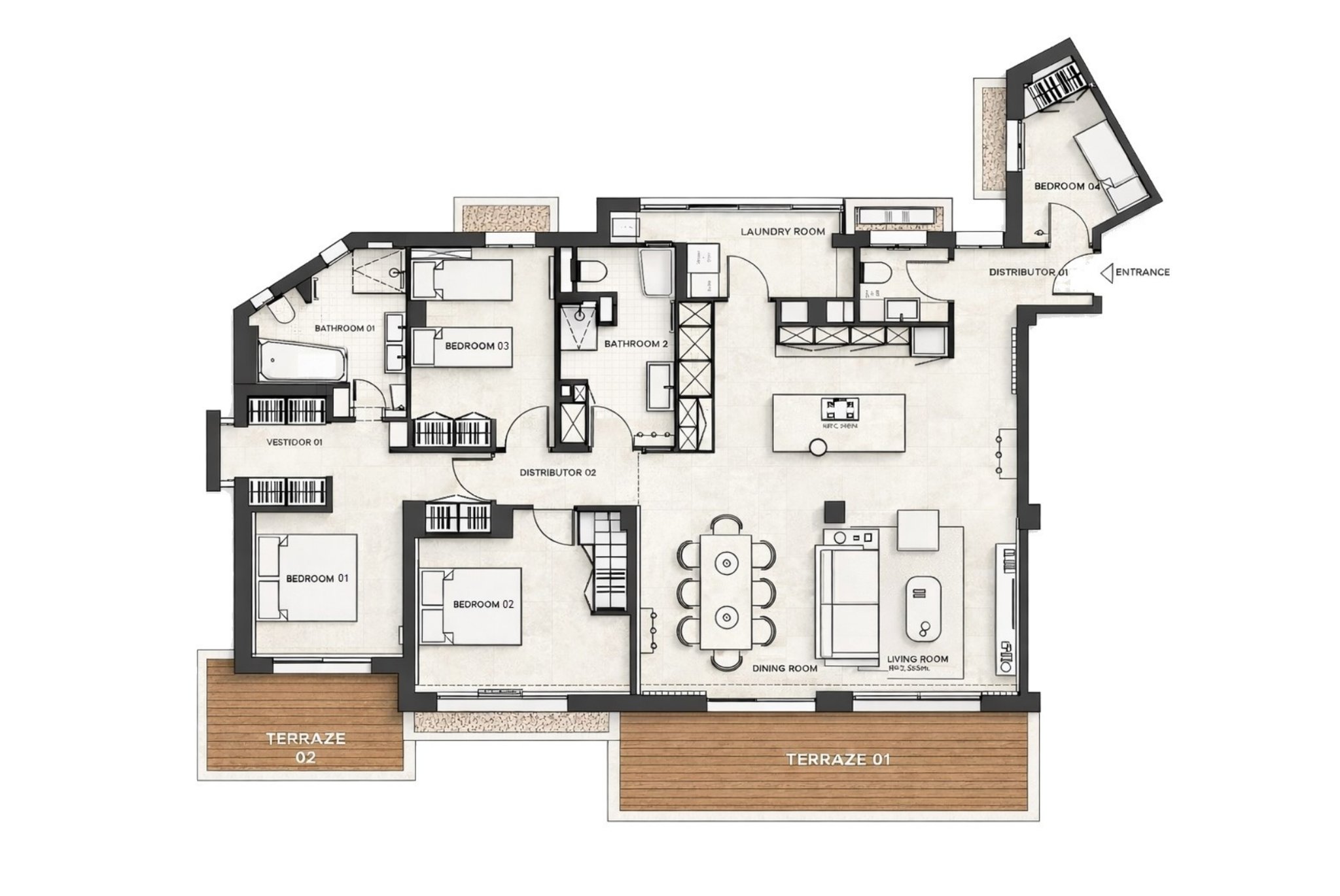 The residence offers a total of 130 m². The modern kitchen with an island features an open-plan layout connecting to the living room and dining area, from which you can access the largest of your terraces, measuring 14 m². Here, you can enjoy stunning views of the beach and sea with friends and family.