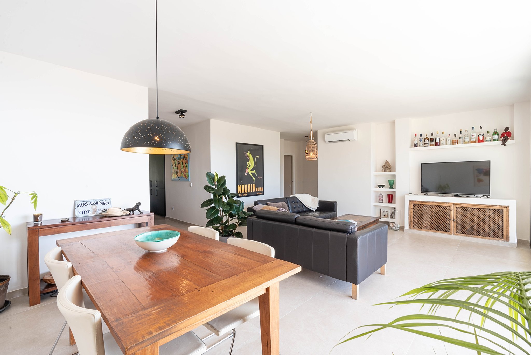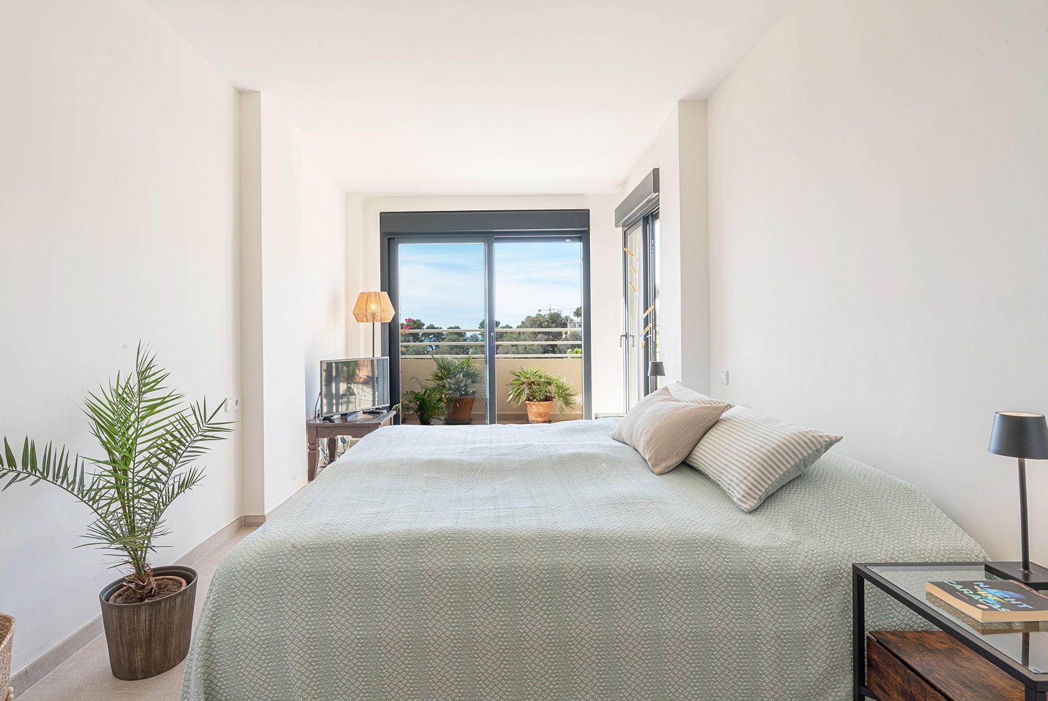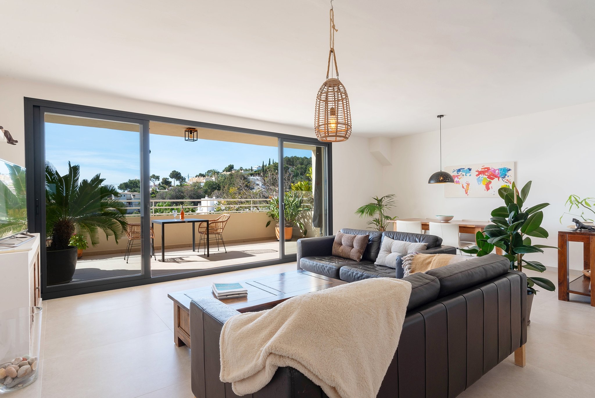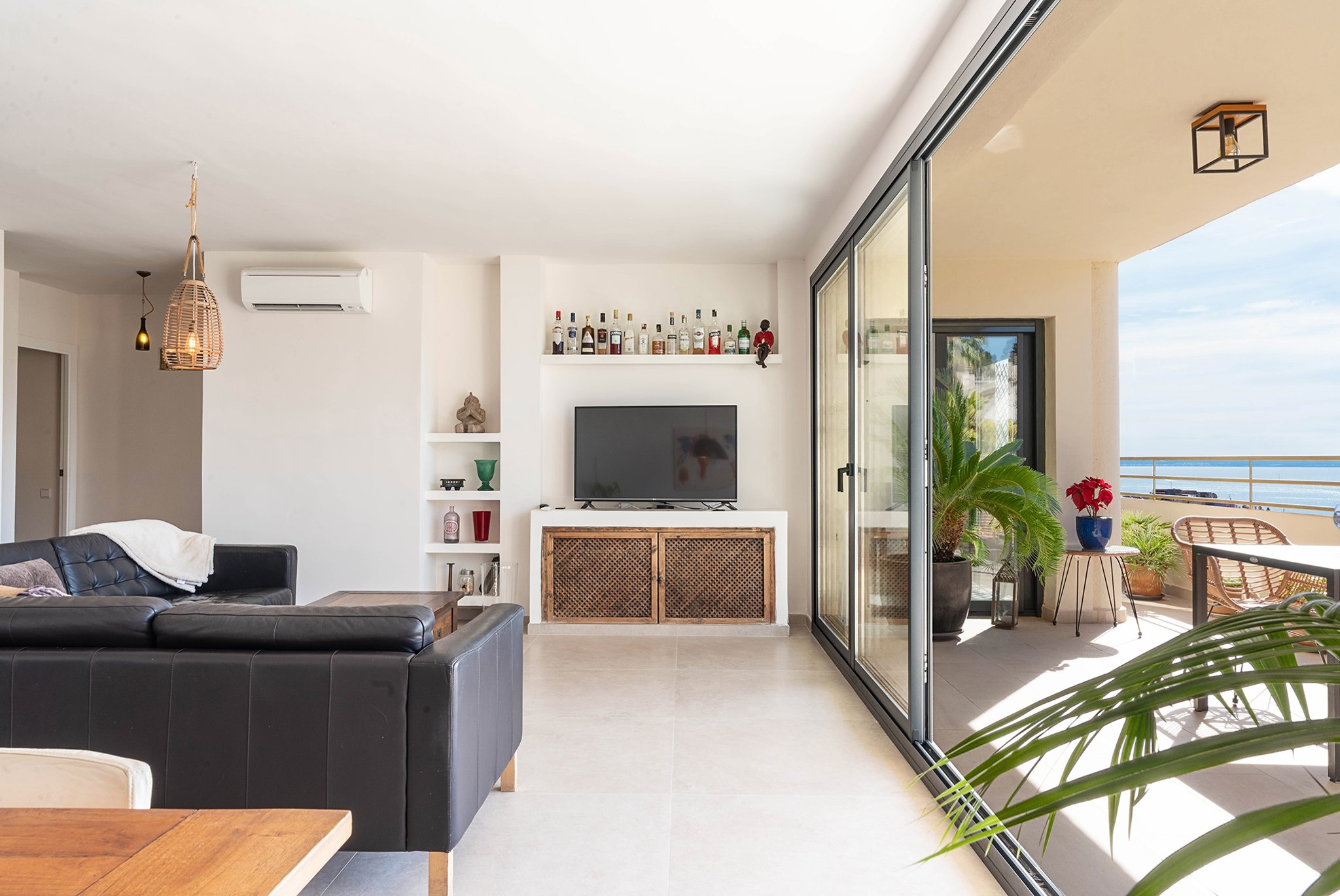 The property has a living area of 90 m2 plus a 24 m2 terrace. The apartment features a spacious living area, a dining space seamlessly integrated with an open-plan kitchen, a master bedroom with an en-suite bathroom, and two additional bedrooms sharing a separate bathroom.  The living room and dining area have direct access to the large sunny terrace with plenty of space for a large dining table and sun loungers.