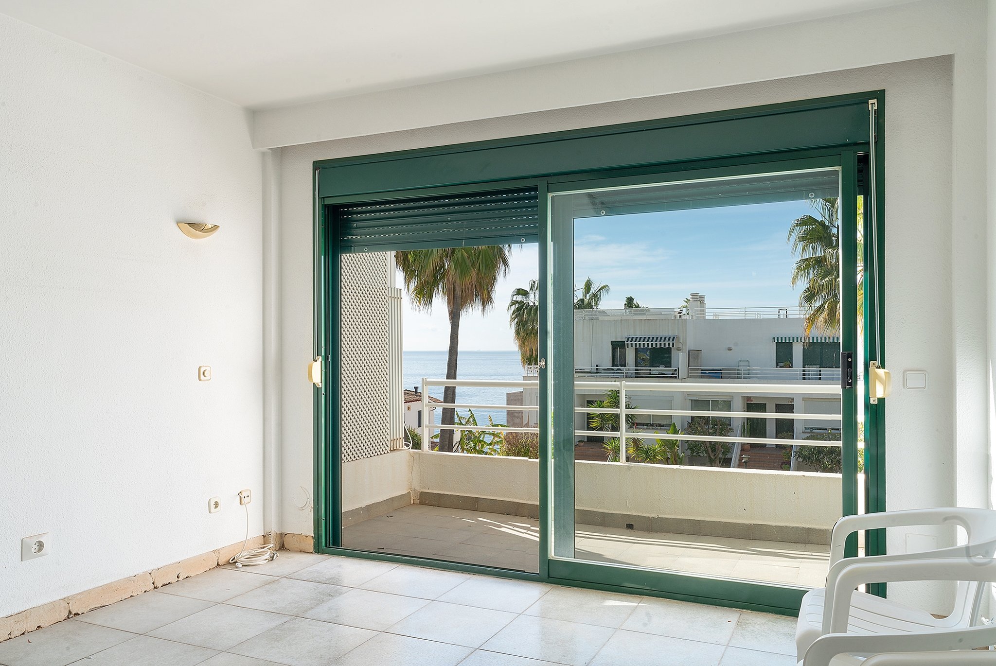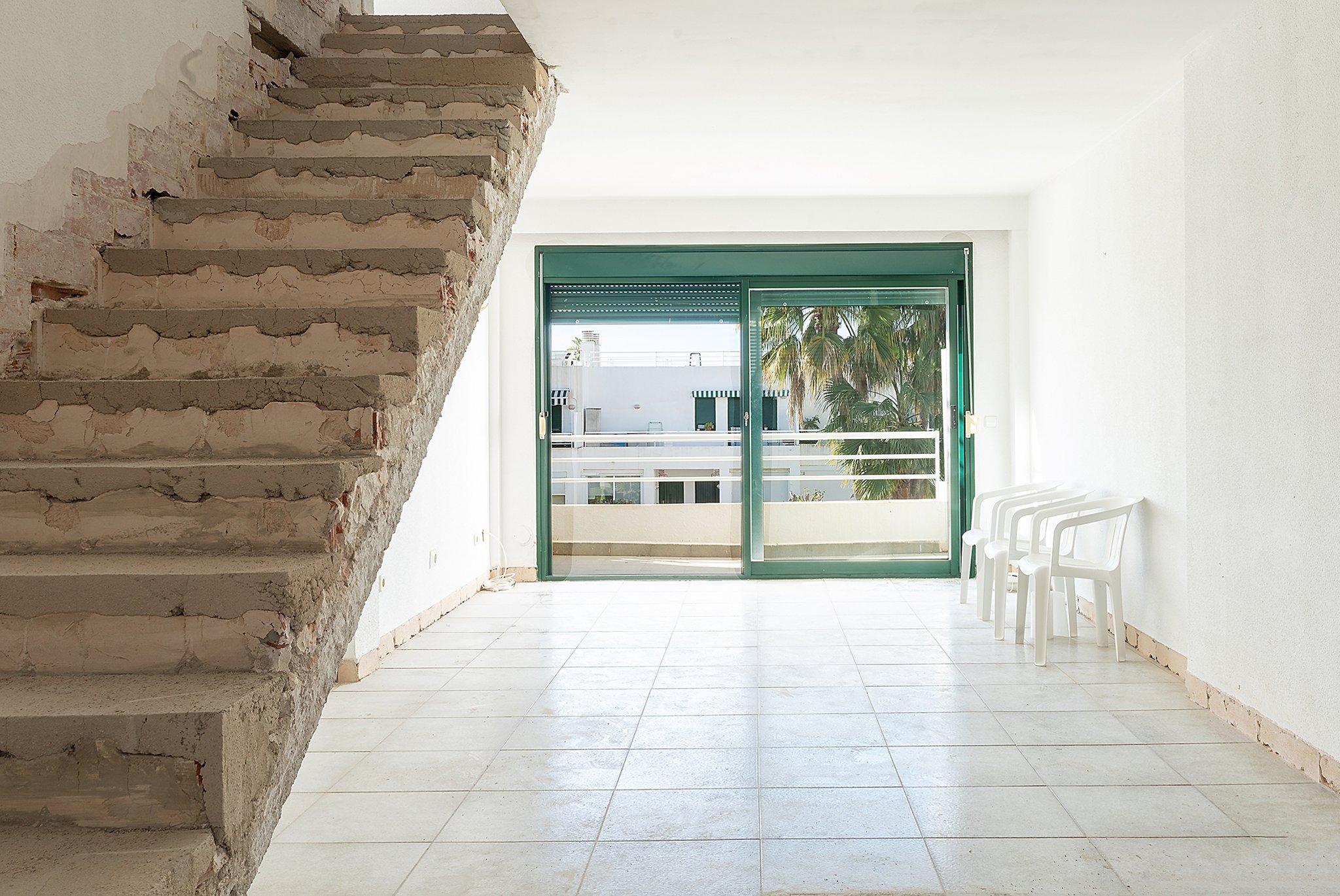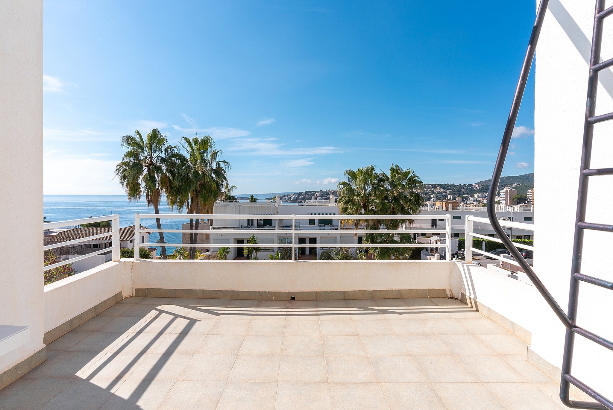 Bright duplex apartment with 2 terraces to renovate. On the lower level, the space is perfect to design the open-plan kitchen and living room to take advantage of the light coming in from both sides. The smaller balcony, with sea views, is perfect for the morning coffee, or why not enjoy a glass of wine during Mallorca's pleasant summer evenings. Upstairs we find 3 bedrooms. A large one with bathroom en-suite, another double bedroom and a smaller bedroom that is perfect as a guest room or office. Here is also the larger terrace that offers sea views and views of the pool. With the right renovation, this can become an incredibly attractive apartment with proximity to both the sea and the city. The apartment includes a private garage in a neighbouring building.