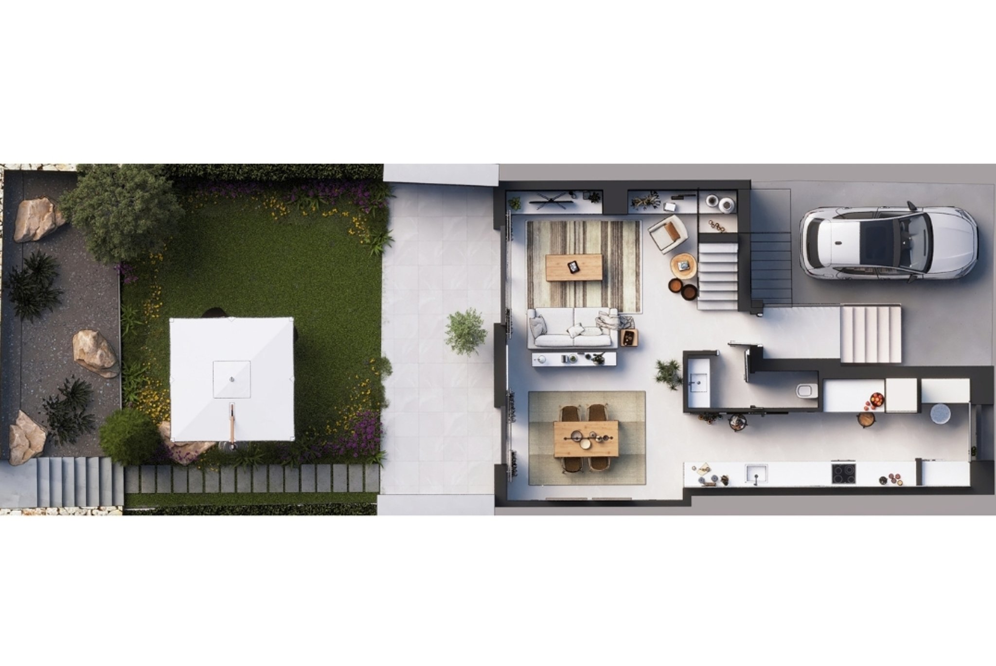 Each home has a living area between 142 to 158 m2, featuring a bright and spacious living/dining area, a fully equipped kitchen with high-end Siemens appliances, and large, south-west facing terraces that extend into private gardens. The ground floor hosts a welcoming hall with ample storage, a guest toilet, and access to a generous terrace that invites natural light into the living spaces. Upstairs, three bedrooms and two bathrooms (one en-suite) offer comfort and privacy, with one bedroom opening onto a 12 m2 balcony.