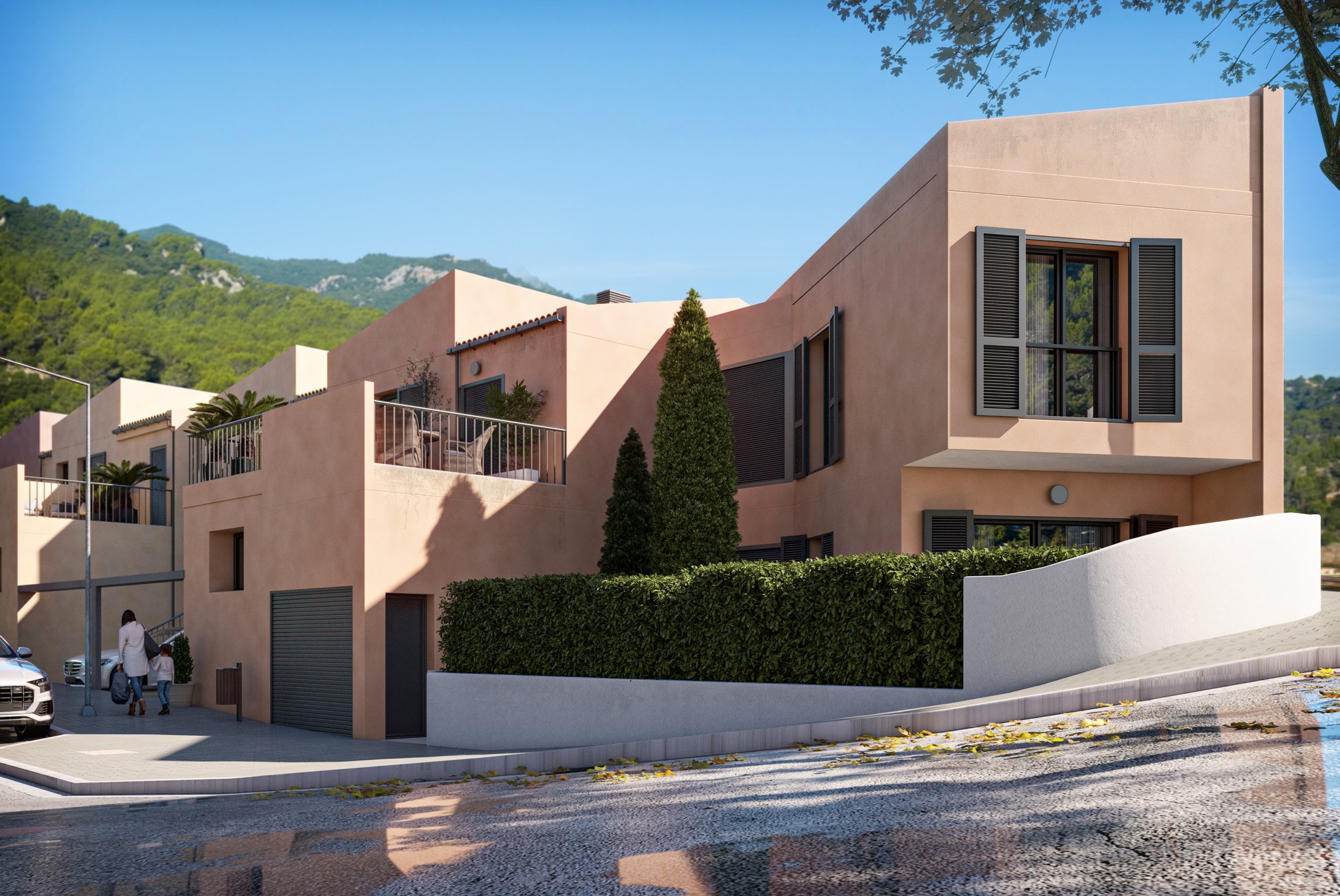 Located in Esporles, a picturesque village in the heart of the Tramuntana Mountains, these 13 two-storey townhouses present a perfect blend of traditional charm and modern amenities. Surrounded by historic villas and lush gardens, this development offers a serene and scenic living experience.