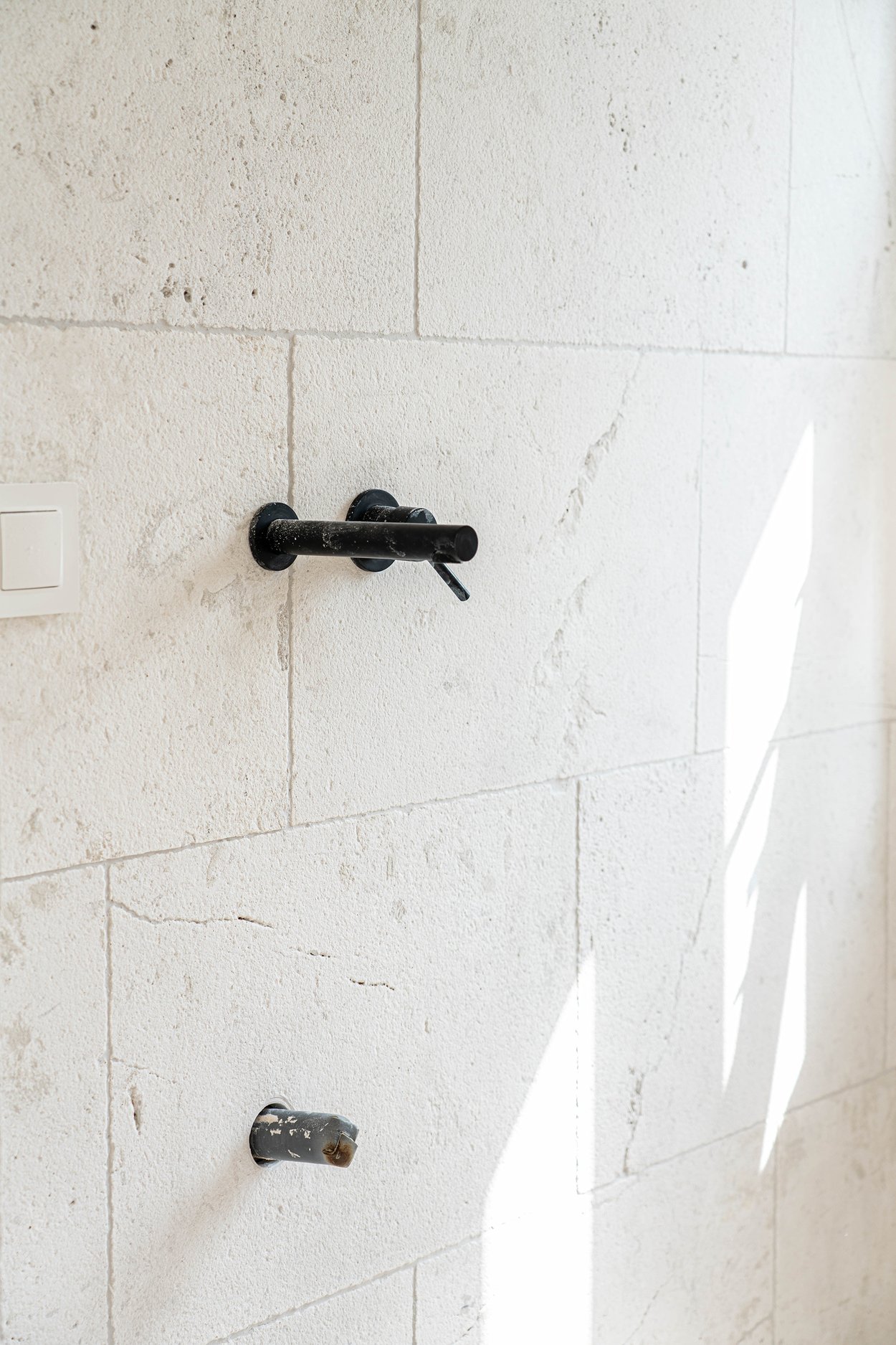 The interior features beautiful natural materials such as rustic stone and exposed wooden beams. Large windows throughout the home allow for plenty of natural light, enhancing the bright and airy feel of the house.