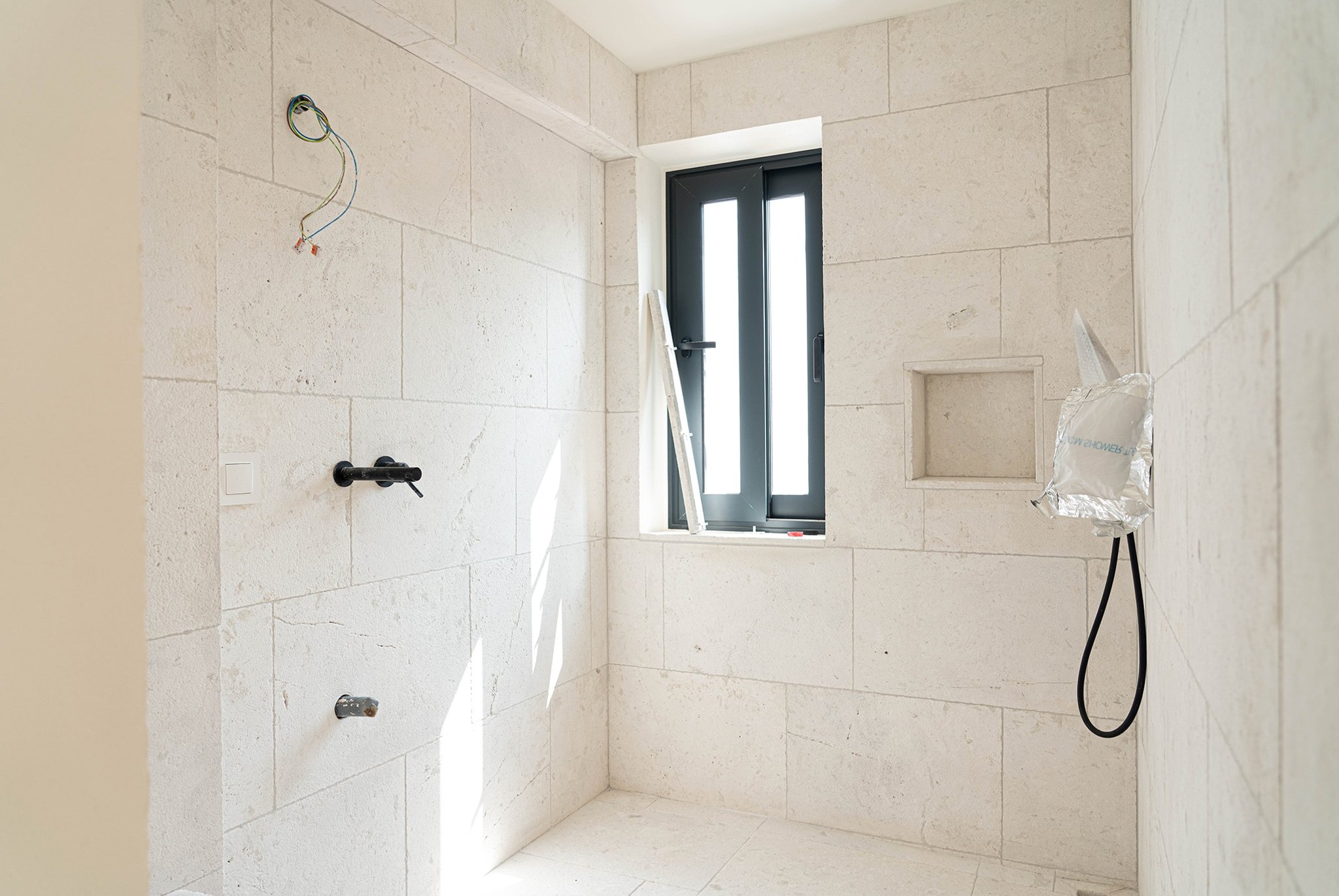 The property offers a living area of approximately 141 m², distributed over two well-designed floors, with three bedrooms and three bathrooms, two of which are en-suite and one guest toilet. The open-plan layout between the spacious kitchen and the living room, complete with a built-in fireplace, creates a warm and inviting atmosphere. From the living area, you step out onto a private west facing terrace with plenty of space and a small pool.