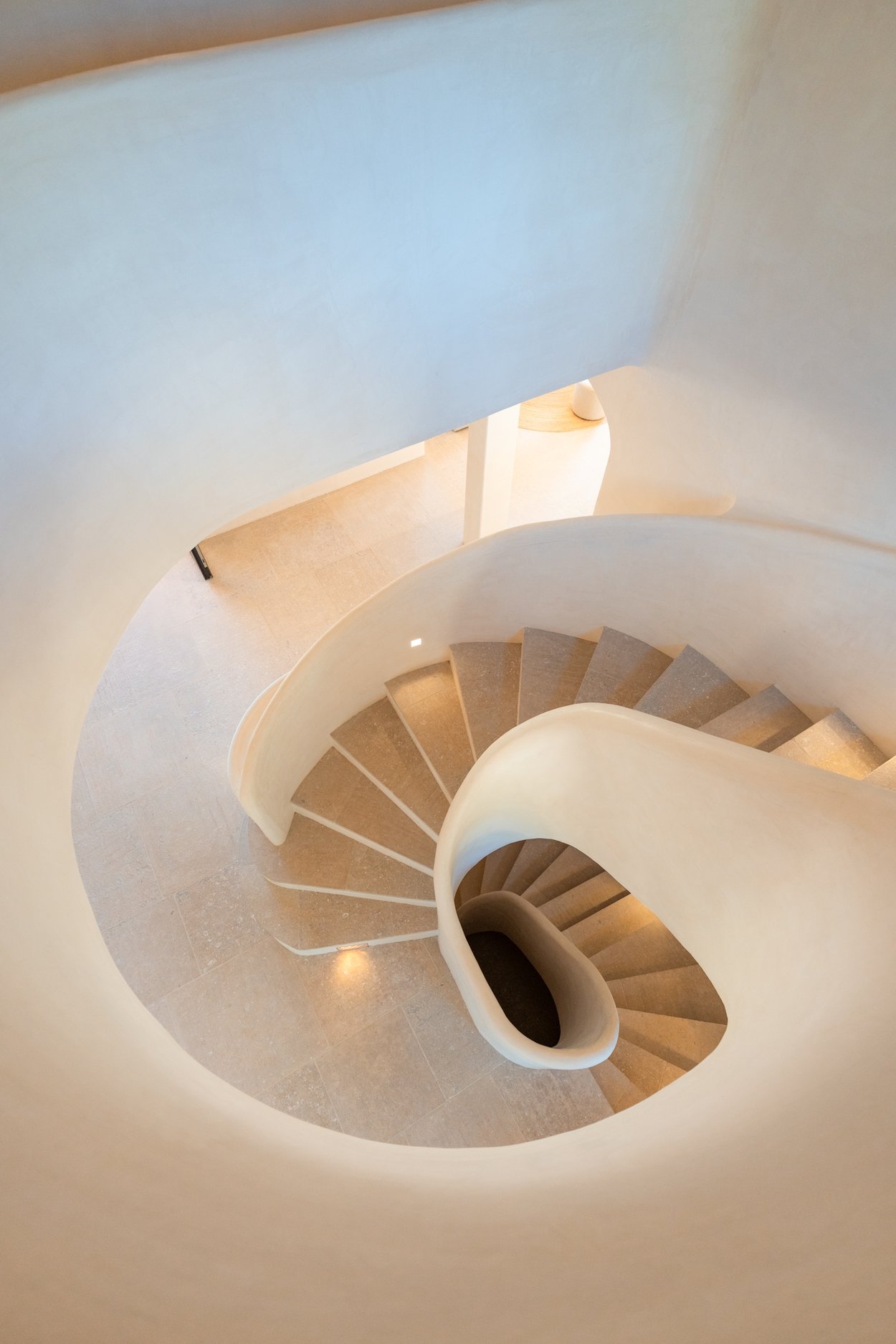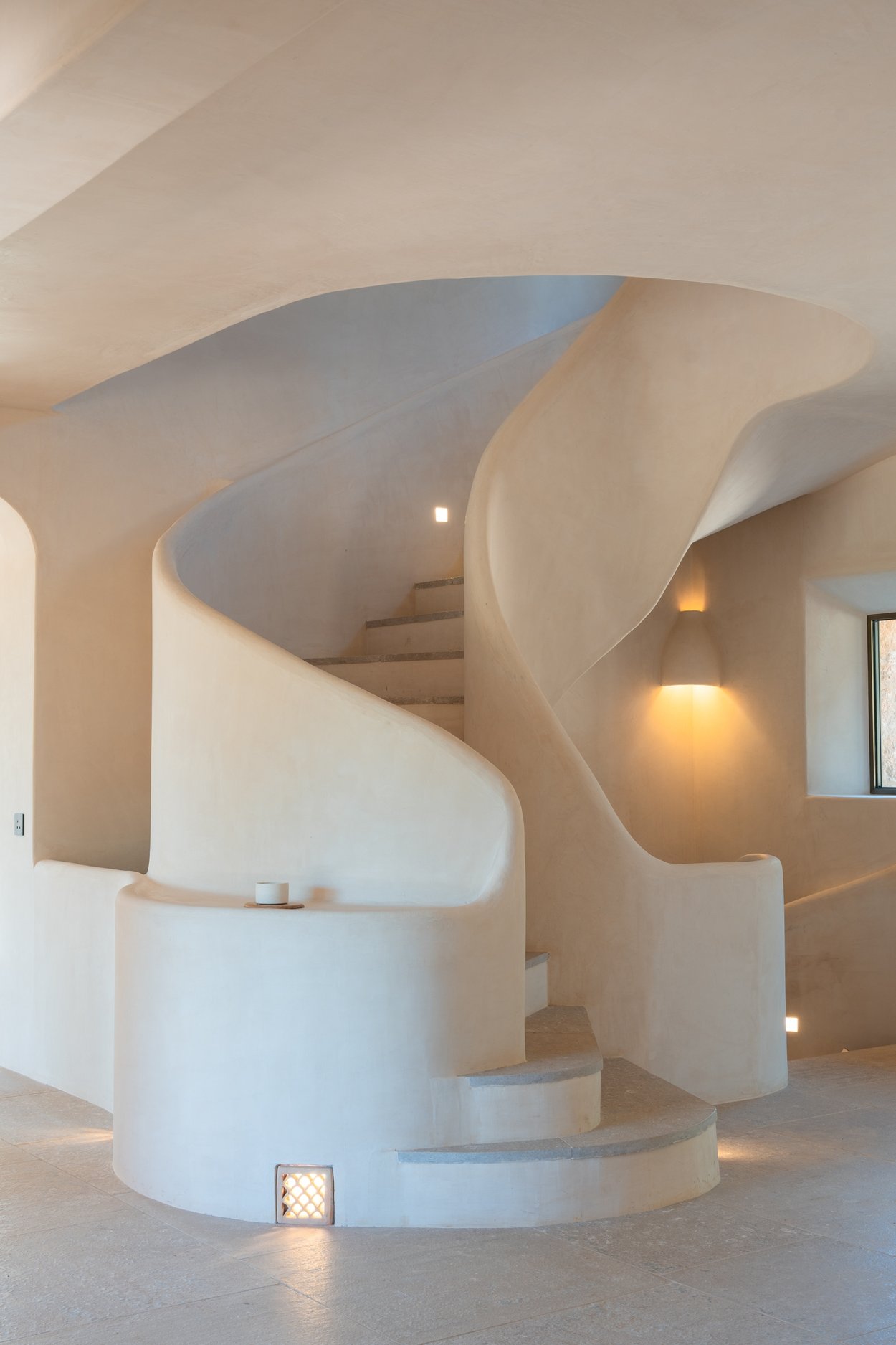 The house is distributed over two floors and a basement, with a total built area of over 678 m². It has been designed with soft, organic shapes and natural materials, creating a timeless and elegant home that blends naturally with its surroundings. Large windows and open spaces allow plenty of light to flow through the house and create a seamless connection between indoor and outdoor living.