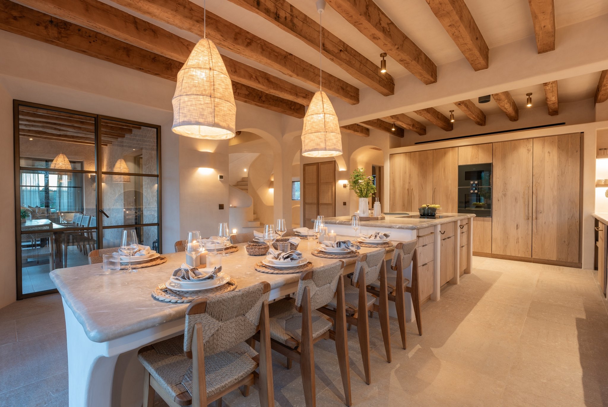 On the ground floor, you will find a spacious living and dining area, a fully equipped kitchen, a guest toilet and an additional lounge that can be used as a TV room or home cinema. From here, you have direct access to large terraces, the garden and the pool area, perfect for relaxing and entertaining.