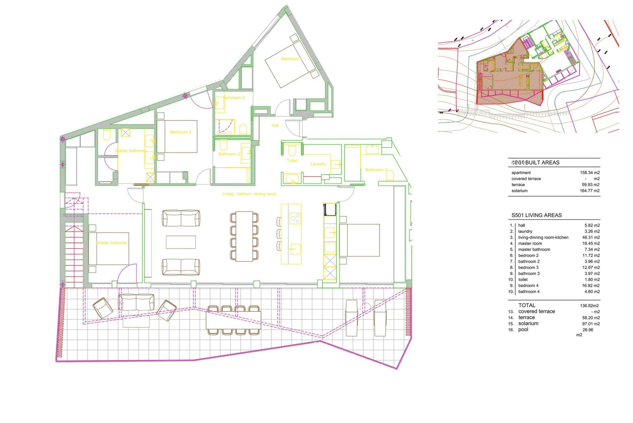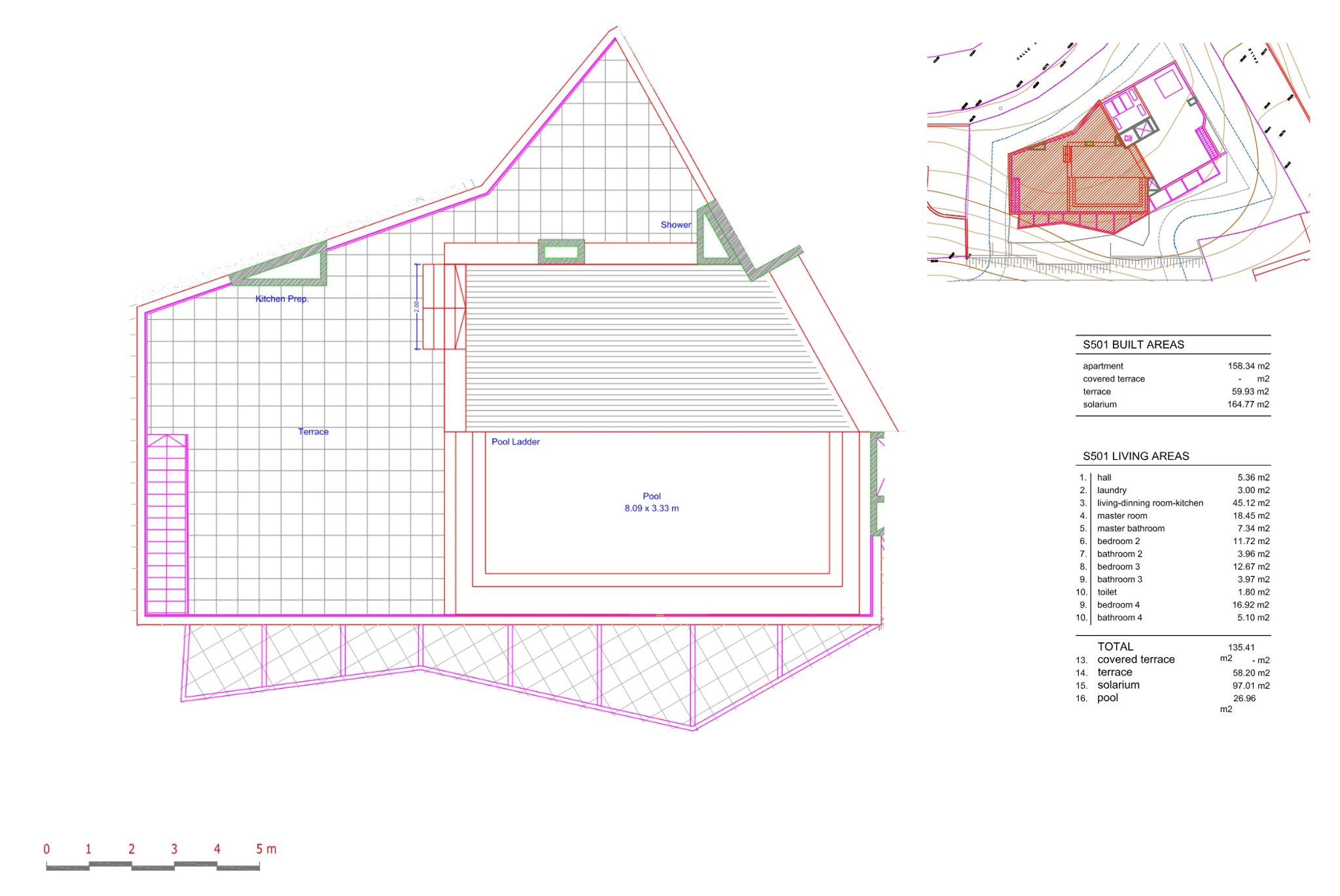 The property is situated on the fifth floor and has a total living area of 158 m². It consists of 4 bedrooms with en-suite bathrooms, a guest toilet, a laundry room, and a large open kitchen and living room. The master bedroom has a walk-in closet and direct access to the 60 m² terrace on the same level. One of the other bedrooms, as well as the living room, also has direct access to the terrace where you can enjoy wonderful dinners. From this terrace, a staircase leads up to the 165 m² rooftop terrace with a shower and a large private infinity pool of 27 m².