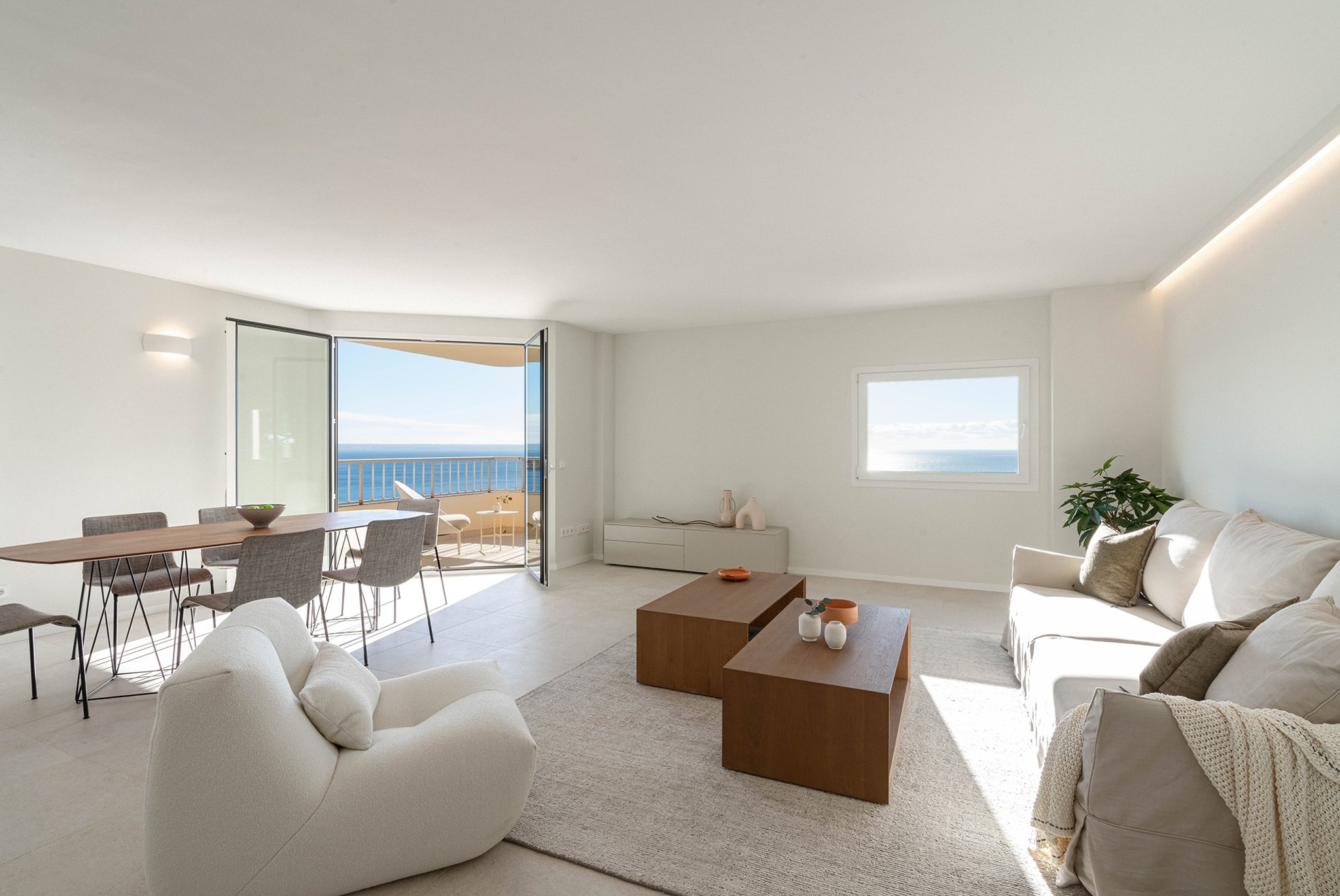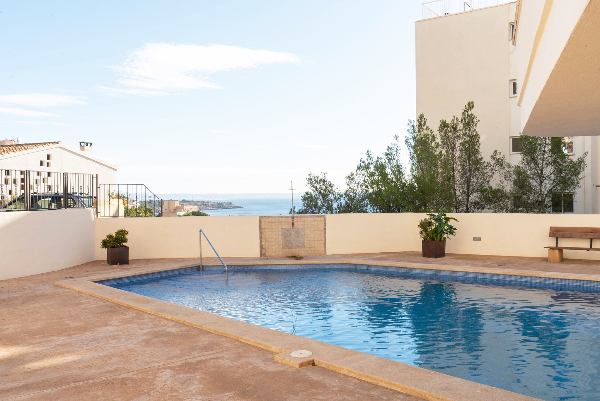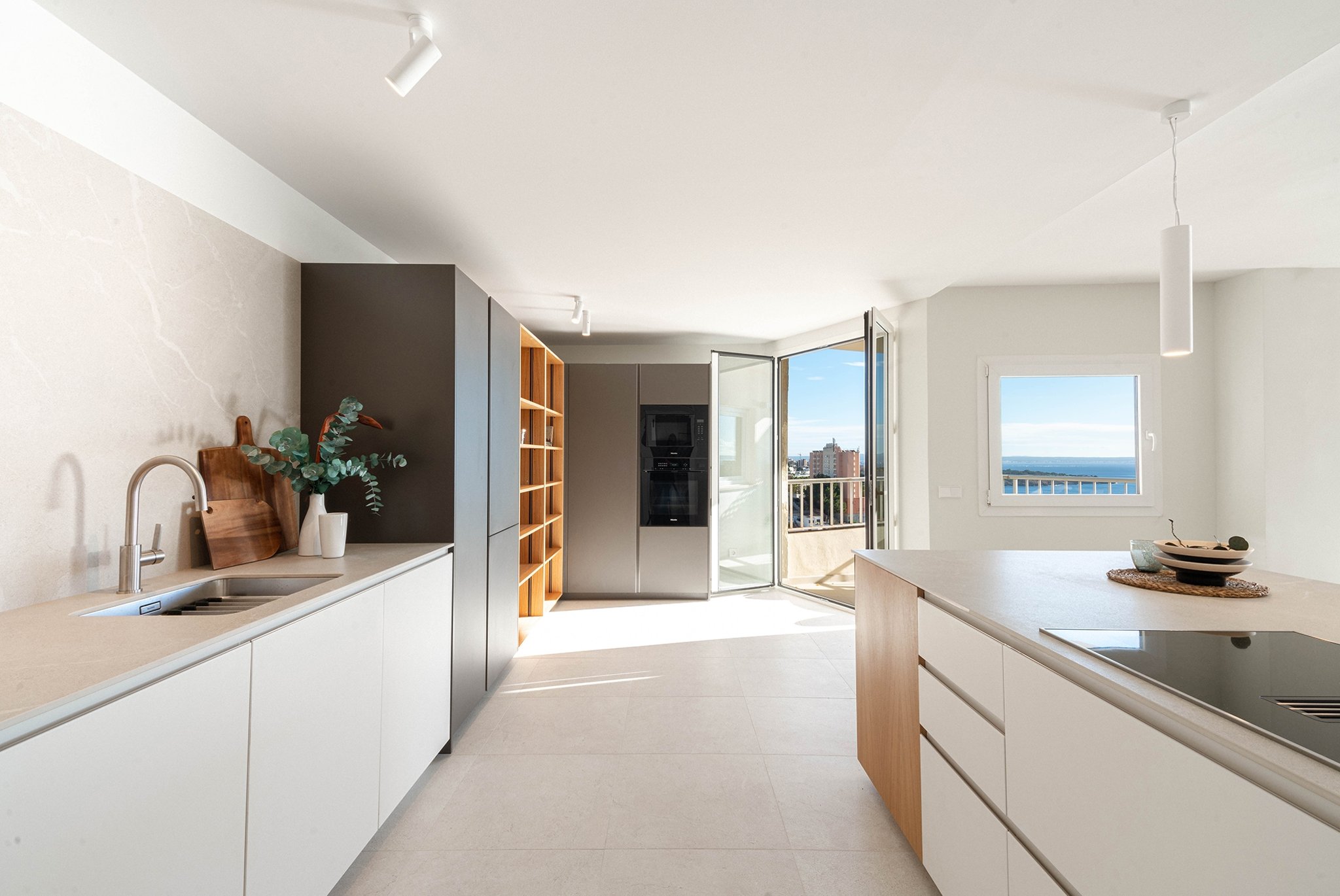 This unique 140m2 penthouse is currently undergoing refurbishment and features three spacious bedrooms with built-in wardrobes and two complete bathrooms. The open kitchen and living room area boast large windows that allow natural light to illuminate the space from all angles, while terrace doors lead out to two terraces offering breathtaking views of the sea, the small port of Calanova, and the surrounding green areas. There are 2 additional terraces each connected to a bedroom to enjoy the views from the moment you wake up. An elevator provides direct access to the community terrace and pool area for a refreshing dip. Additionally, the property includes two generous private storage spaces and a designated parking space.