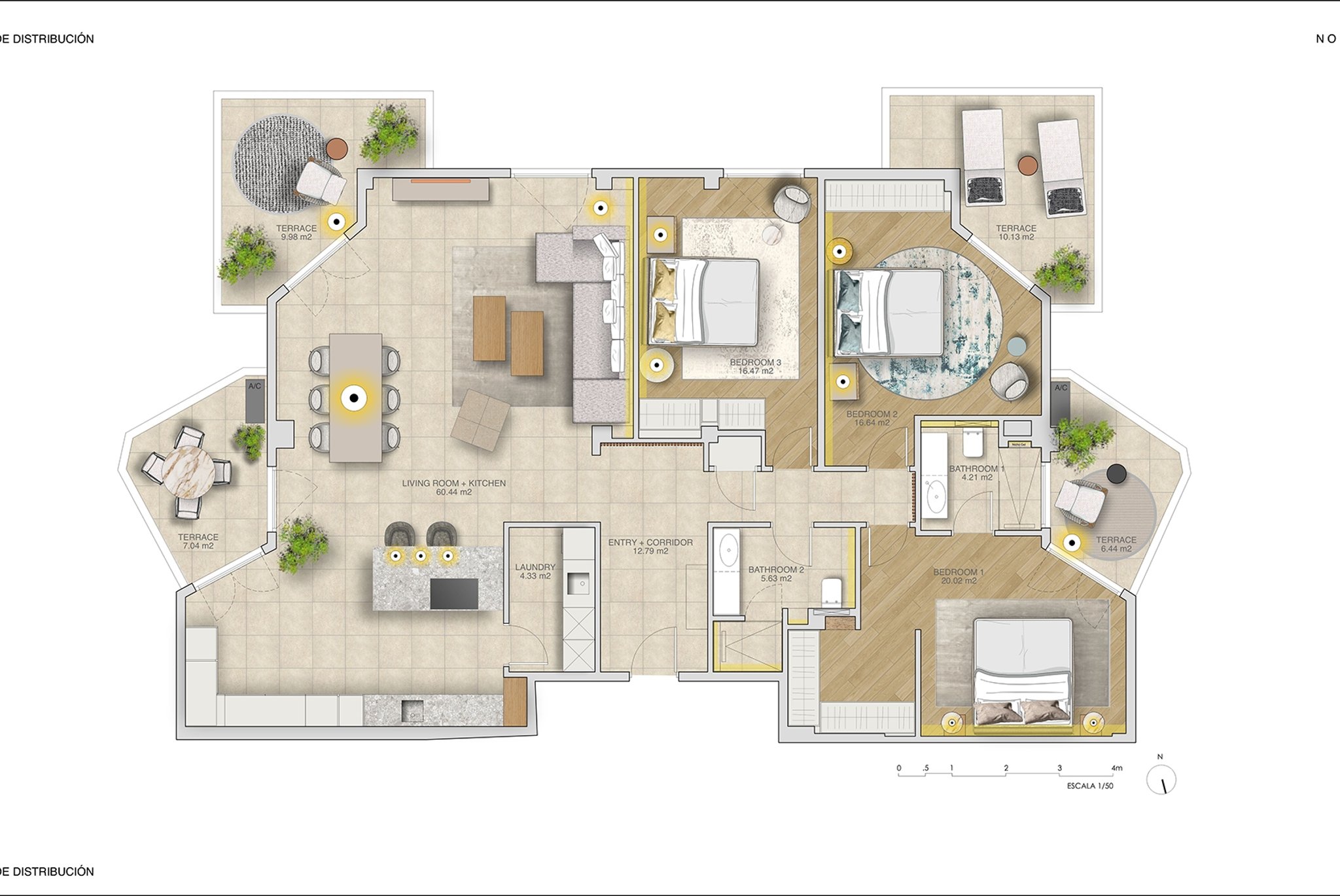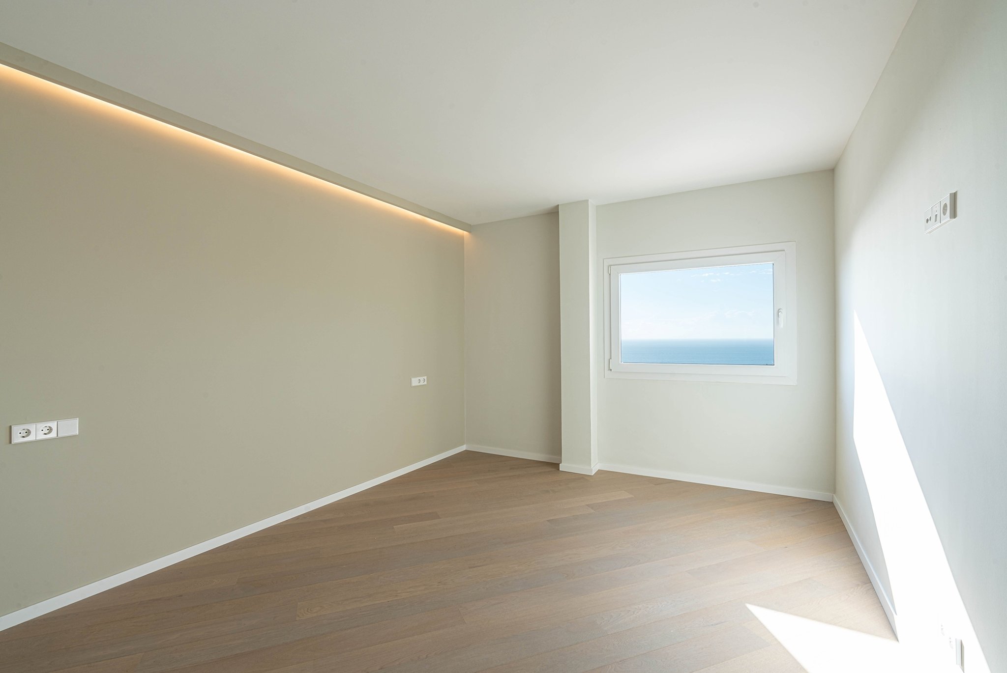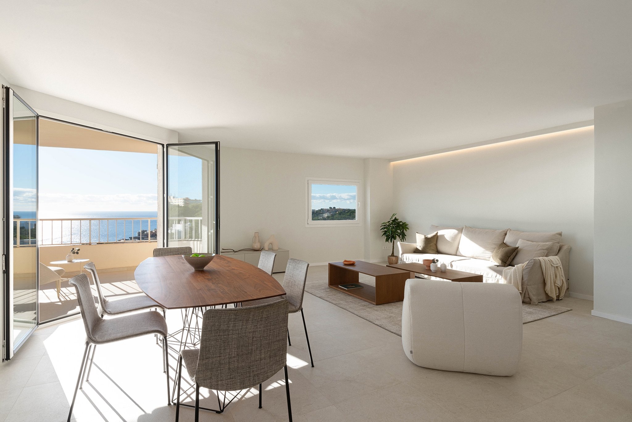 This unique 140m2 penthouse is currently undergoing refurbishment and features three spacious bedrooms with built-in wardrobes and two complete bathrooms. The open kitchen and living room area boast large windows that allow natural light to illuminate the space from all angles, while terrace doors lead out to two terraces offering breathtaking views of the sea, the small port of Calanova, and the surrounding green areas. There are 2 additional terraces each connected to a bedroom to enjoy the views from the moment you wake up. An elevator provides direct access to the community terrace and pool area for a refreshing dip. Additionally, the property includes two generous private storage spaces and a designated parking space.