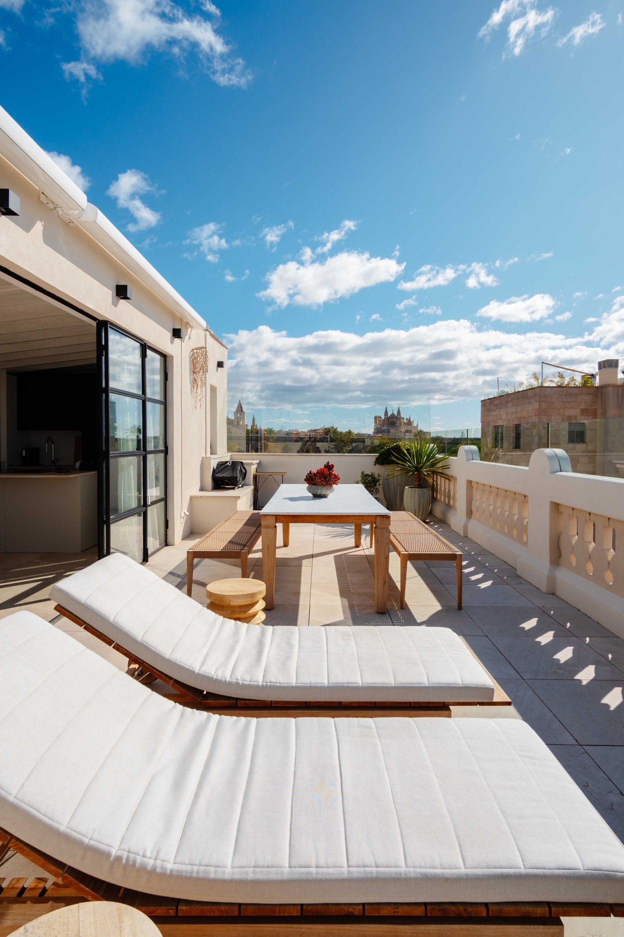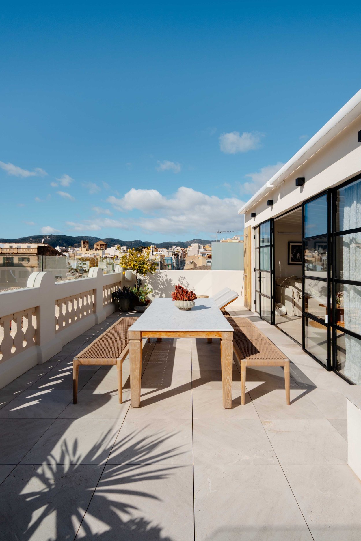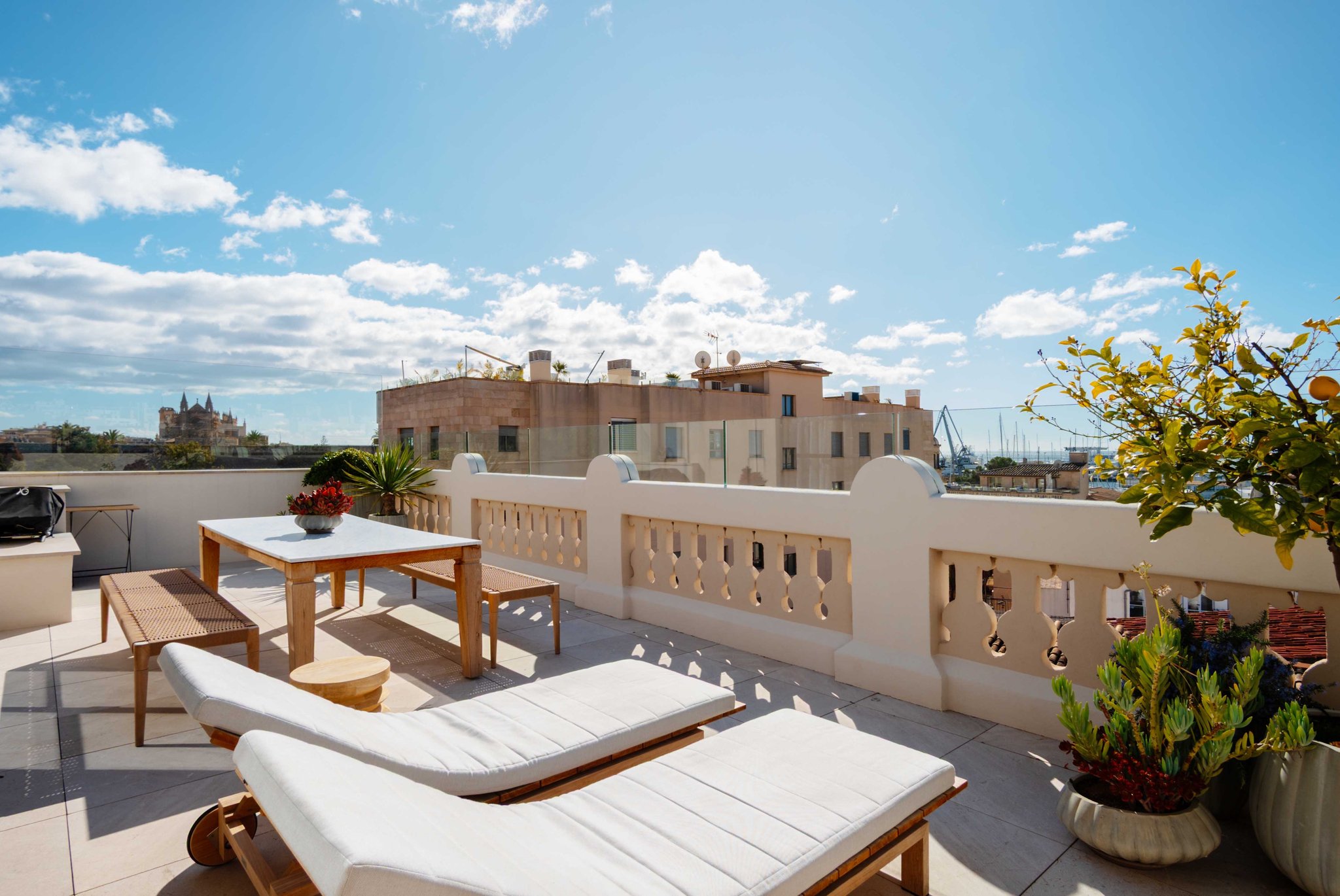 Upstairs you will find an additional living room, a small kitchen, and a guest toilet. From here you access your generous terrace with fantastic views over the sea, harbor and Palma Cathedral. There is plenty of space for a barbecue, dining furniture, and a lounge area. The terrace also features a shower and is prepared for the installation of a jacuzzi.