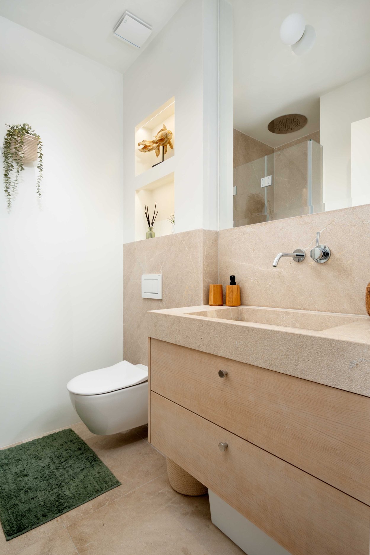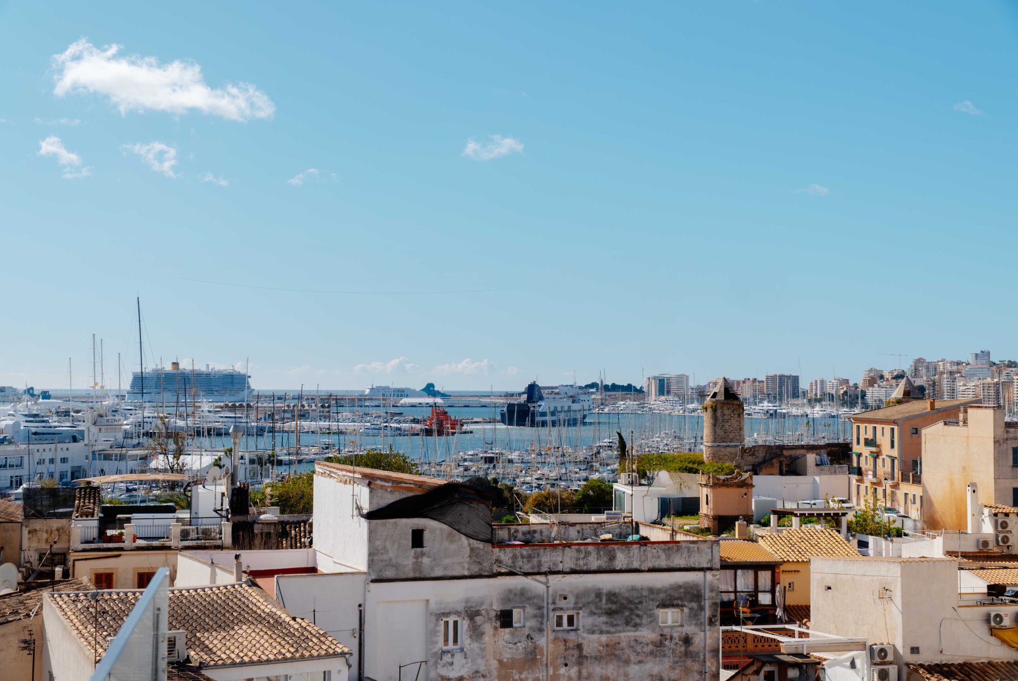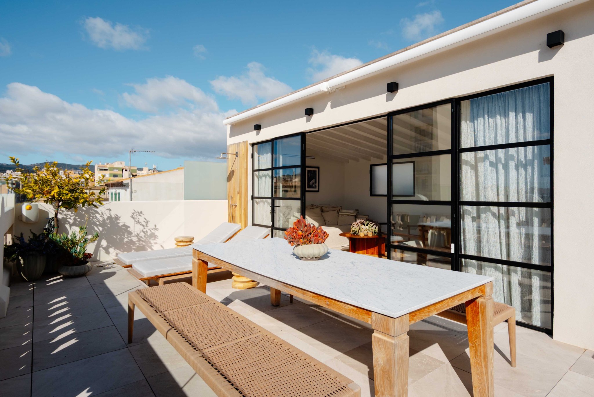 Upstairs you will find an additional living room, a small kitchen, and a guest toilet. From here you access your generous terrace with fantastic views over the sea, harbor and Palma Cathedral. There is plenty of space for a barbecue, dining furniture, and a lounge area. The terrace also features a shower and is prepared for the installation of a jacuzzi.