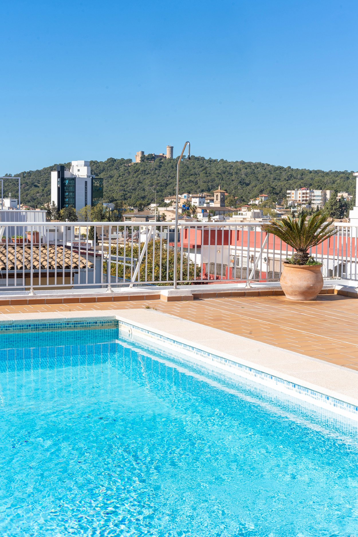 El piso tiene una superficie de 150 m2 que incluye una terraza de unos 6 m2. Se compone de un gran salón comedor, con acceso directo a la terraza, una cocina completamente equipada con office y amplia coladura, 2 dormitorios dobles, 1 dormitorio individual y 3 baños. El dormitorio principal es muy grande y tiene ventanales con vistas al club de tenis y baño ensuite. En la terraza, que también tiene vistas despejadas, caben cómodamente 4 personas. Además, el edificio tiene una pisicina y terraza comunitaria con vistas de toda la bahía de Palma.