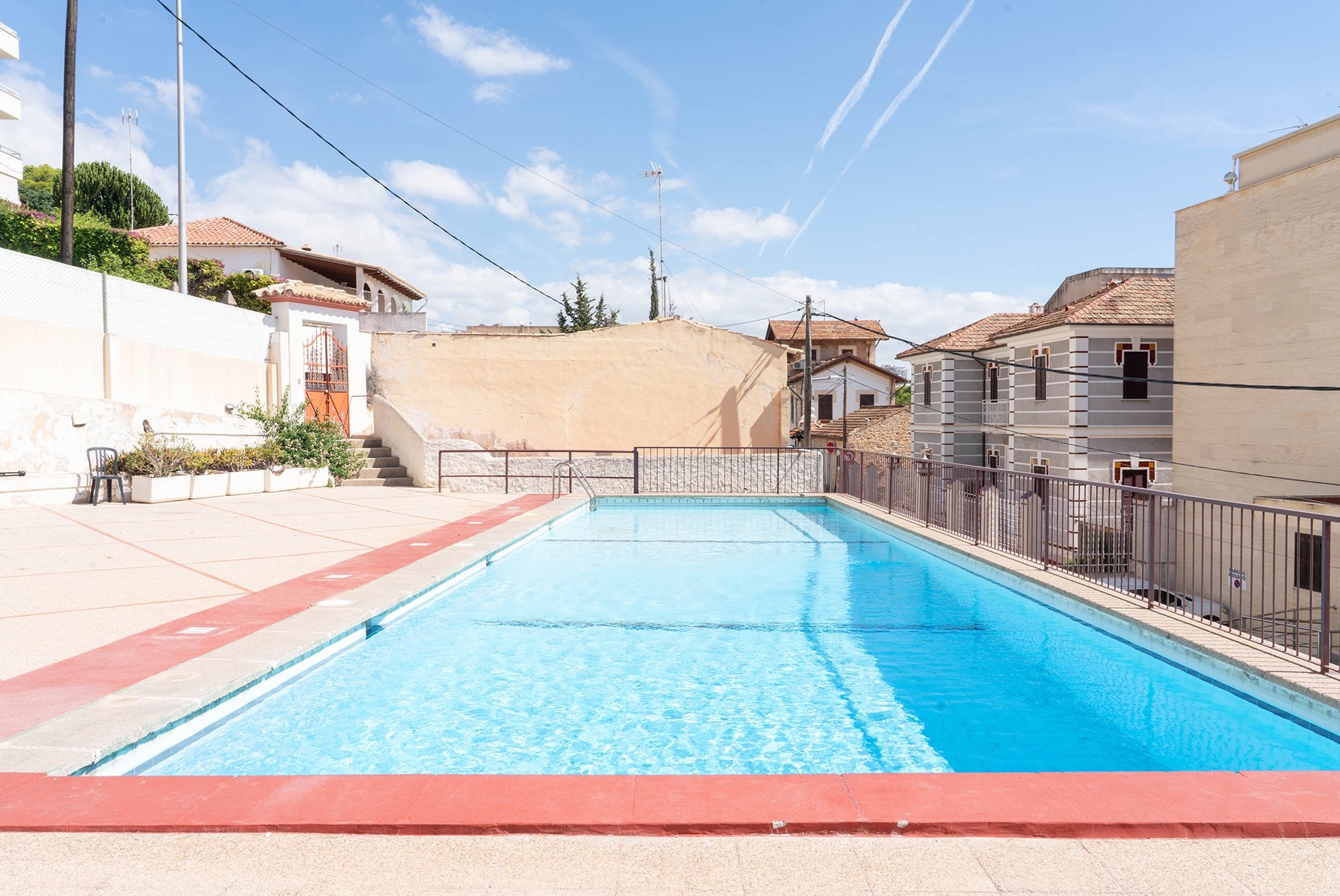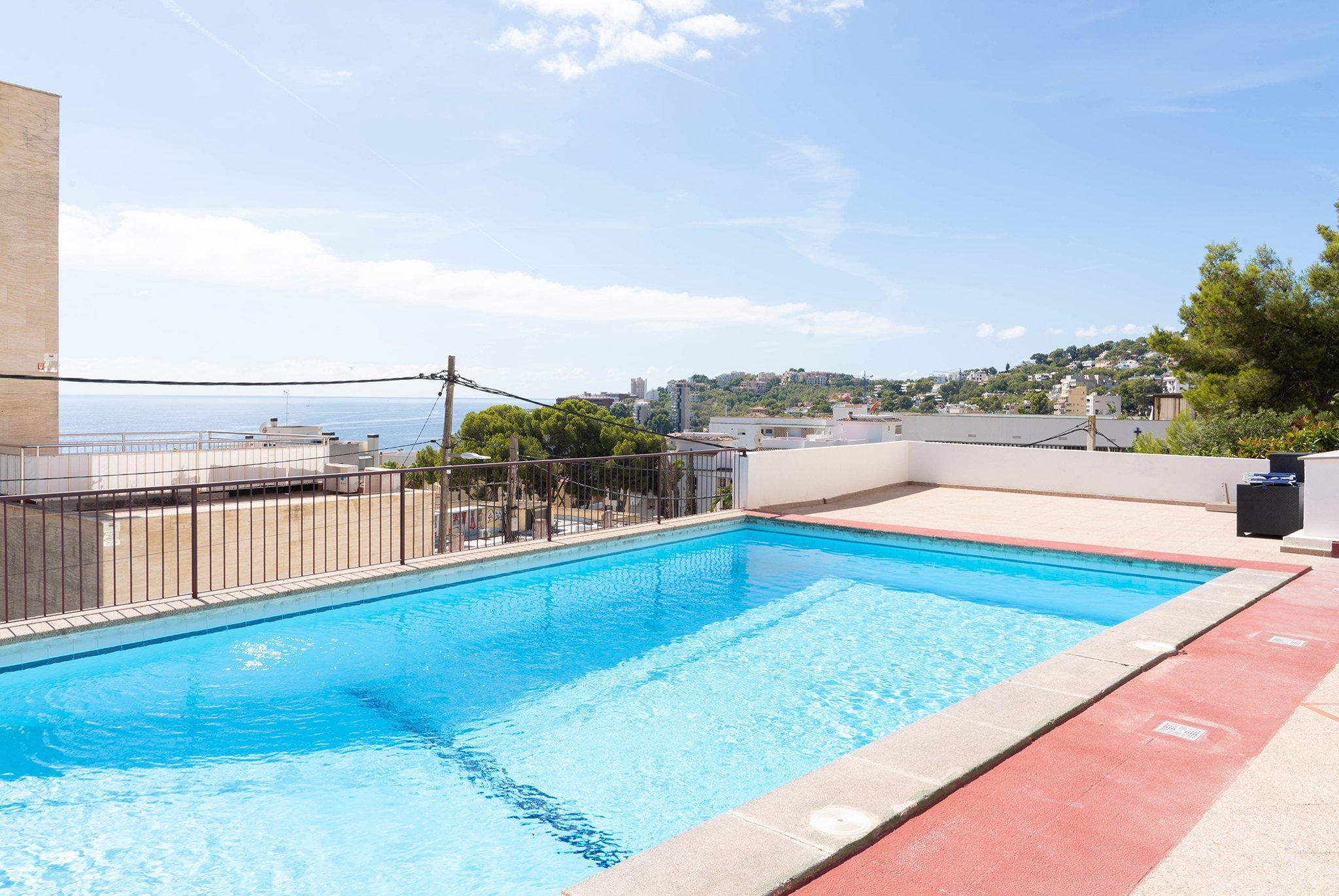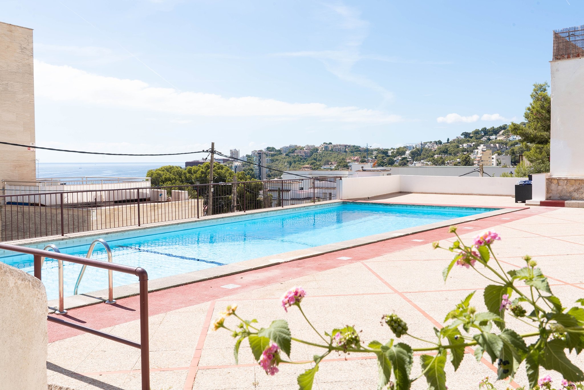 Eiendommen ligger på samme nivå som den felles solterrassen med et nydelig basseng.