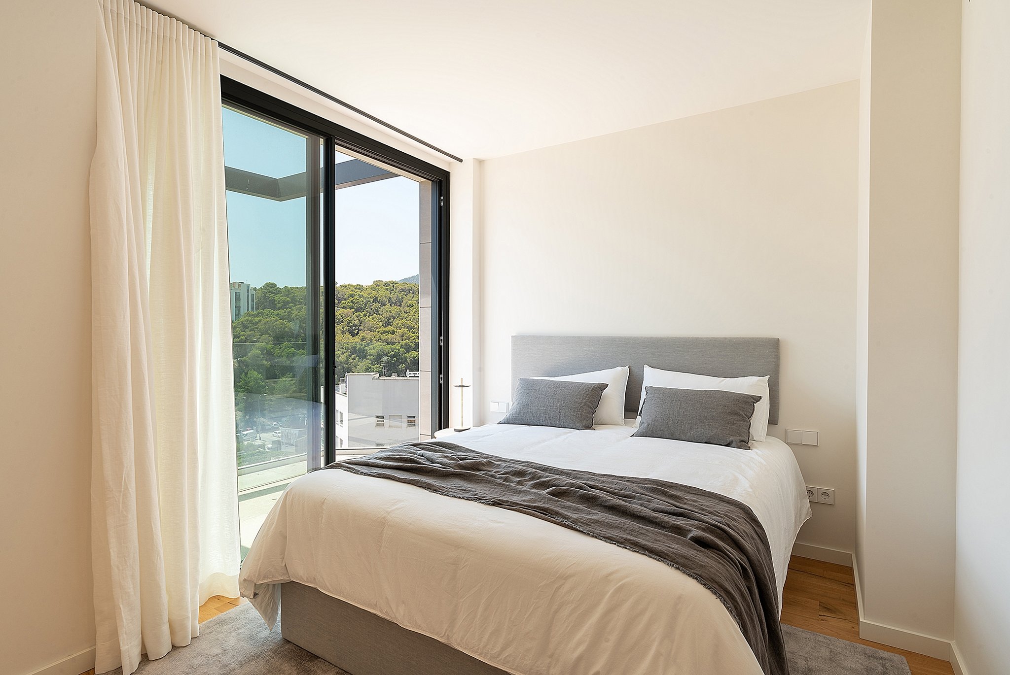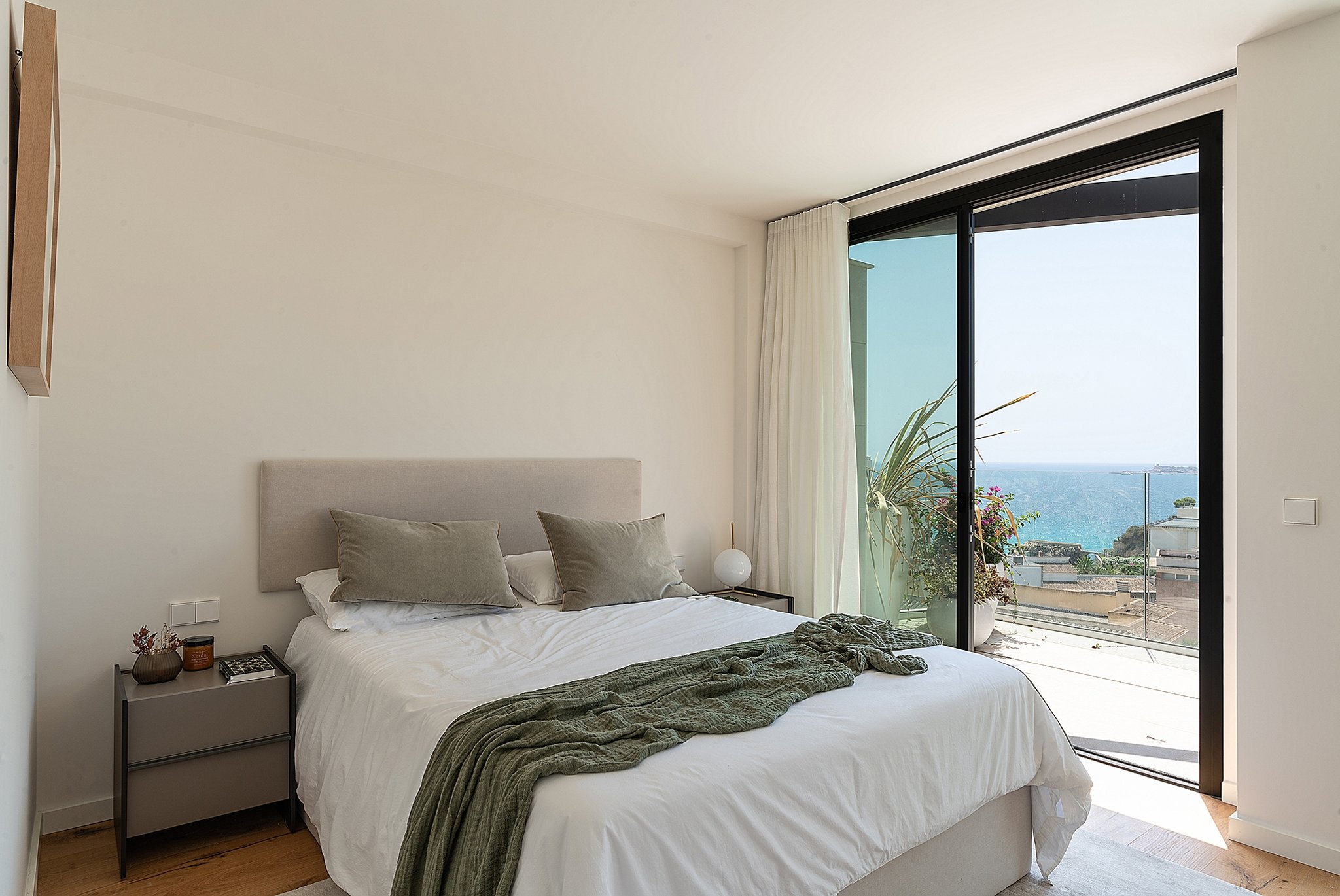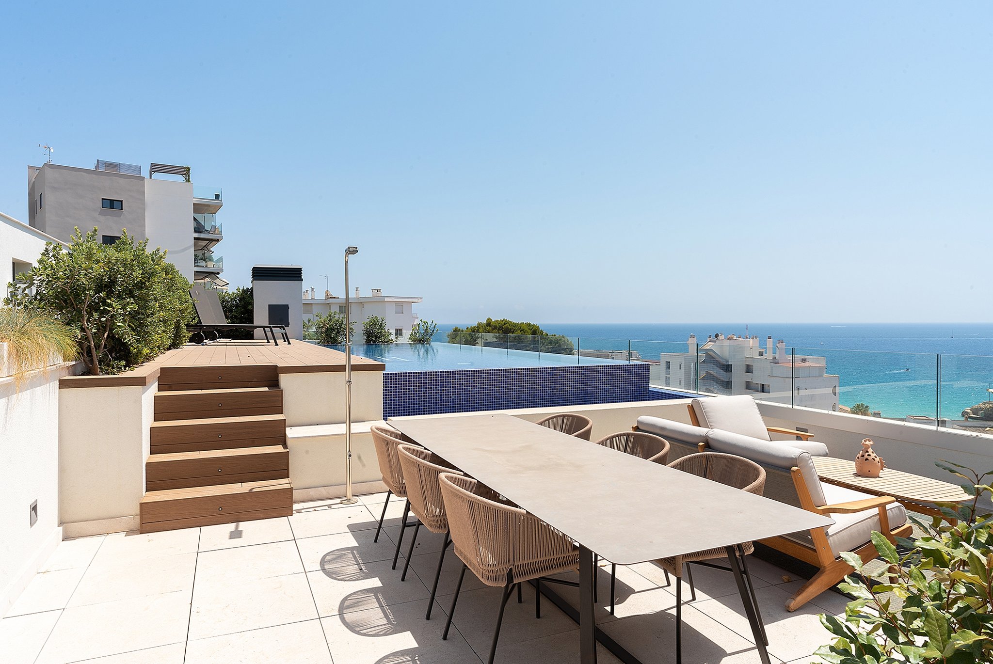 This apartment is in a newly built high quality community in Cala Major, a privileged area surrounded by nature yet still very close to the sea. The apartment has excellent views to the sea and it is ideal for those who are looking for a seaside residential area close to everything. It has a total living area of 140 m2 and consists of 3 bedrooms with en-suite, a guest bathroom, laundry room and a large open kitchen and living room. The master bedroom has a dressing room and direct access to the terrace on the same level of 28 m2. One of the other bedrooms also has direct access to the terrace. The living room connects perfectly with the terrace on the same level where you can enjoy outside dinners. From this terrace there is a stairway that leads up to the best part, the rooftop terrace of 80 m2 with a private pool of 22 m2.