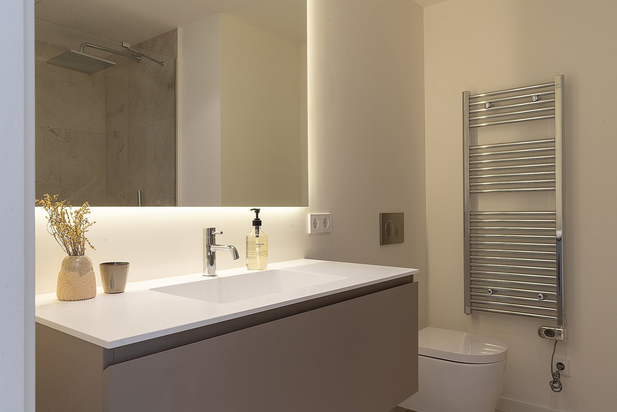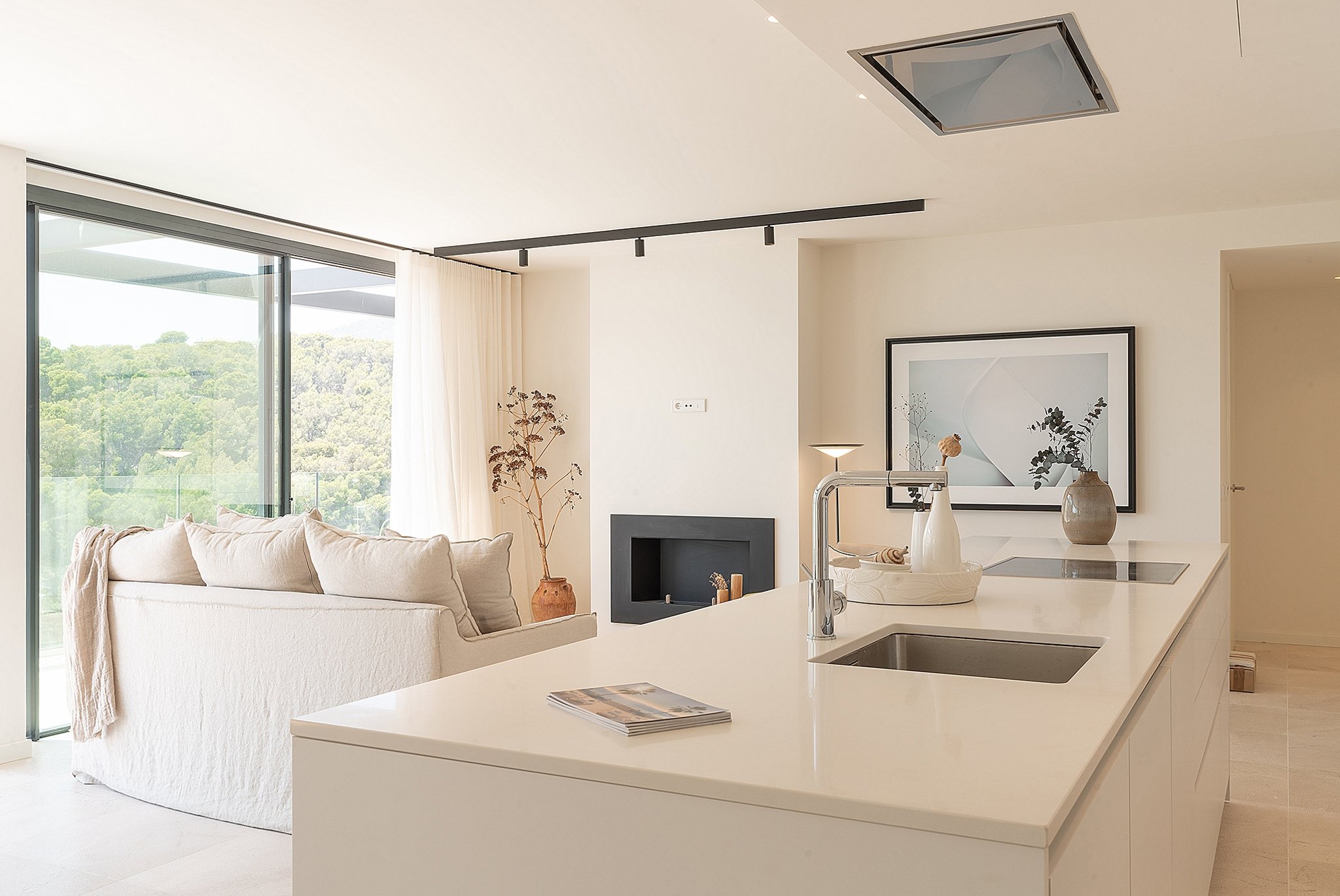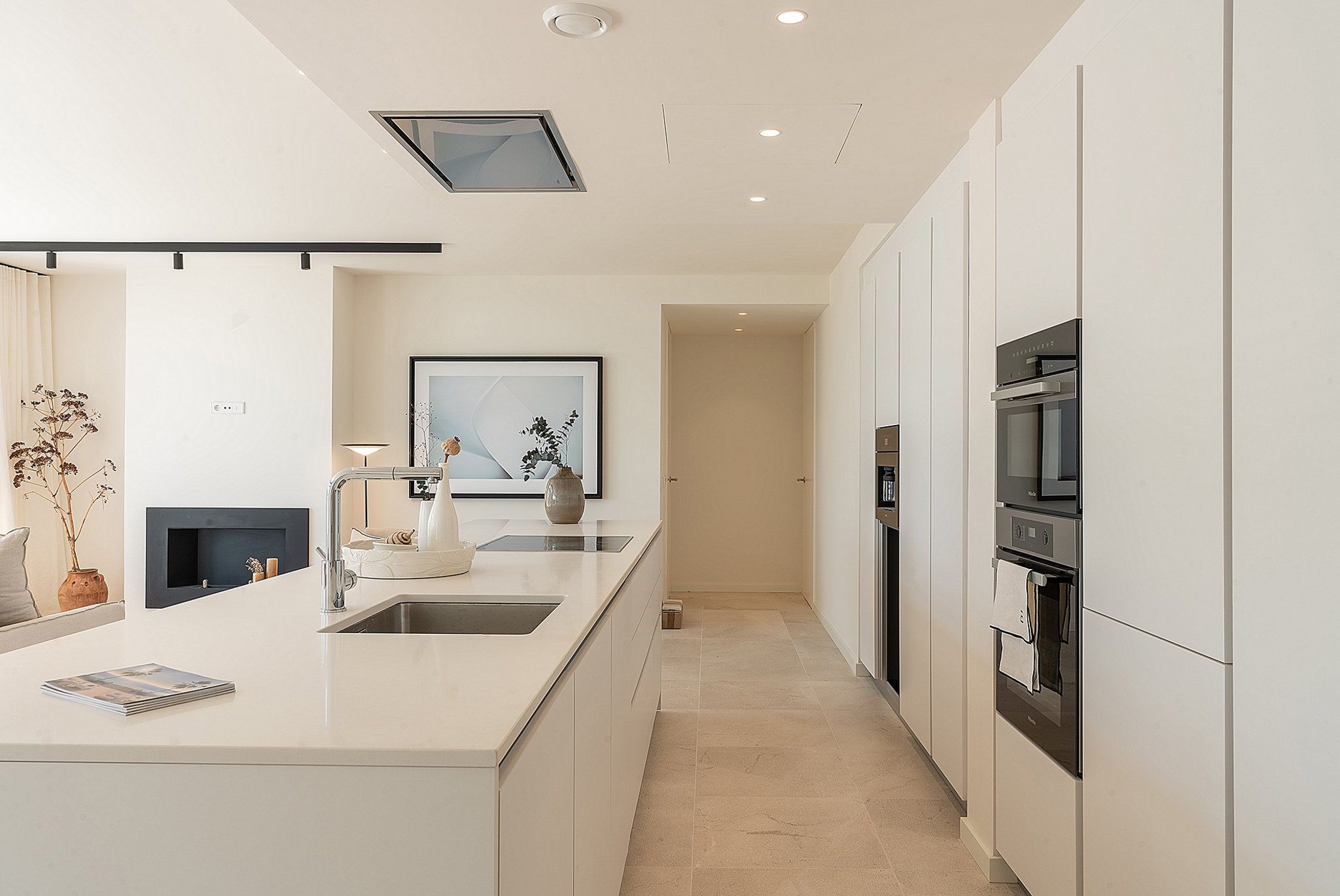 This apartment is in a newly built high quality community in Cala Major, a privileged area surrounded by nature yet still very close to the sea. The apartment has excellent views to the sea and it is ideal for those who are looking for a seaside residential area close to everything. It has a total living area of 140 m2 and consists of 3 bedrooms with en-suite, a guest bathroom, laundry room and a large open kitchen and living room. The master bedroom has a dressing room and direct access to the terrace on the same level of 28 m2. One of the other bedrooms also has direct access to the terrace. The living room connects perfectly with the terrace on the same level where you can enjoy outside dinners. From this terrace there is a stairway that leads up to the best part, the rooftop terrace of 80 m2 with a private pool of 22 m2.