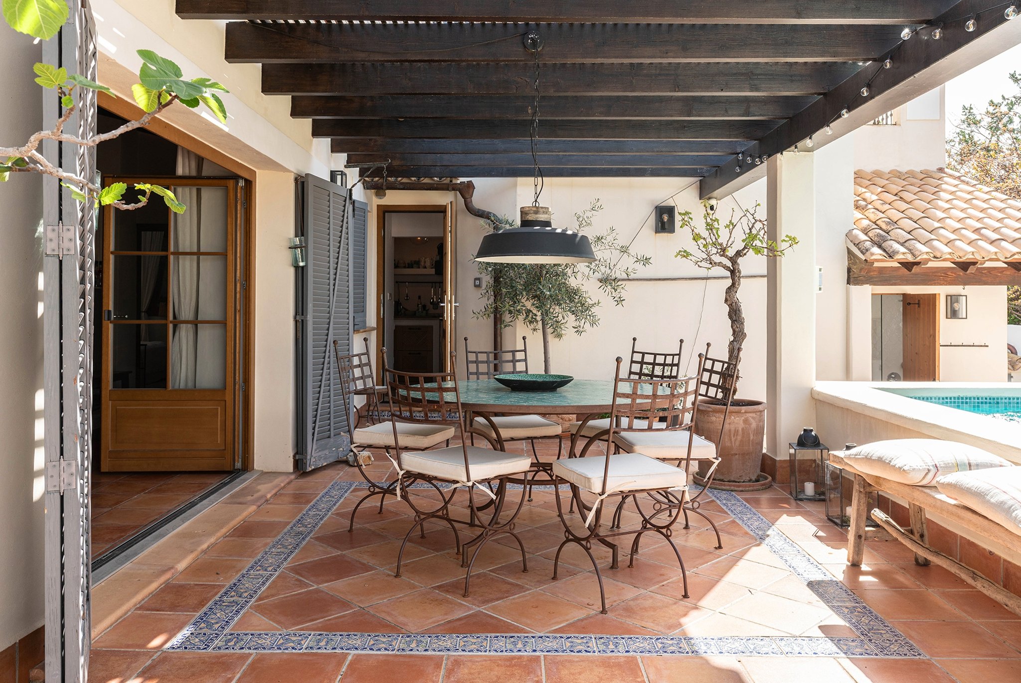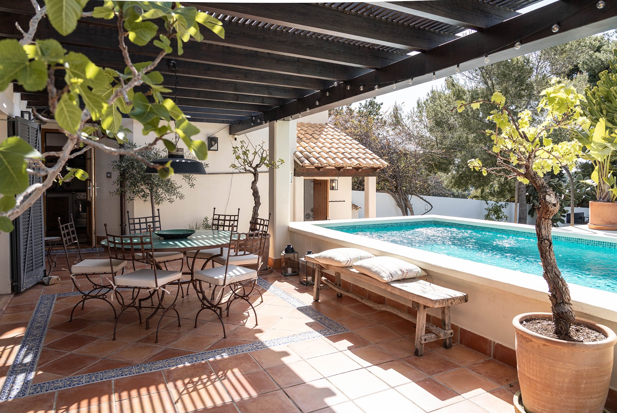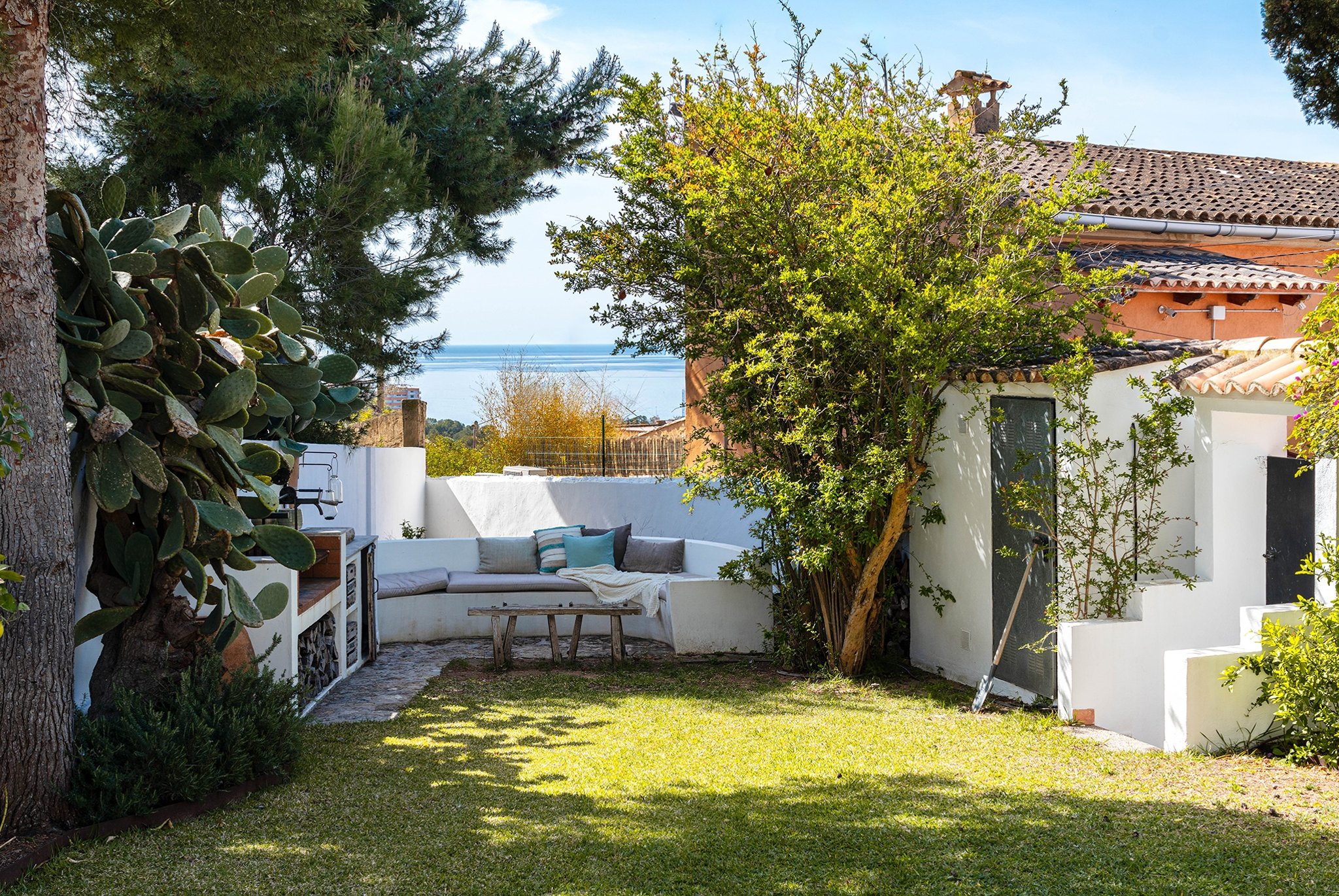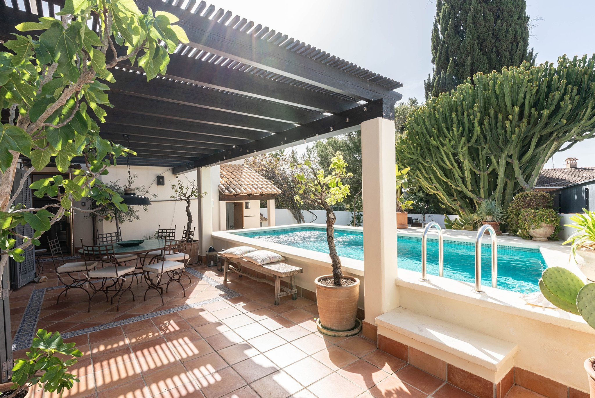 Den täckta terrassen erbjuder gott om plats för både matgrupp och loungemöbler, och ligger i direkt anslutning till poolen. Härifrån når du även din medelhavsträdgård med vackra växter, en härlig loungedel med utekök och grill samt en utomhusdusch. Från terrassen nås även ett fullt utrustat badrum.