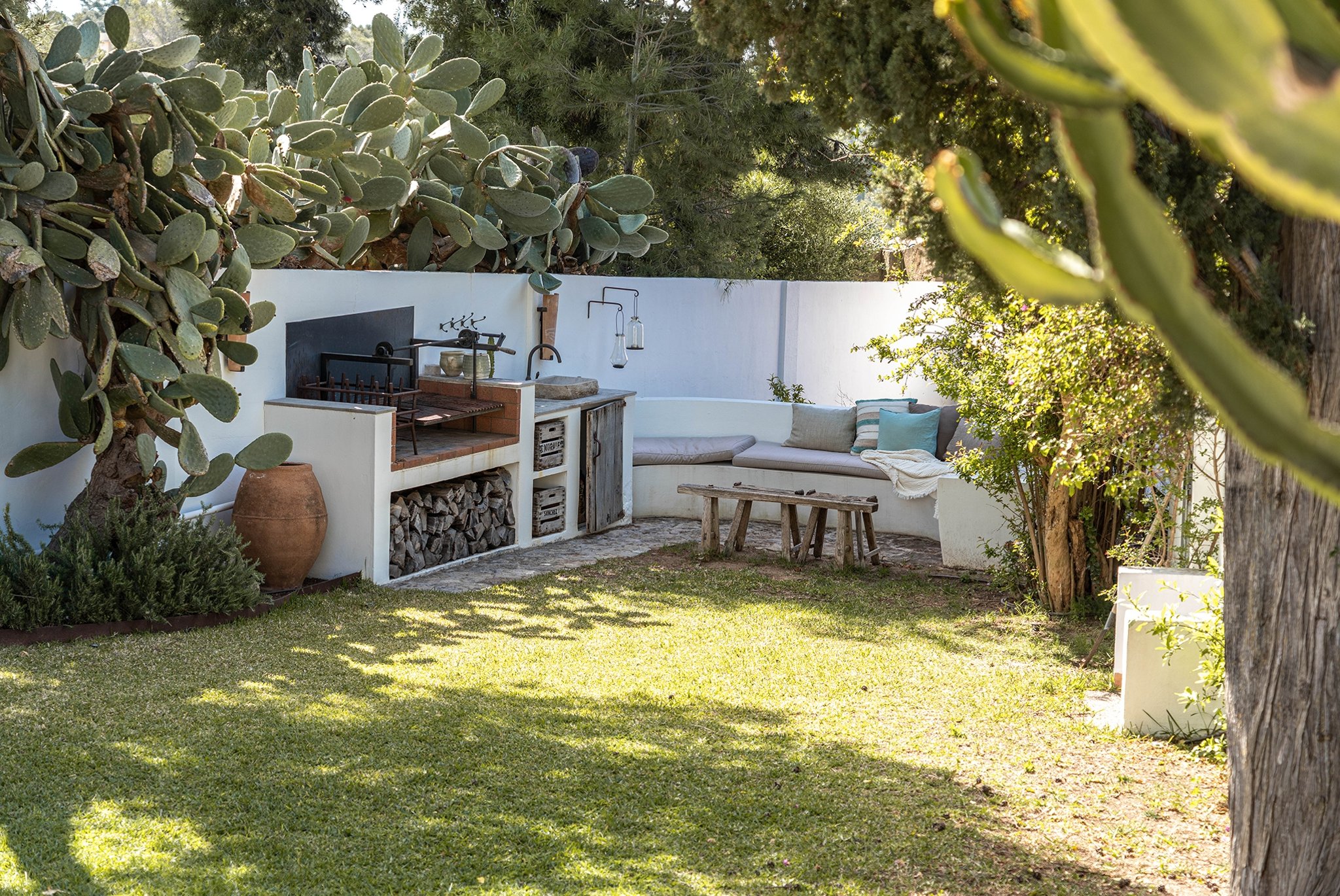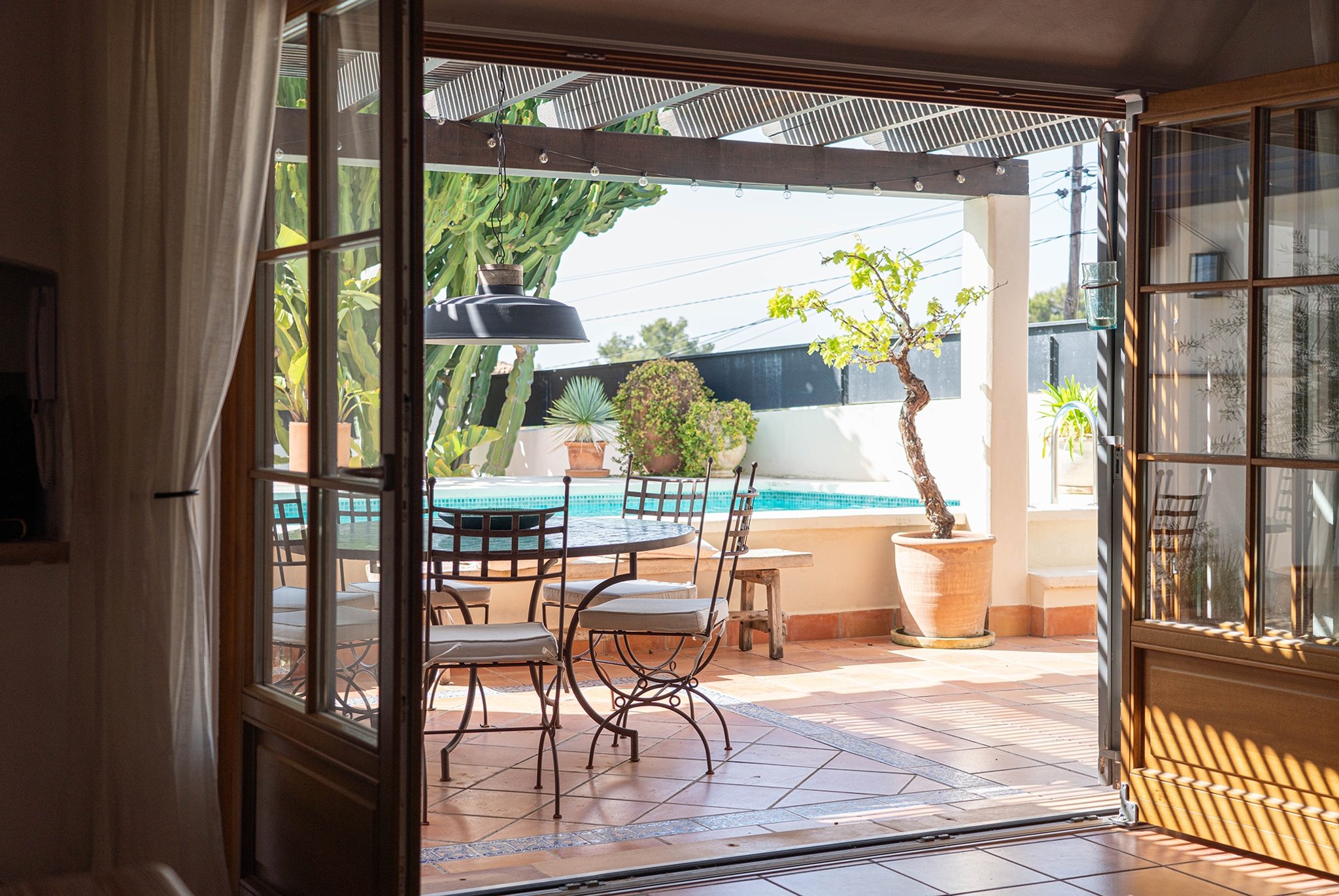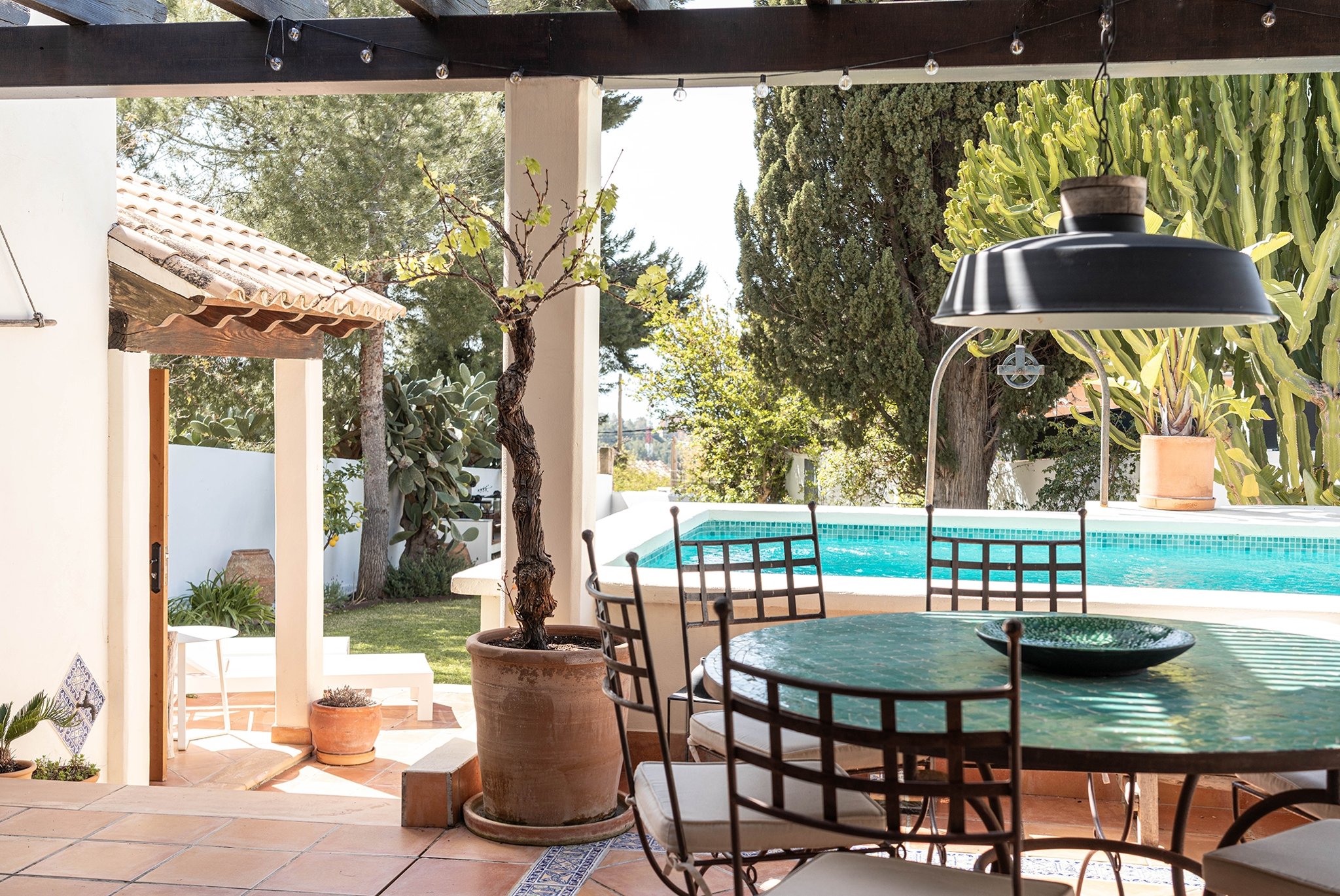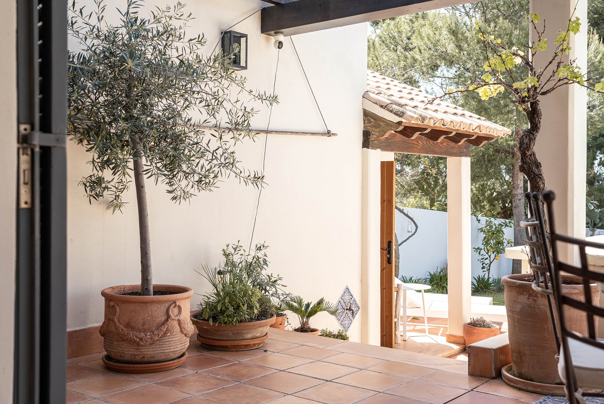 Den täckta terrassen erbjuder gott om plats för både matgrupp och loungemöbler, och ligger i direkt anslutning till poolen. Härifrån når du även din medelhavsträdgård med vackra växter, en härlig loungedel med utekök och grill samt en utomhusdusch. Från terrassen nås även ett fullt utrustat badrum.