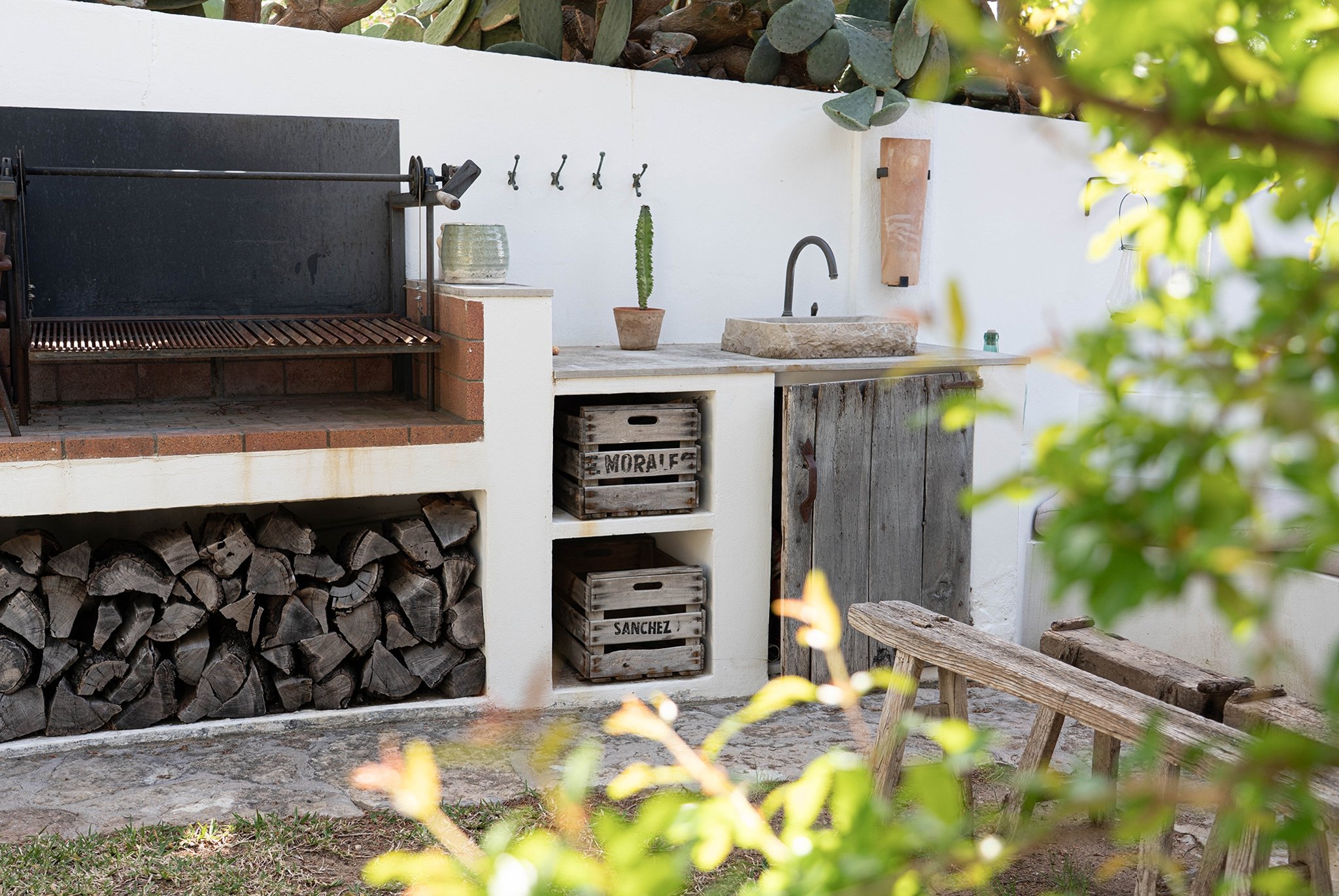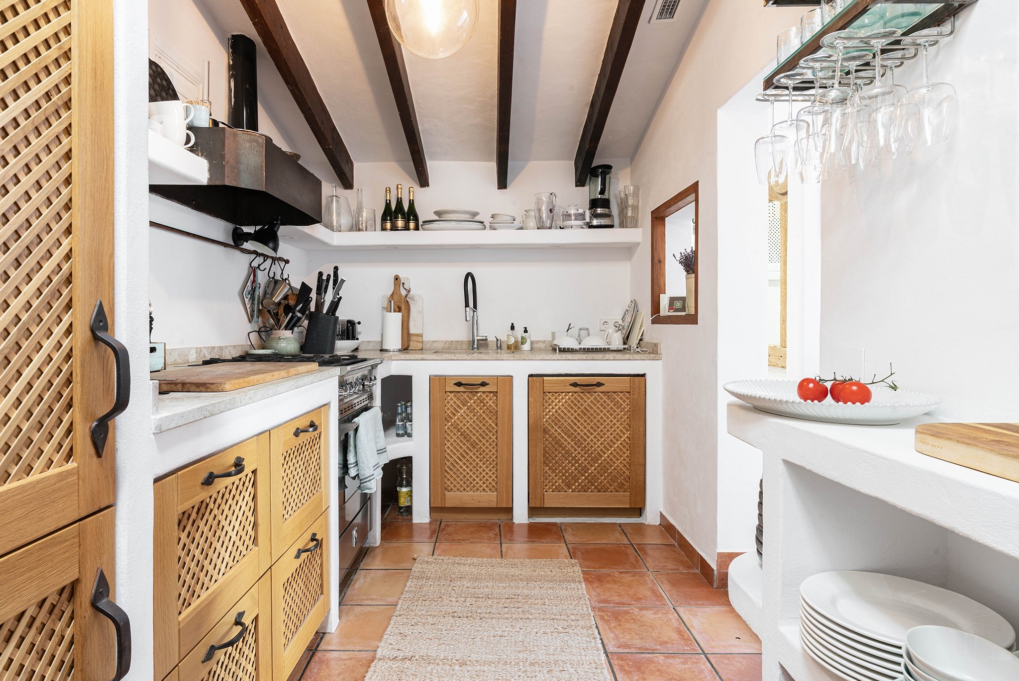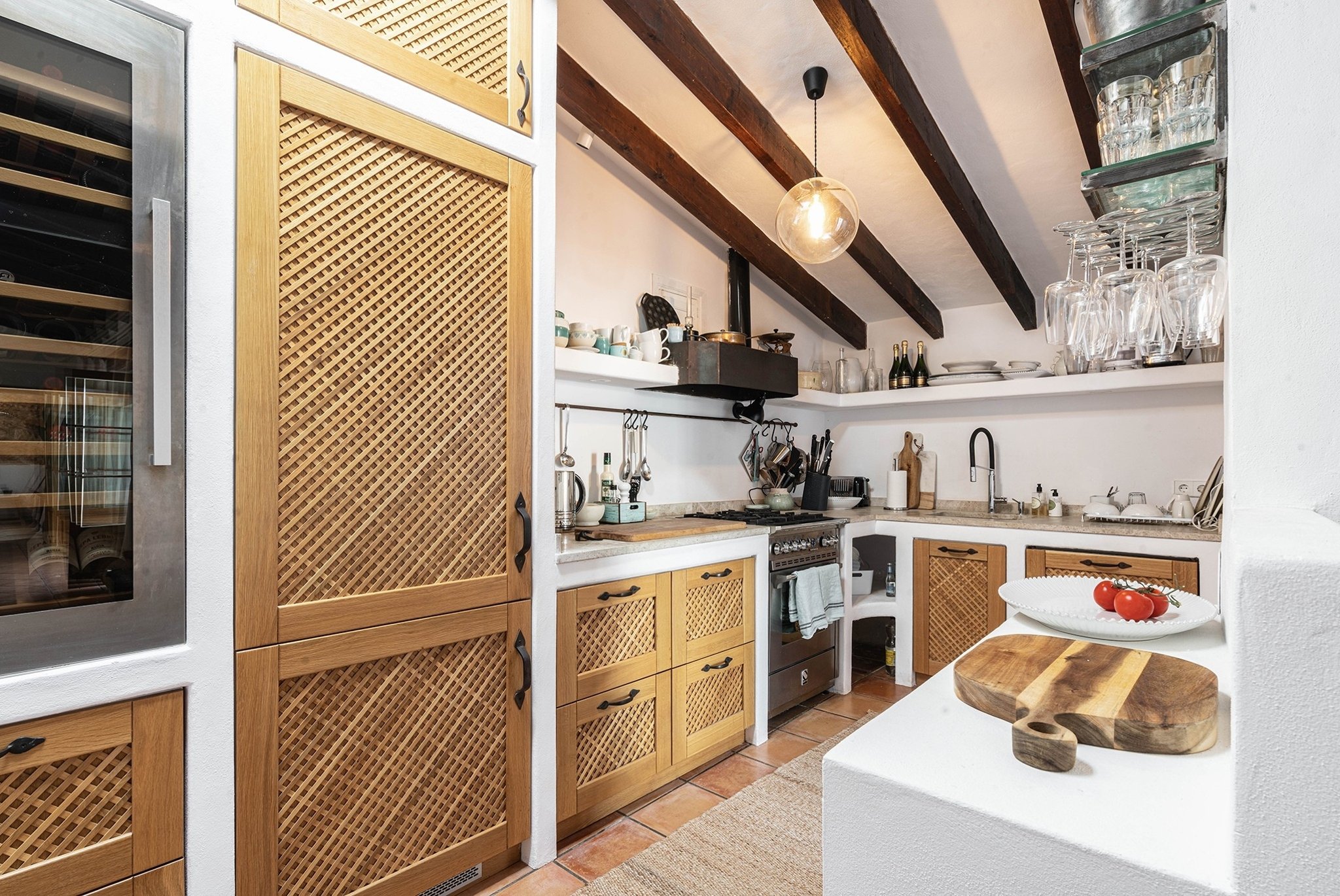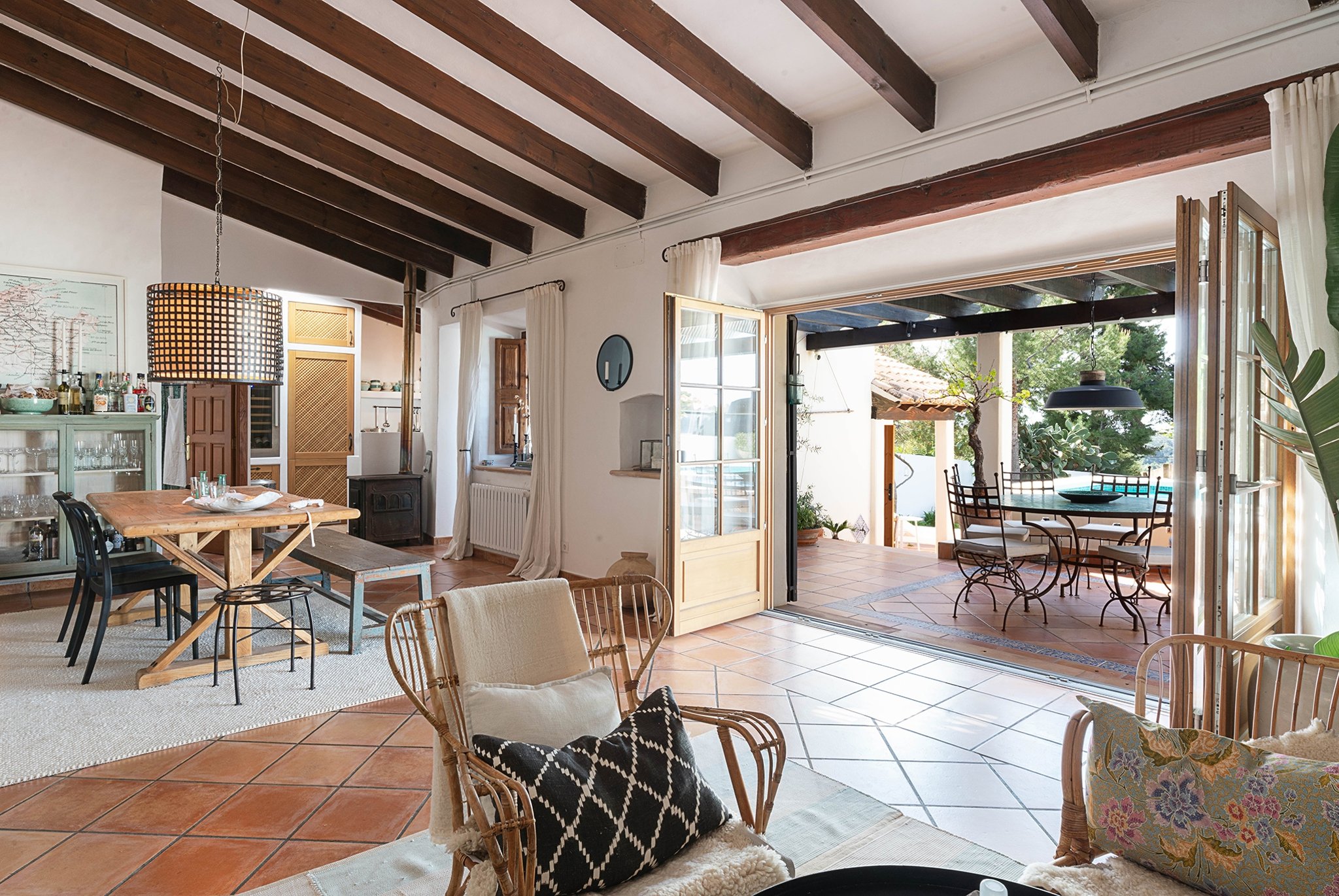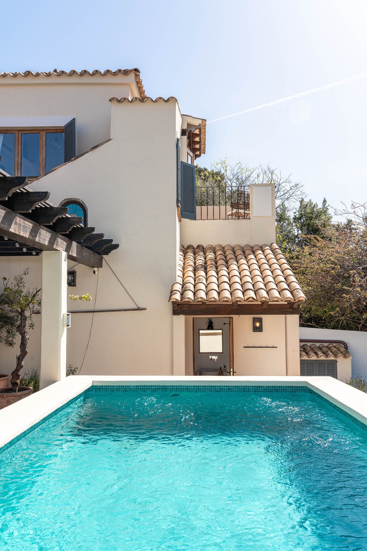Den täckta terrassen erbjuder gott om plats för både matgrupp och loungemöbler, och ligger i direkt anslutning till poolen. Härifrån når du även din medelhavsträdgård med vackra växter, en härlig loungedel med utekök och grill samt en utomhusdusch. Från terrassen nås även ett fullt utrustat badrum.