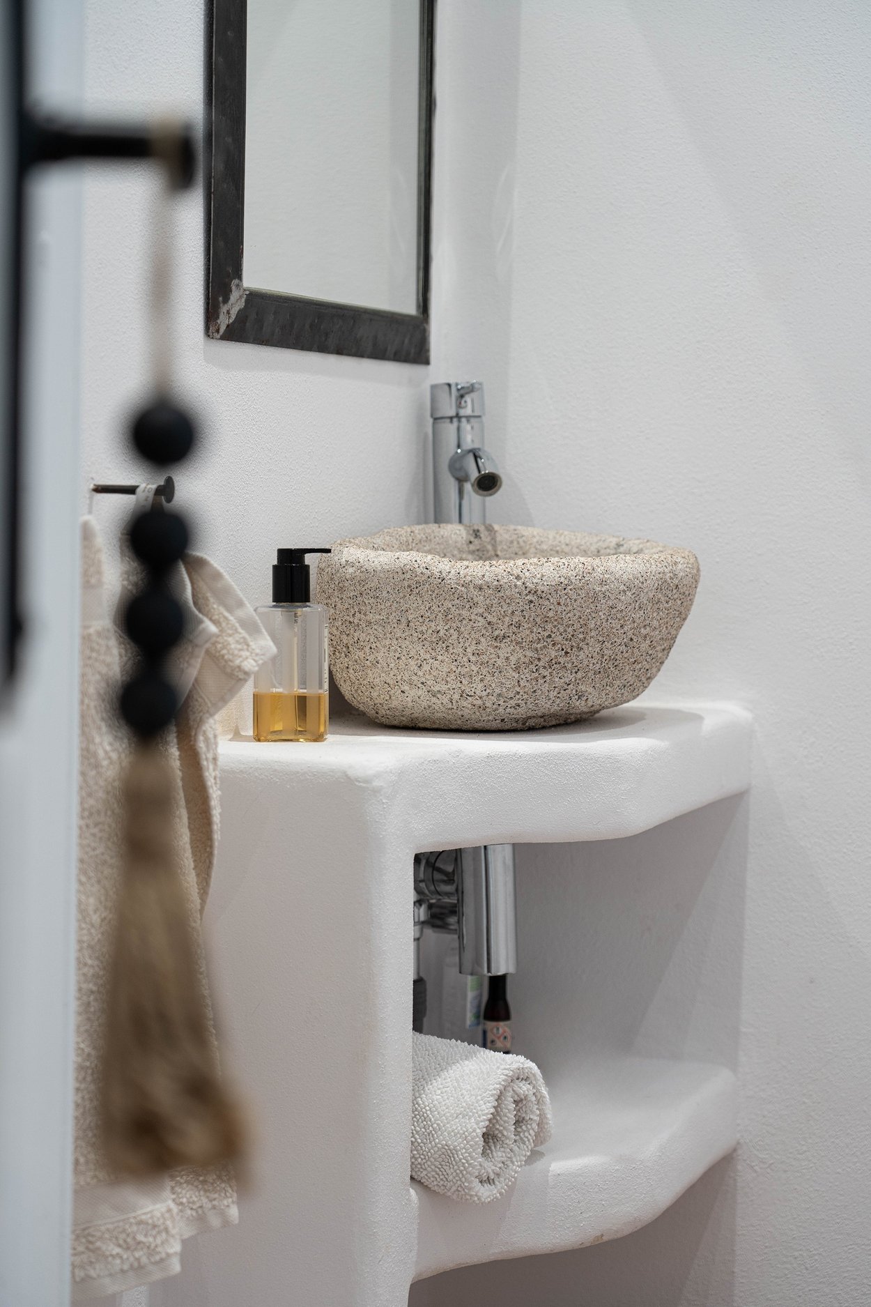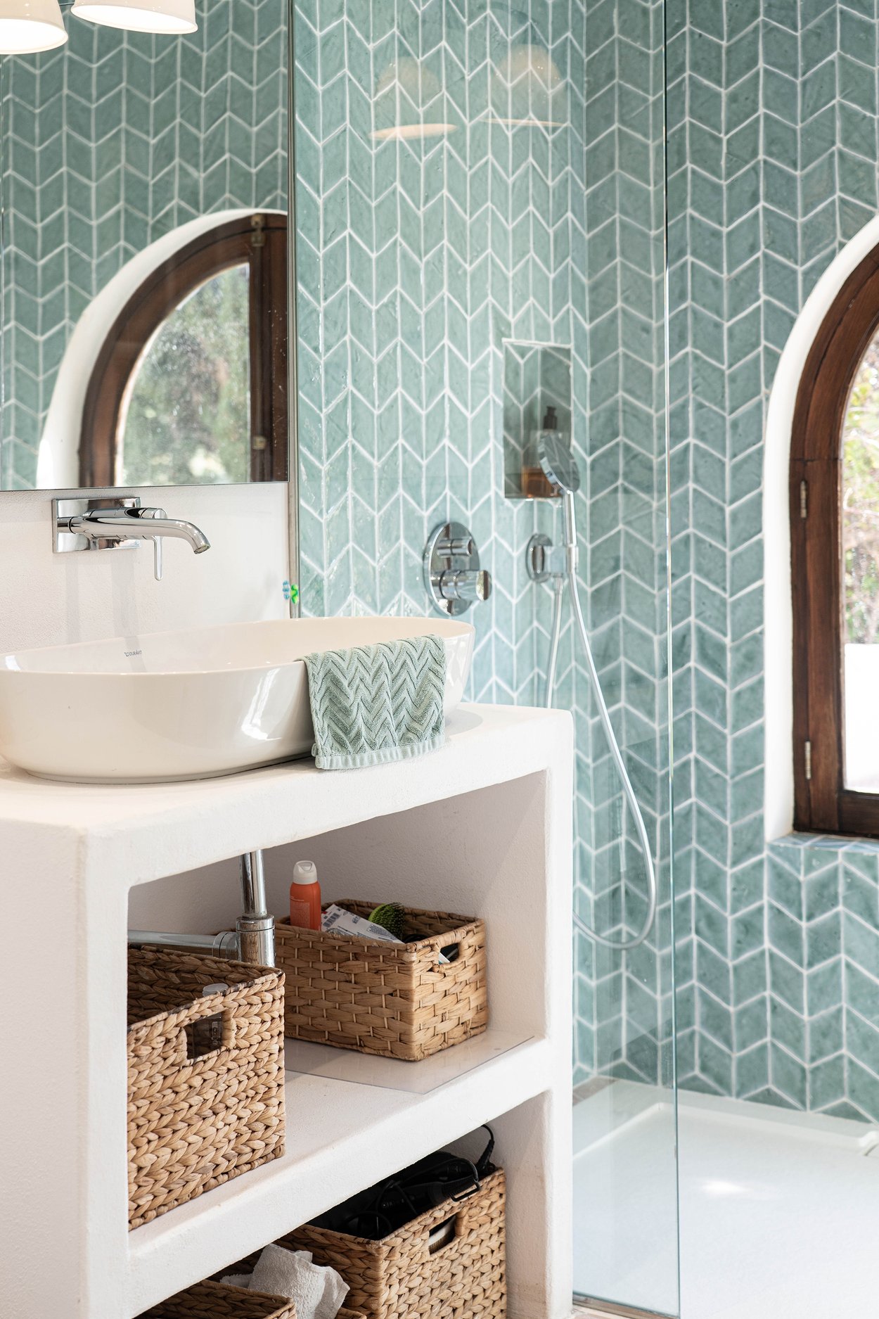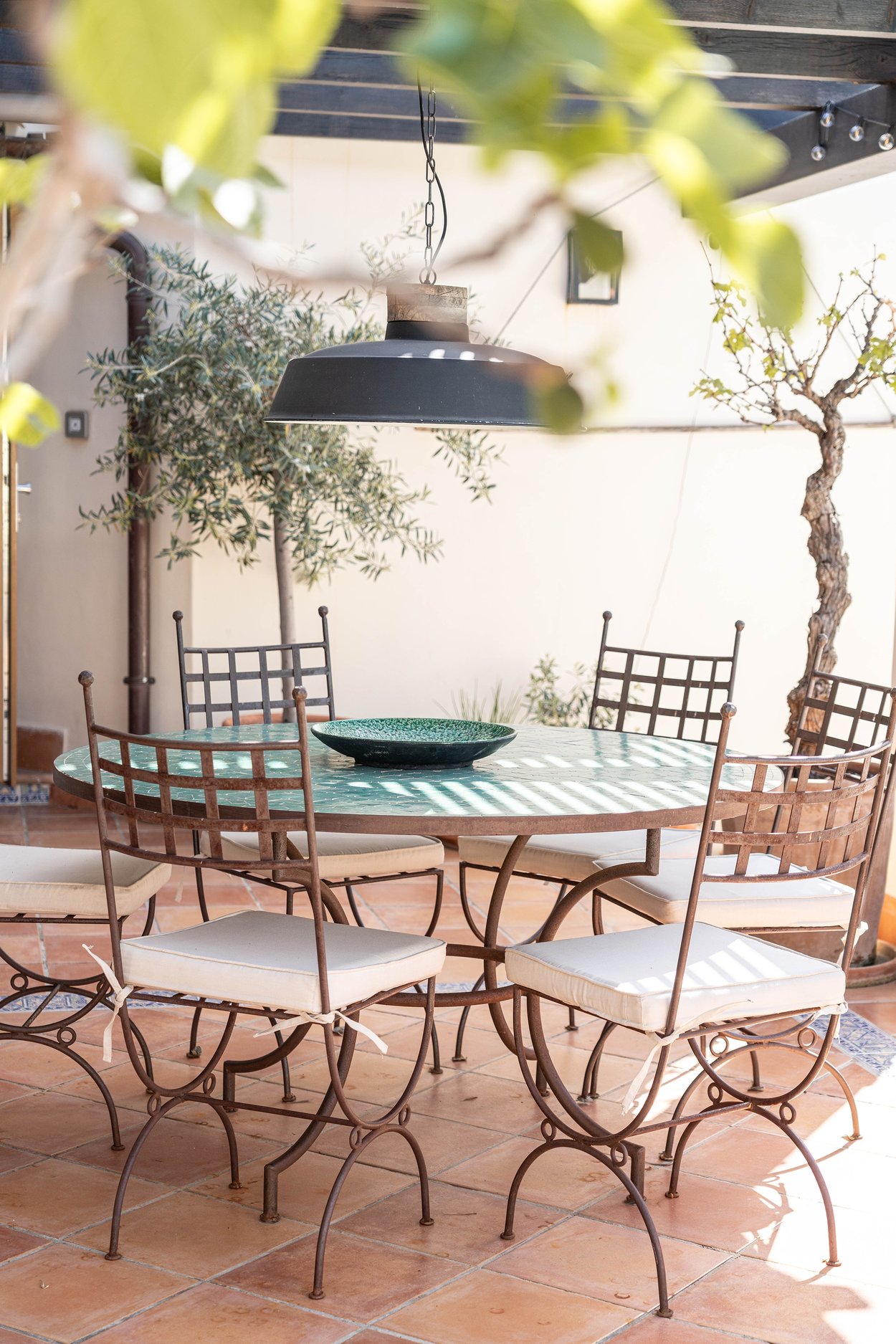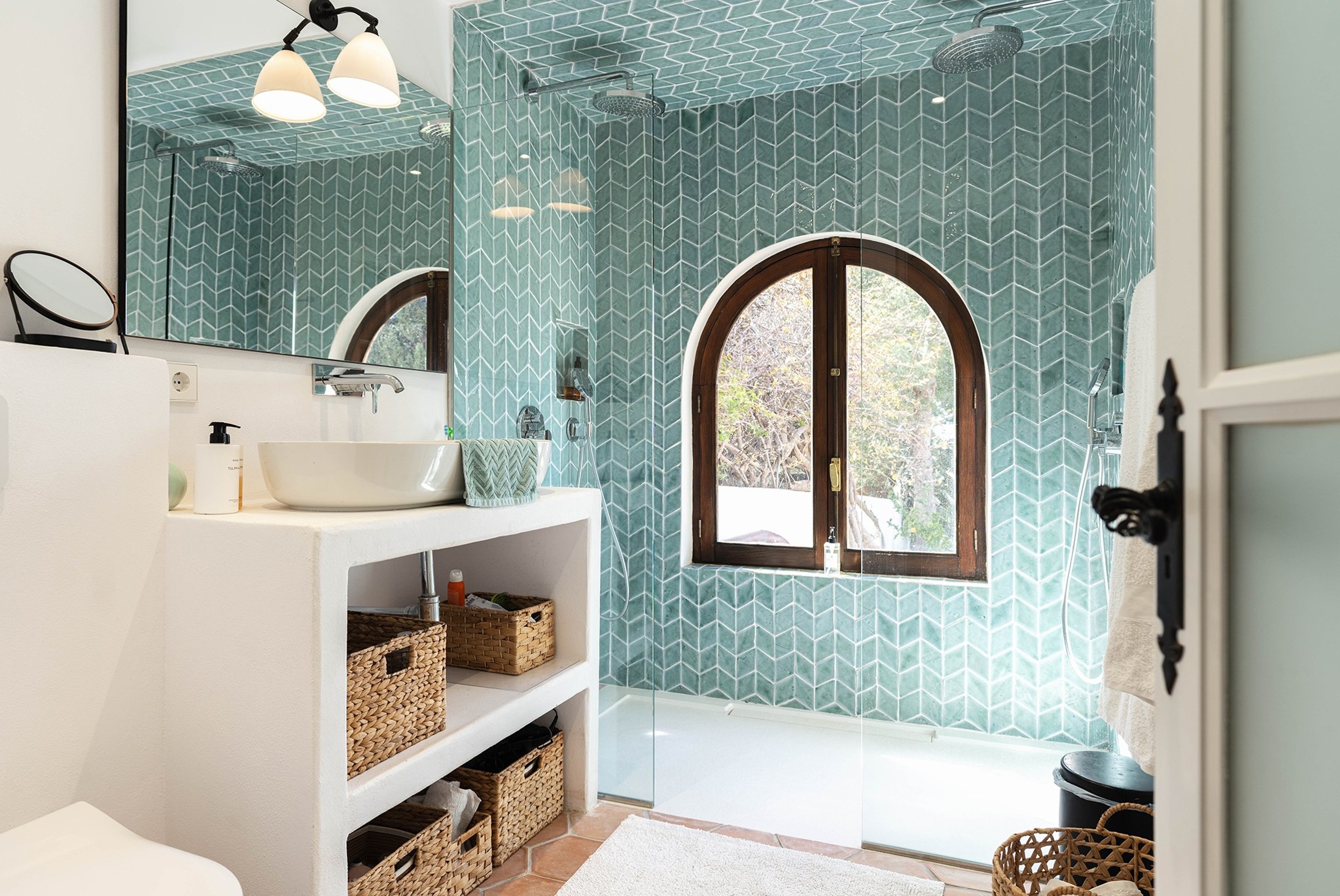 Den täckta terrassen erbjuder gott om plats för både matgrupp och loungemöbler, och ligger i direkt anslutning till poolen. Härifrån når du även din medelhavsträdgård med vackra växter, en härlig loungedel med utekök och grill samt en utomhusdusch. Från terrassen nås även ett fullt utrustat badrum.