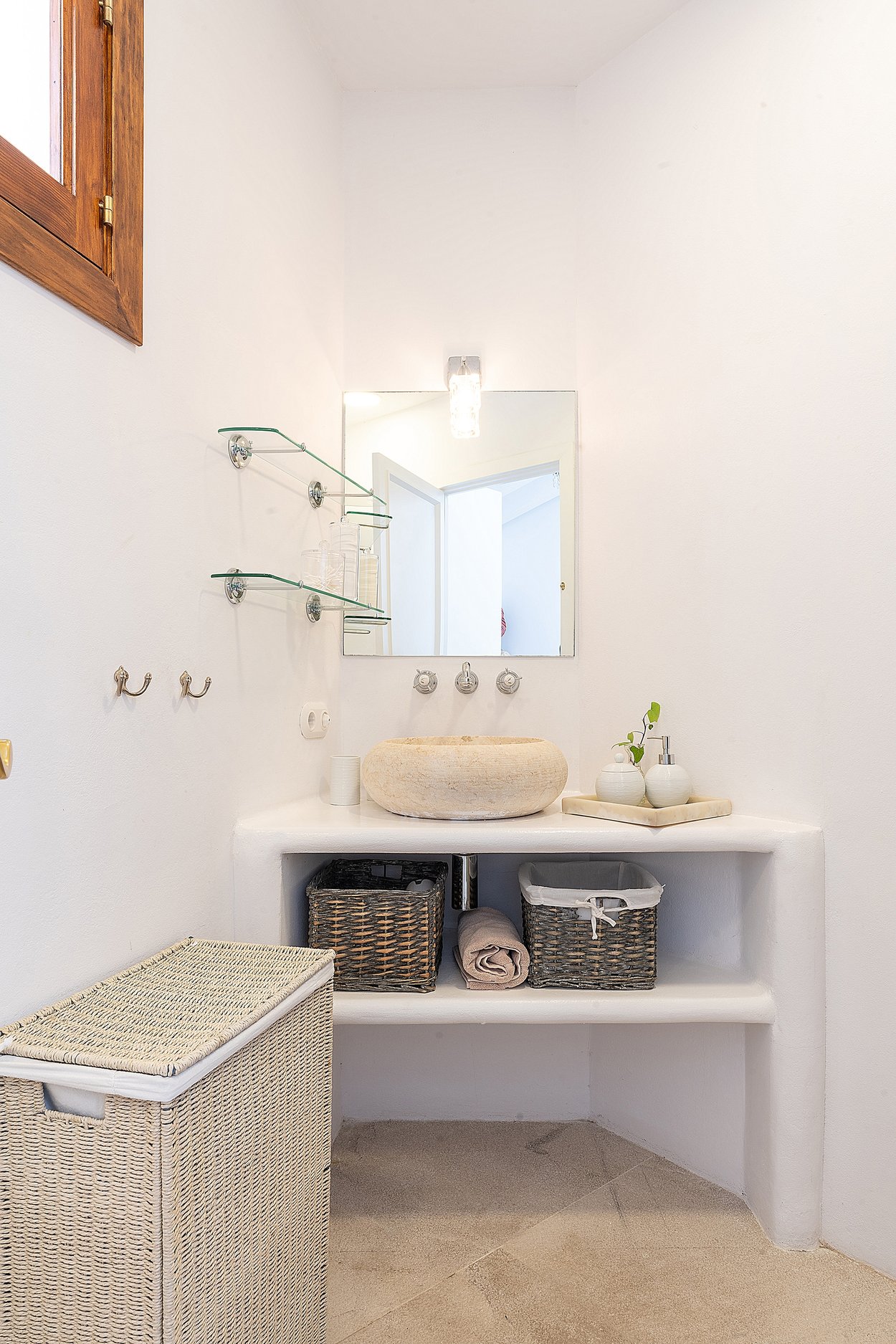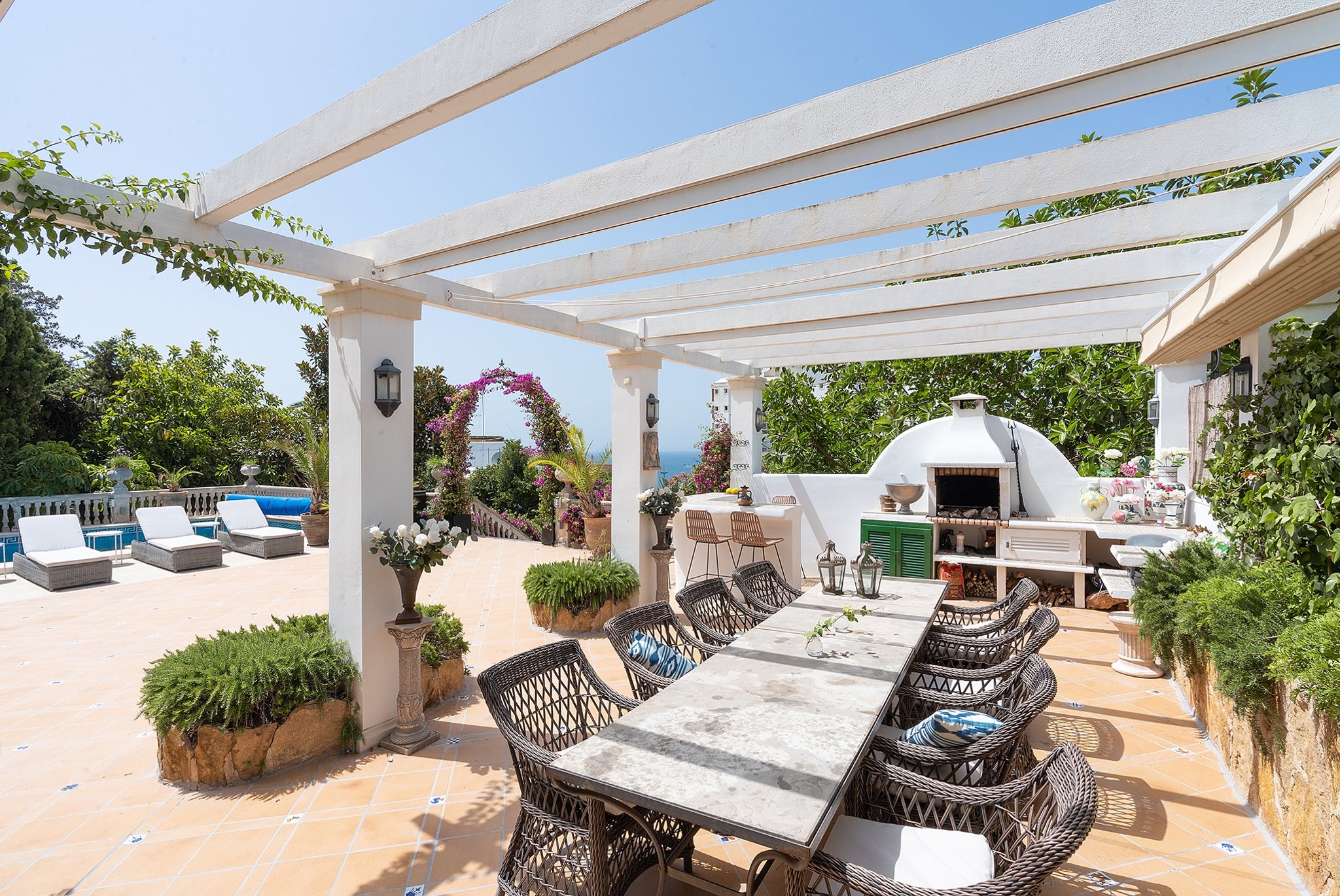 Intill poolen finner man en poolbyggnad med kombinerat sovrum och vardagsrum samt ett badrum. Från terrassen kan man sedan följa en trappa ner till en genuint charmig och sval vinkällare. Den härliga trädgården lockar med olika fruktträd och prunkande växter och blommor. På husets framsida inbjuder den uppvärmda saltvattenpoolen och den generösa terrassen med havsutsikt till avkoppling och umgänge, komplett med en uteköksanläggning.