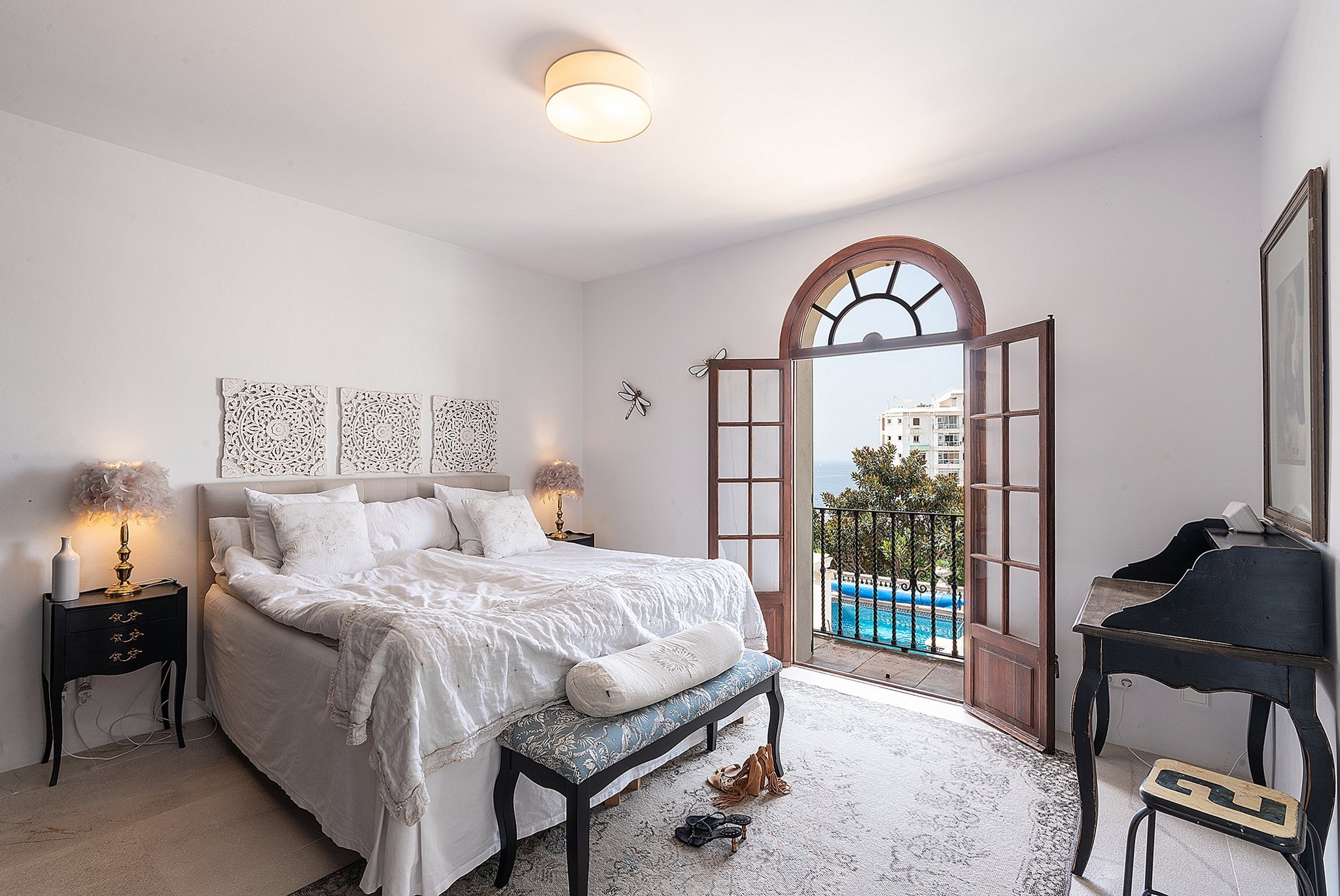 Boendeytan sträcker sig över imponerande 340 kvadratmeter fördelat på två våningsplan. På bottenvåningen välkomnas man av ett fullt utrustat och trivsamt kök, en vardagsrumsmiljö samt en matsal som pryds av en öppen spis. Här finner man även en gästtoalett. Samtliga rum på bottenvåningen har direkt utgång till terrassen som sträcker sig längs framsidan av huset samt till poolområdet. På övervåningen återfinns de fem sovrummen och tre badrummen, varav ett är en suit. Här finns även en liten extra vardagsrumsyta samt en rymlig walk-in-closet. Från tre av sovrummen och vardagsrummet har man tillgång till en fridfull bakgård, där man kan njuta av svalkande skugga under varma sommardagar. Dessutom finns det en tvättstuga för praktisk bekvämlighet. Från ett av sovrummen har man access till en stor terrass som vätter mot sydväst, varifrån man erbjuds en härlig havsutsikt.