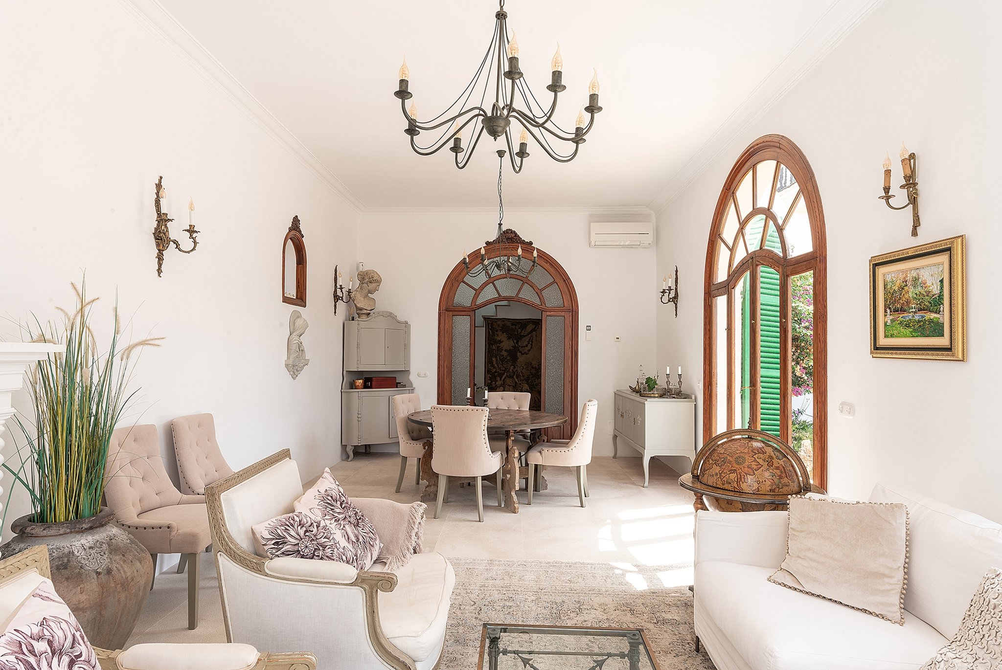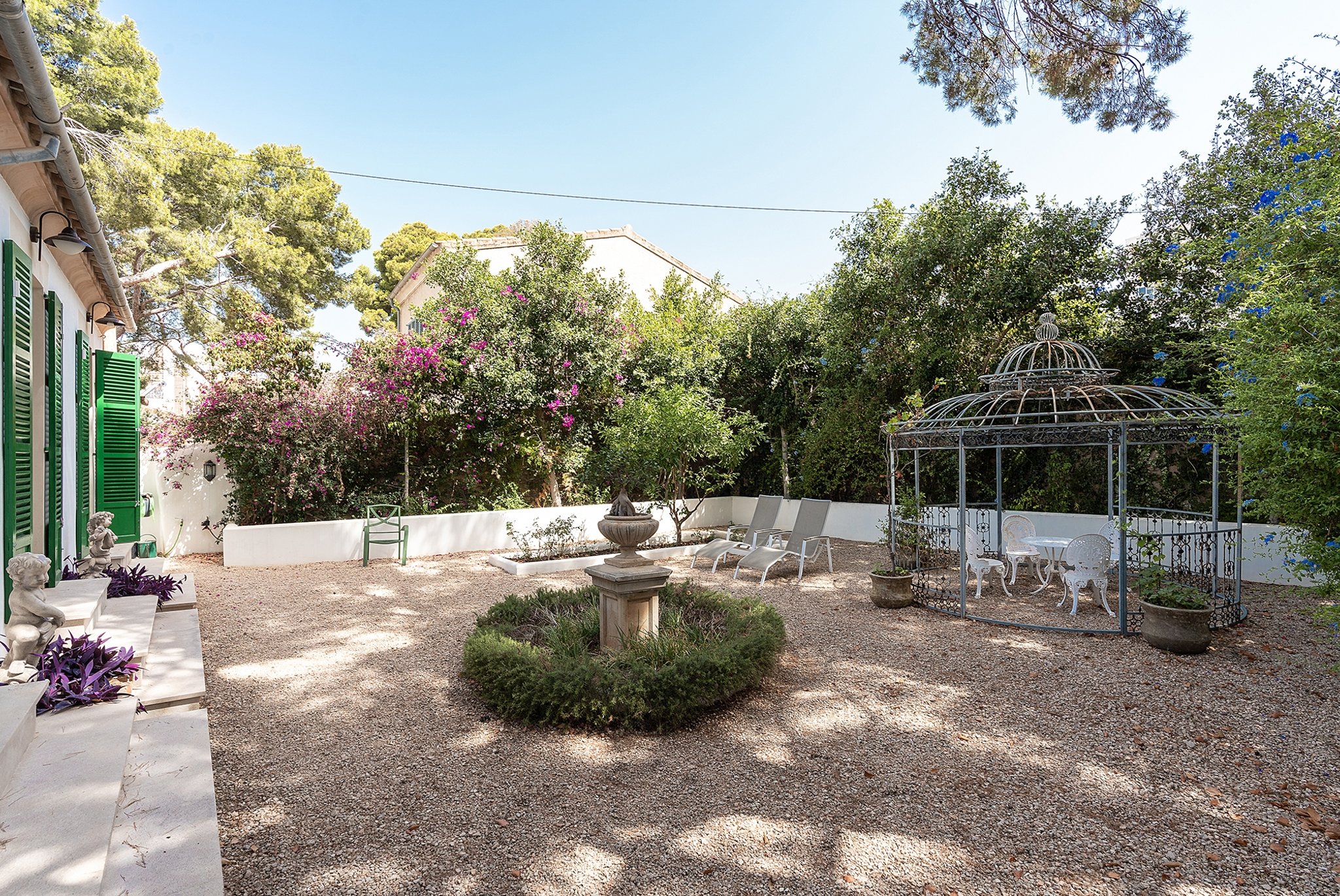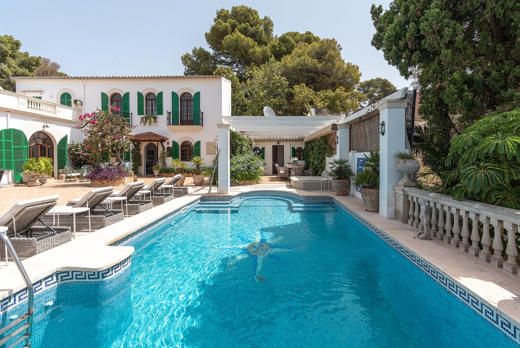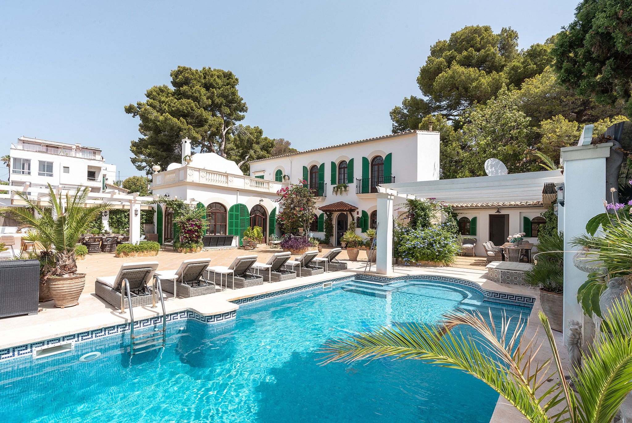 Denna unika och förtrollande villa är belägen bara några steg från den natursköna sandstranden i Cala Major, precis utanför Palma stad.Det magnifika huset, som har anor från 1920-talet, genomgick en omfattande renovering år 2018, där man varsamt bevarade antika och karaktärsfulla detaljer samtidigt som man tillförde moderna inslag. Den oemotståndligt charmiga villan nås genom en privat grind, där man färdas längs en allé omgiven av frodiga växter och vackra fruktträd, vilket leder fram till parkeringsområdet med plats för upp till fem bilar. Dessutom finns det en elegant garagebyggnad. Villan kan nås genom att man promenerar uppför en vacker stentrappa.