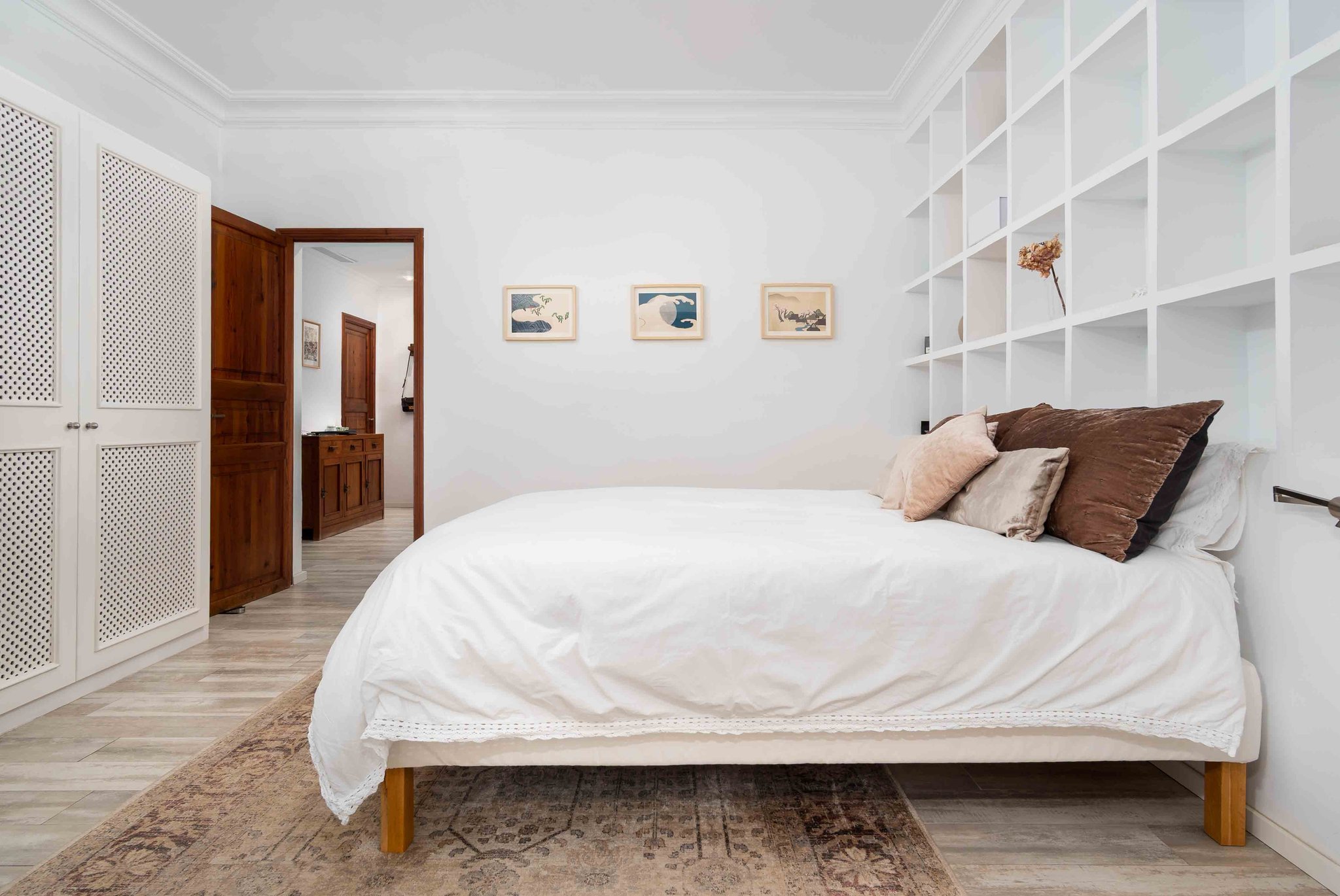Bostaden har två sovrum och två badrum, där ett badrum är en suite till master bedroom, som också har inbyggda garderober.