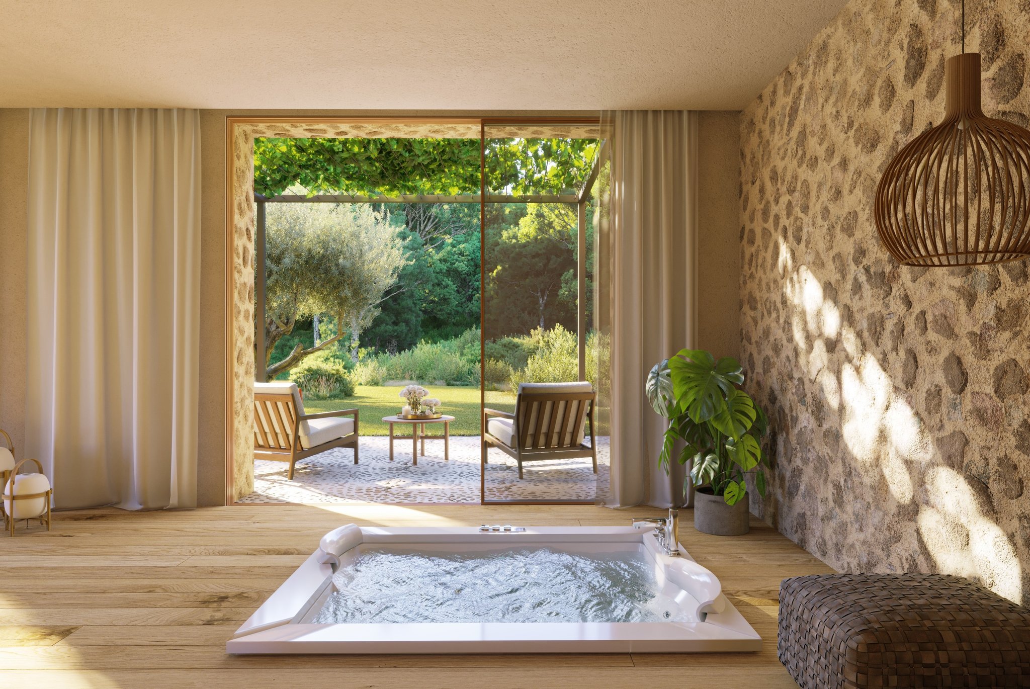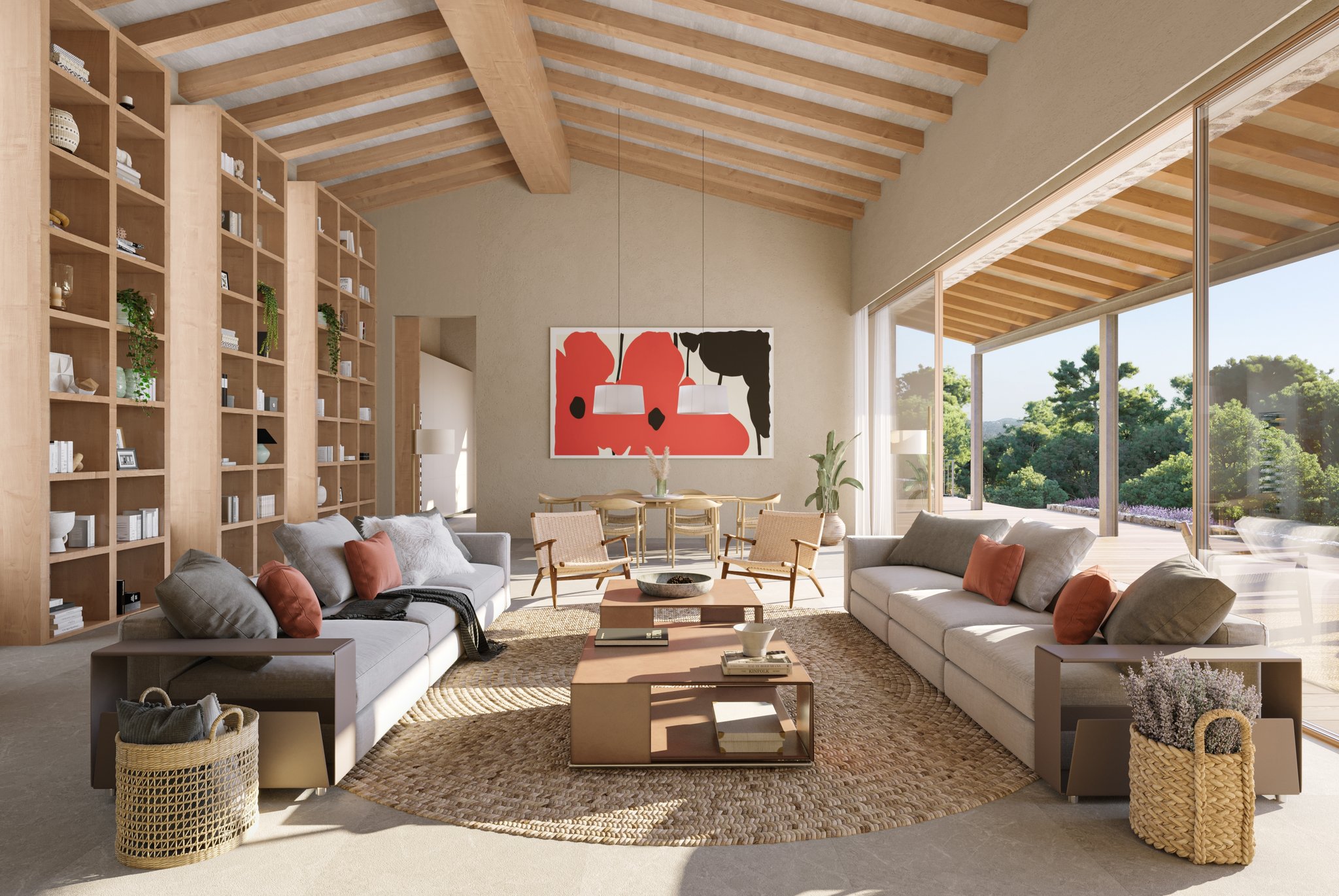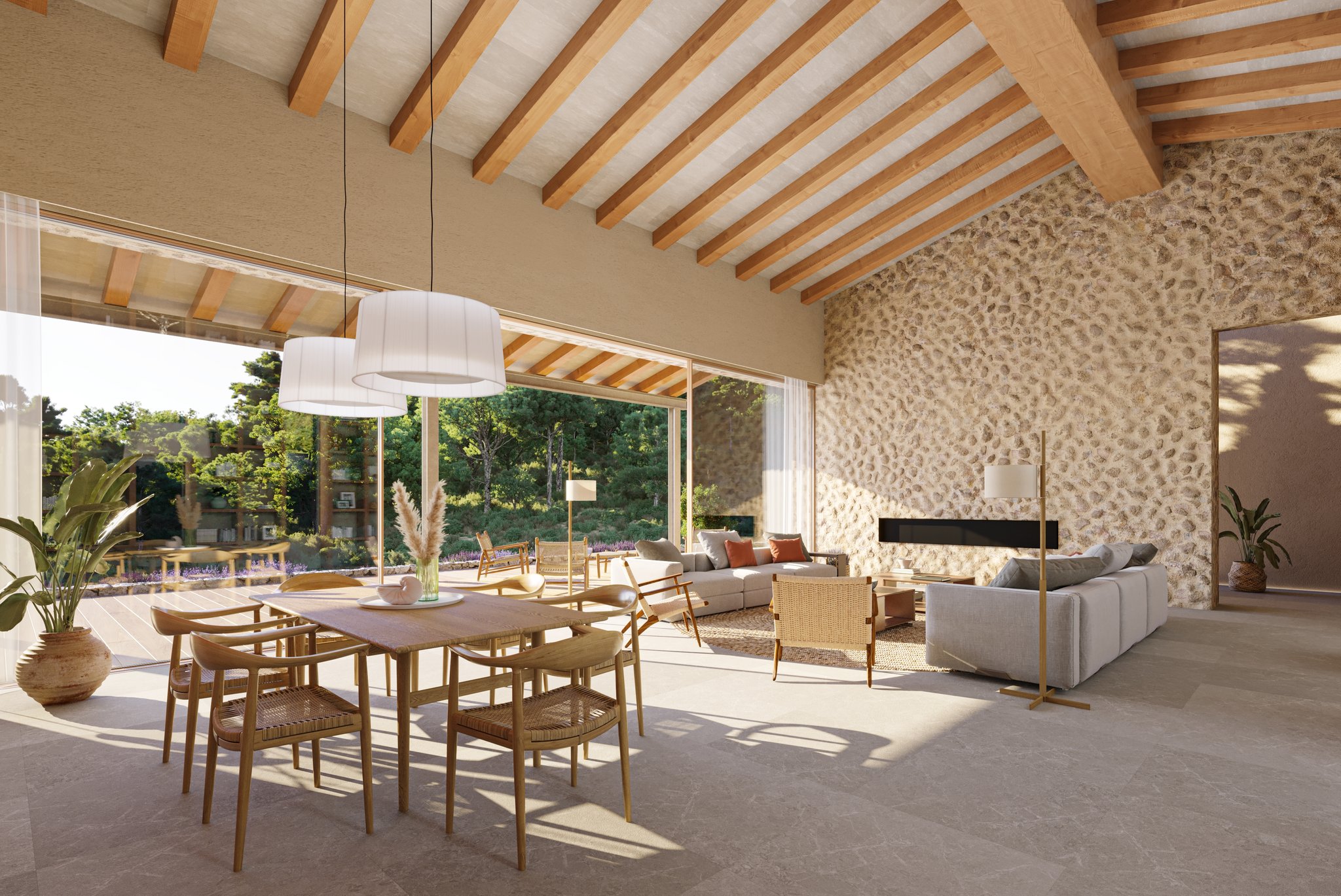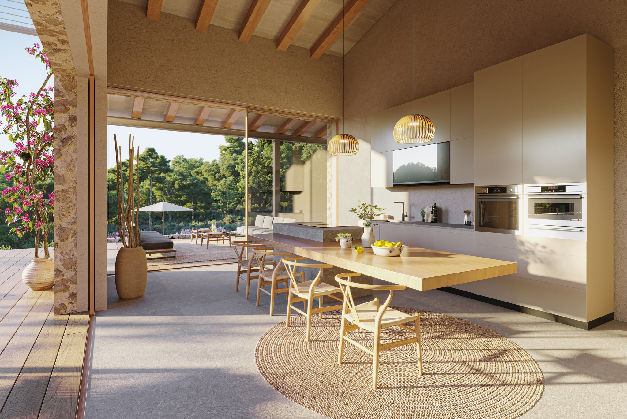 I högra delen av huset möts du av ett stort vardagsrum med stor eldstad, matdel och modernt och fullt utrustat kök. Från köket når du din frukosterrass, som vätter mot öst. Från vardagsrummet når du den största soliga terrassen som också bjuder in till poolområdet med infinitypool och vacker utsikt.