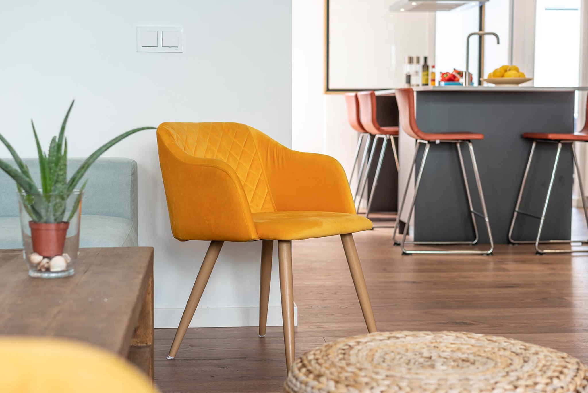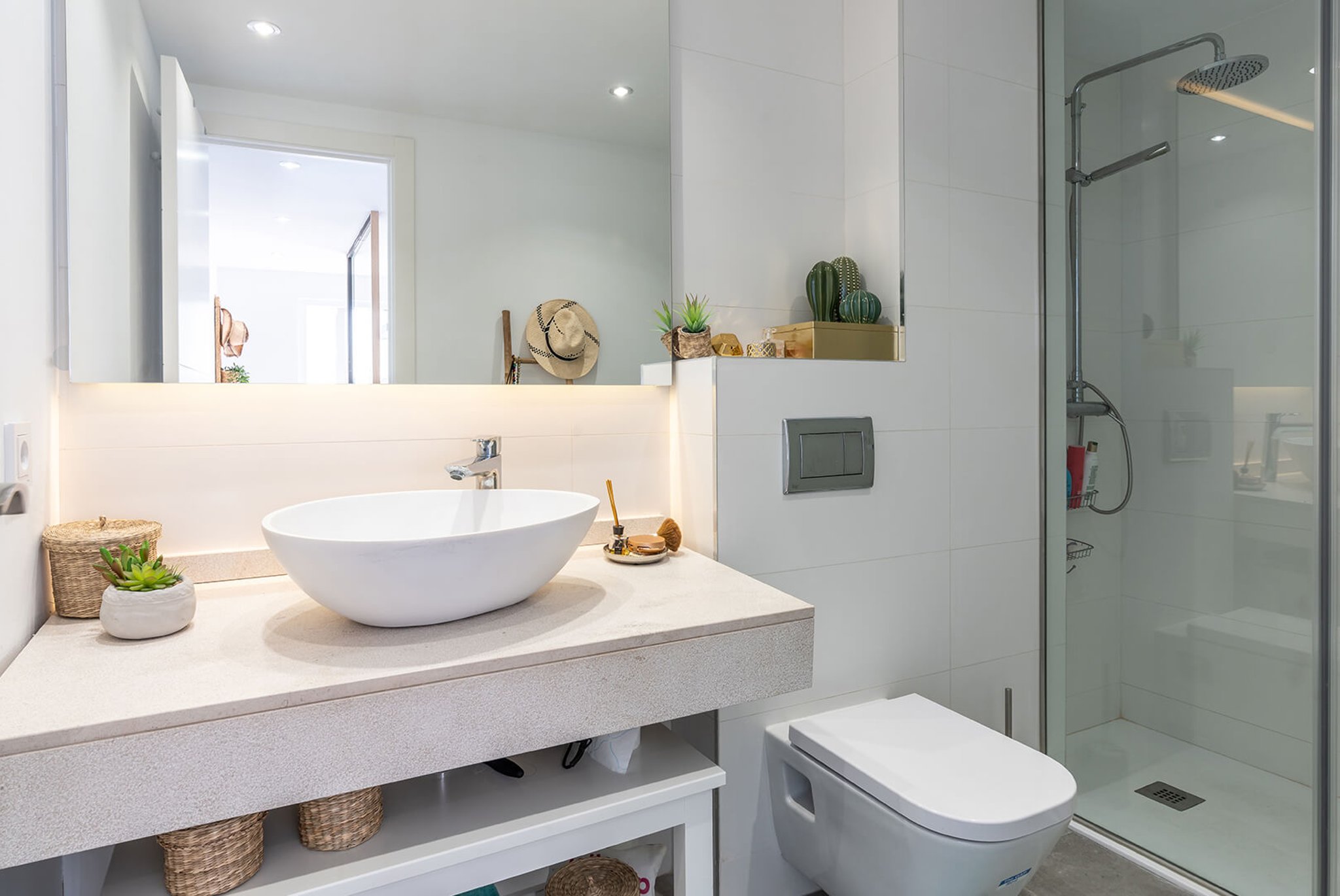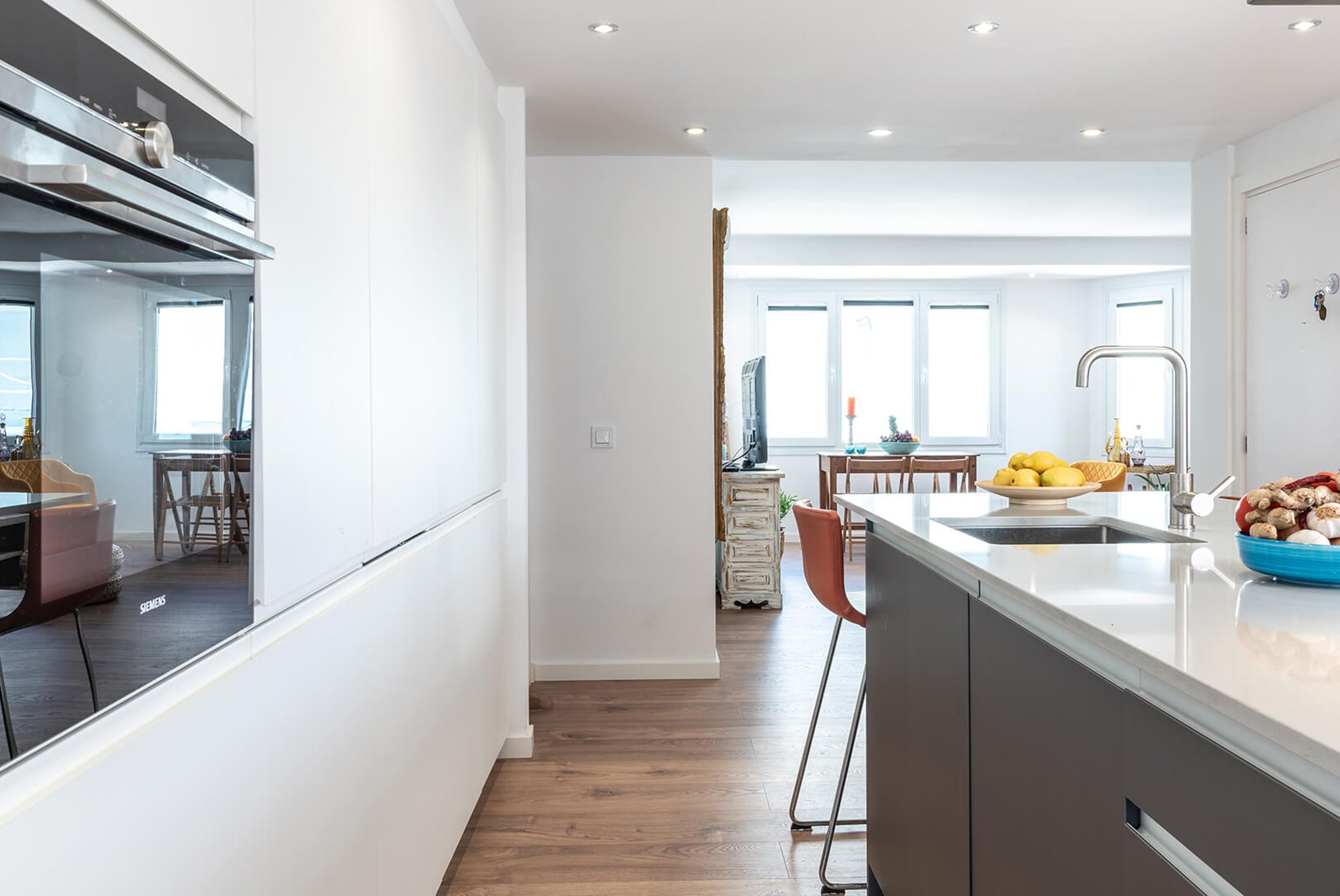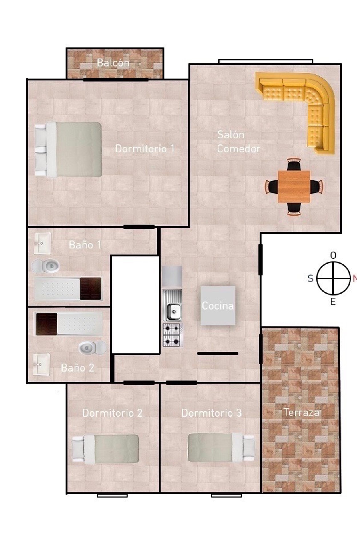 Från entrén kommer man direkt in i det öppna vardagsrummet och köket (köksinredningen går i vitt och vitvarorna kommer från Siemens). Från vardagsrummet når man sedan de tre sovrummen. Master sovrummet ligger separat med eget en-suite badrum och med utgång till en liten balkong på 2 m2 med havsglimt, de övriga två sovrummen ligger nära det andra badrummet. Från köket och vardagsrummet når man också terrassen på cirka 9 m2, där man kan grilla och njuta av förmiddagssolen.