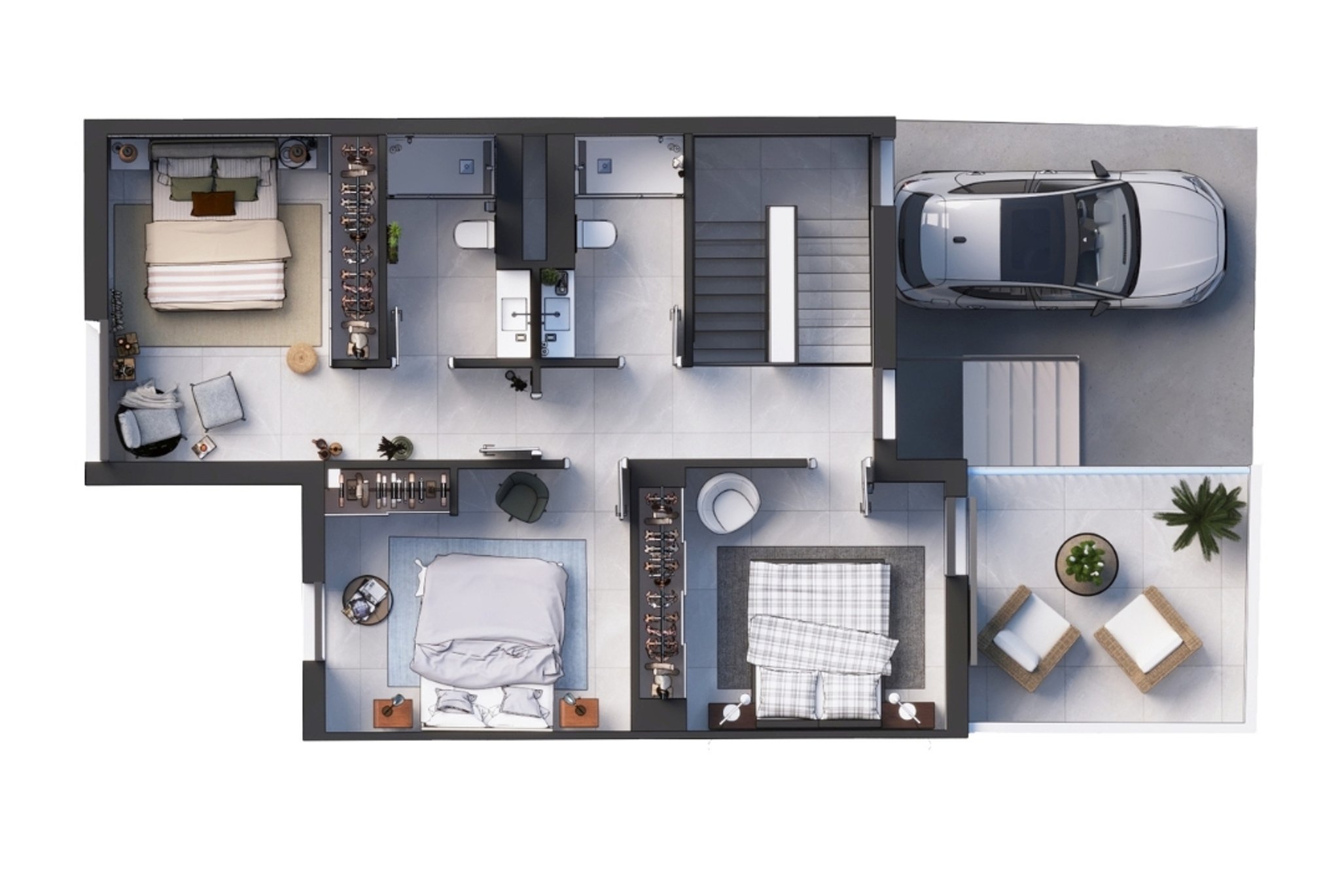 Varje hem har en boyta på mellan 142 och 158 m2, med ett ljust och rymligt vardagsrum/matplats, ett fullt utrustat kök med avancerade Siemens-apparater och stora, sydvästvända terrasser som sträcker sig in i privata trädgårdar. På bottenvåningen finns en välkomnande hall med gott om förvaring, en gästtoalett och tillgång till en generös terrass som inbjuder naturligt ljus in i vardagsrummet. På övervåningen finns tre sovrum och två badrum (ett en-suite) som erbjuder komfort och avskildhet, med ett sovrum som vetter mot en 12 m2 stor balkong.