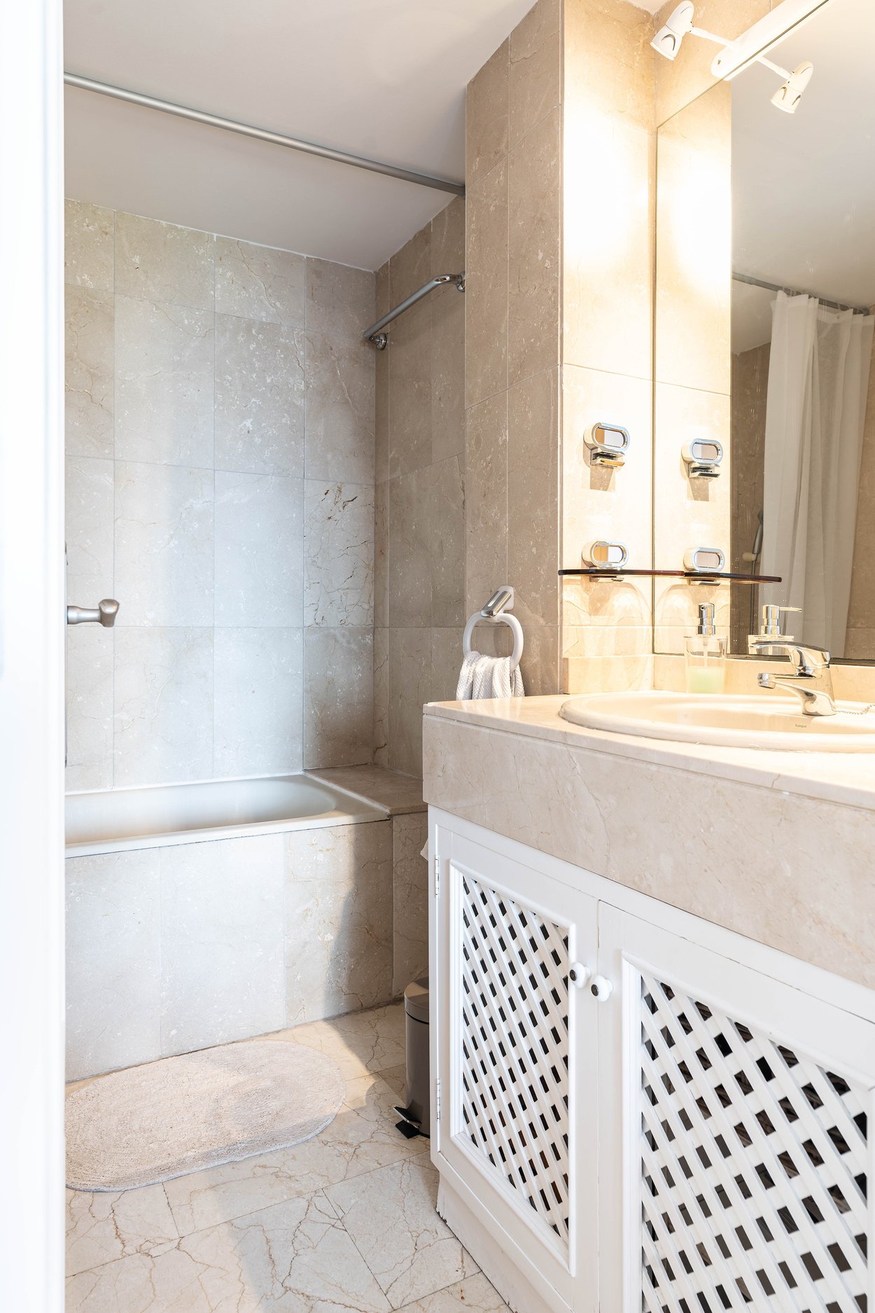 Lägenheten har en boyta på 72 m², fördelad på två sovrum och två badrum, varav ett är en-suite. Det luftiga vardagsrummet med matsalsdel har öppen spis och utgång till terrassen, och det renoverade köket är i öppen planlösning. Den rymliga terrassen på 19 m² bjuder på en oslagbar panoramautsikt över havet. Med bekvämligheter som luftkonditionering, eleganta marmorgolv, modern utrustning och tillgång till en gemensam pool, är denna lägenhet både bekväm och välkomnande – en tidlös och vacker bostad. Lägenheten ingår i ett hotellkomplex som erbjuder både inomhus- och utomhuspooler samt direkt tillgång till havet. Egen garageplats ingår i priset, och byggnaden är försedd med hiss.