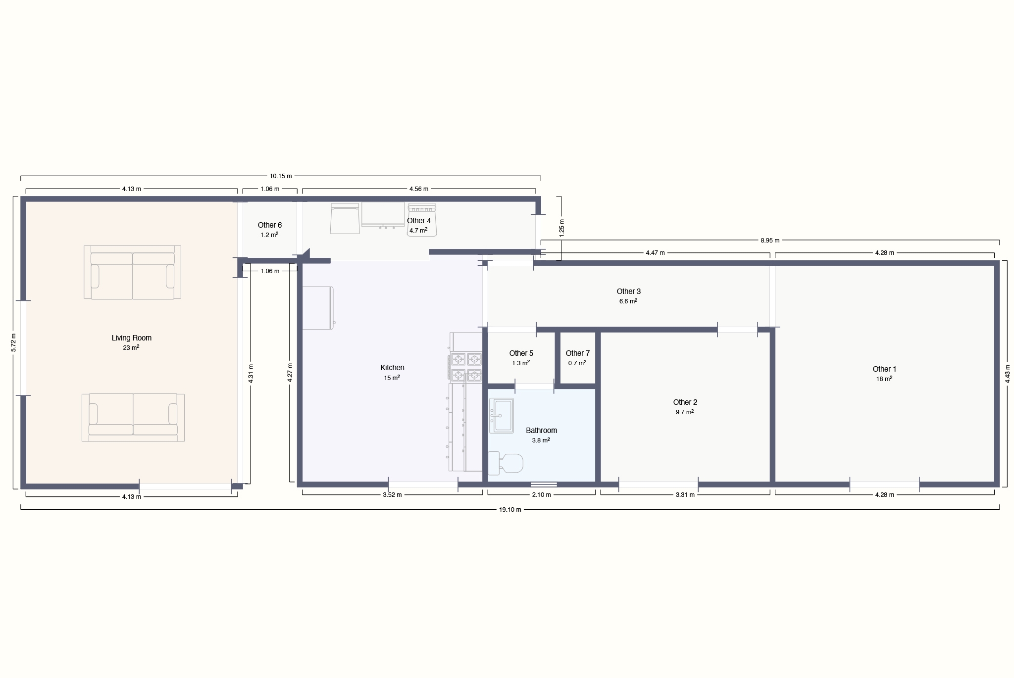 Boligen har rikelig med naturlig lys gjennom hele dagen, noe som skaper en lys og innbydende atmosfære i alle rom. Planløsningen inkluderer en elegant entré, en romslig stue med peis, et åpent kjøkken, to store soverom og ett bad. Store vinduer slipper inn mye dagslys og forsterker romfølelsen i hele leiligheten.